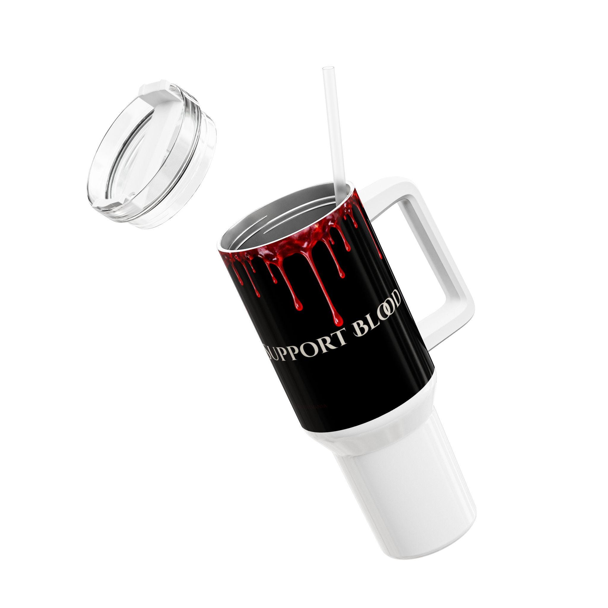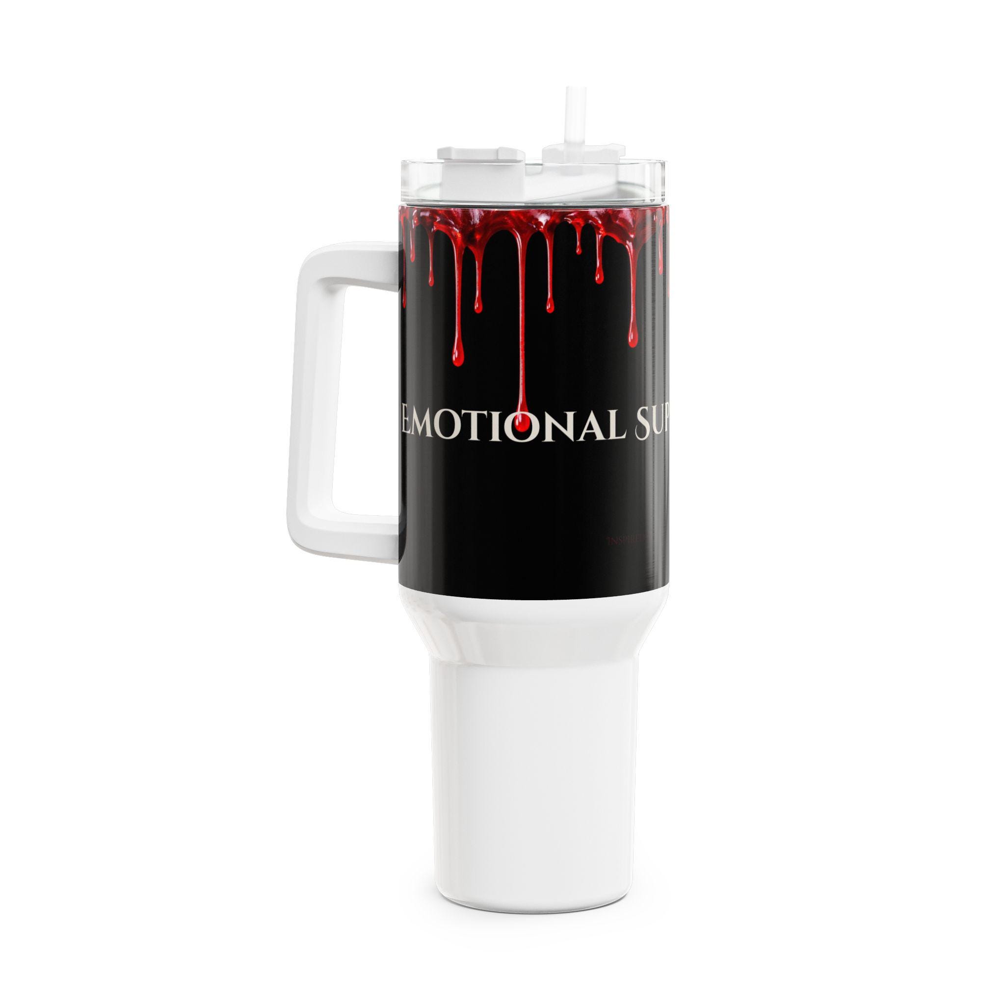 This 40oz insulated tumbler brings bold attitude to every sip. The glossy ORCA-coated exterior showcases high-contrast artwork with deep blacks and vivid red drips that look like fresh paint—striking against the sleek stainless-steel body. Double-wall vacuum insulation locks temperature in so hot coffee stays warm and iced drinks stay cold for hours. A rubber-sealed, clear push-down lid and included straw make it easy to drink on the go while minimizing spills. Durable yet lightweight, it fits most cup holders and slips into a commuter’s routine or a long day at a desk. Hand wash recommended to keep the vibrant print looking crisp. Whether used during late-night study sessions, long drives, or as a daily reminder to feel everything fully, this tumbler carries both function and fierce style.