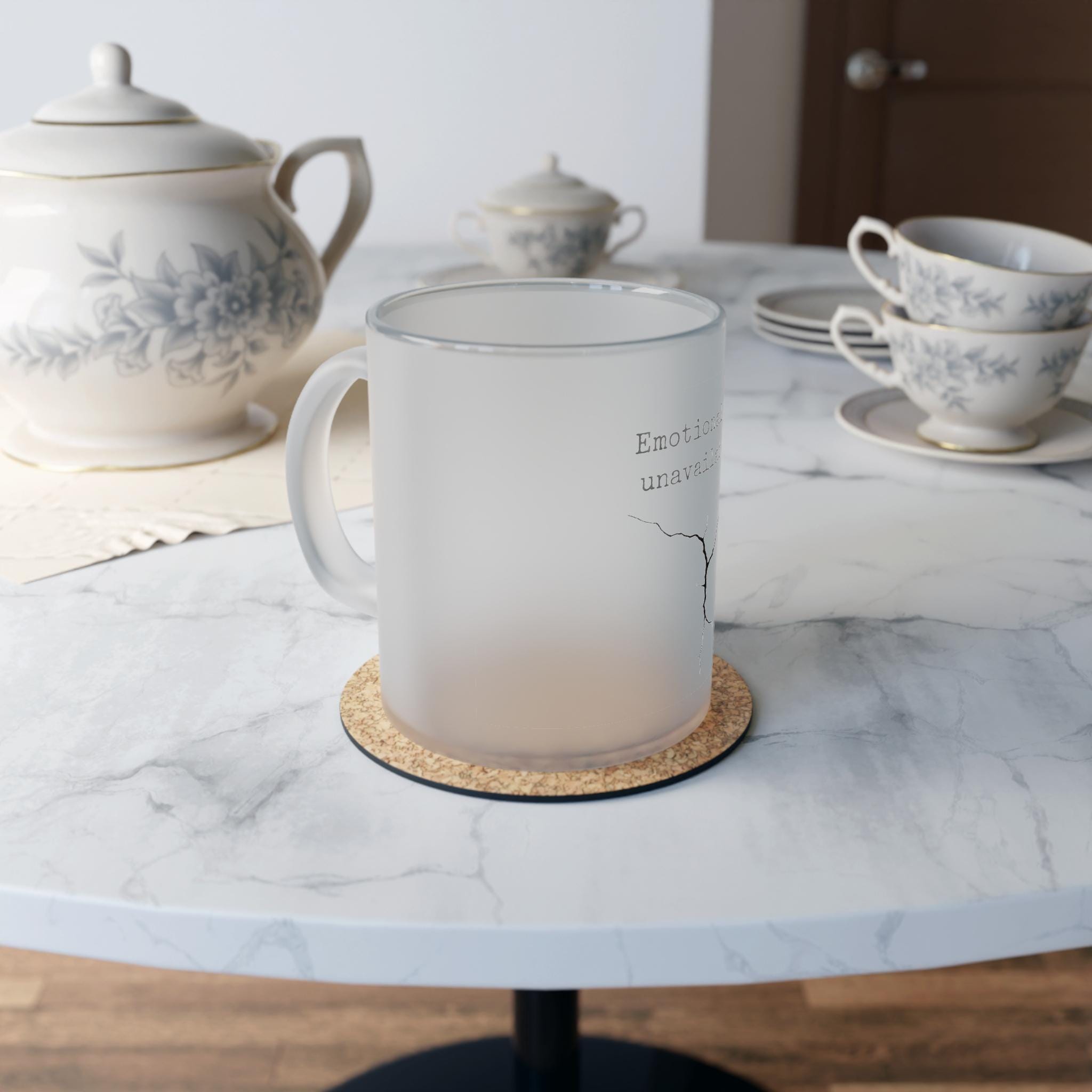 Minimalist frosted glass coffee mug – “Emotionally unavailable.”