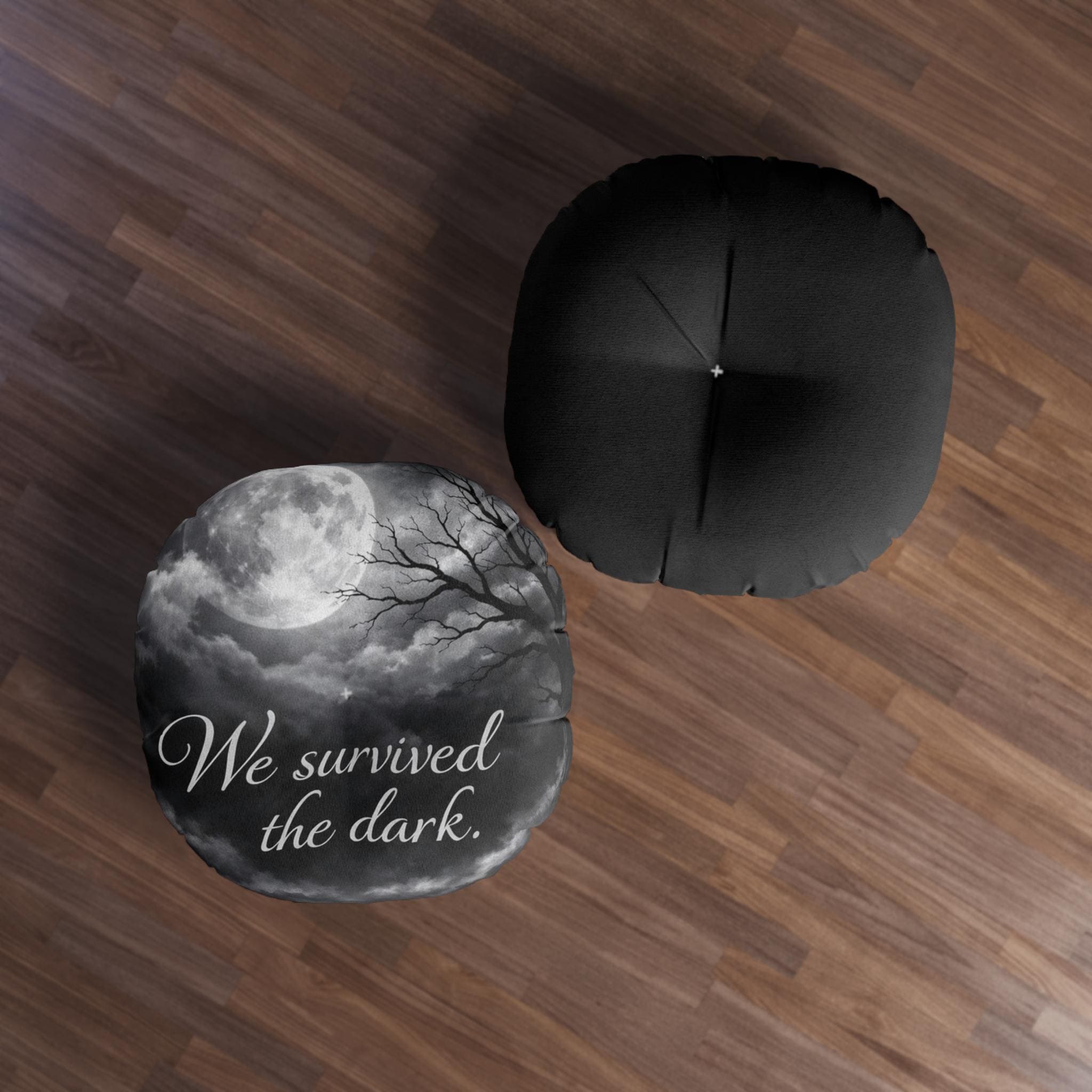 A round tufted floor pillow that brings quiet, contemplative mood into any room. The soft yet resilient polyester shell and filling hold shape while offering cushiony support for sitting or lounging. Double-sided printing keeps the back a deep, grounding black that complements moody decor. Choose between two sizes to create a tucked reading nook, a low seating circle for friends, or a dramatic accent on hardwood floors or rugs.