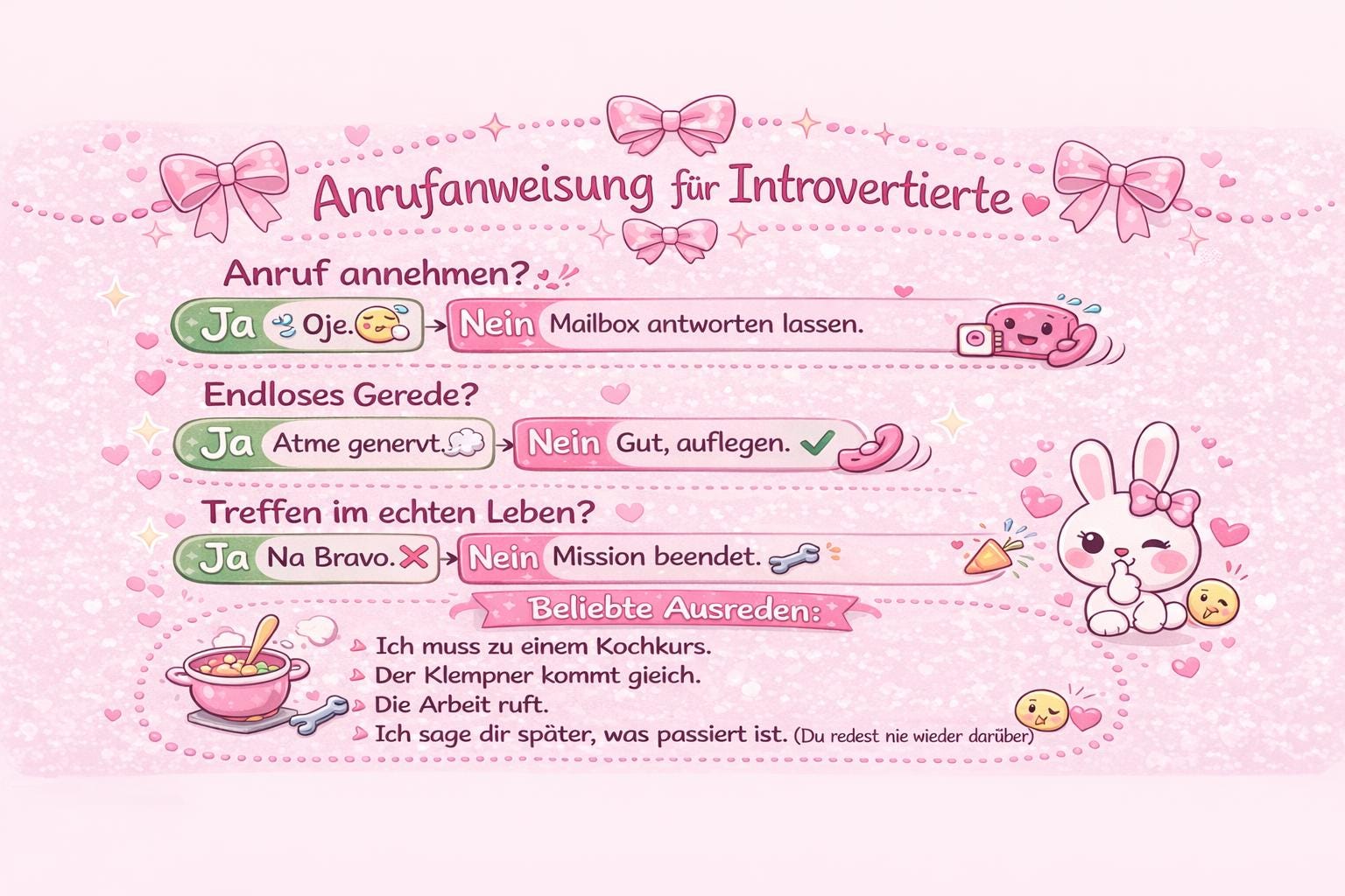 Cute kawaii design, soft pastel colors – and a humorous “call flowchart” that explains how to charmingly avoid any form of human interaction.