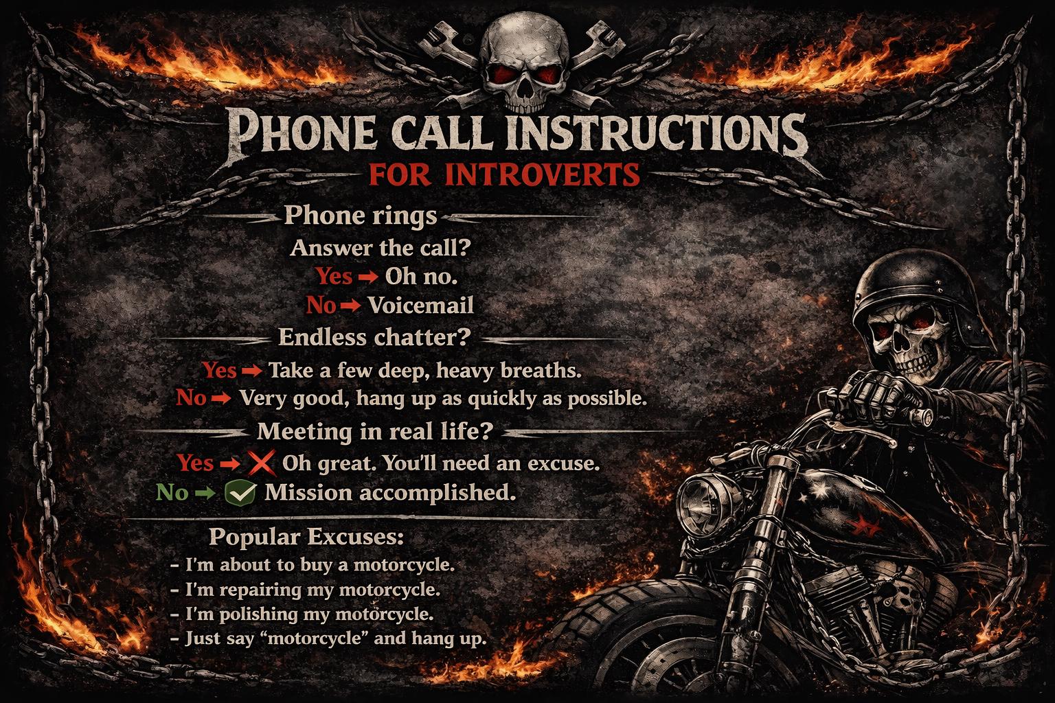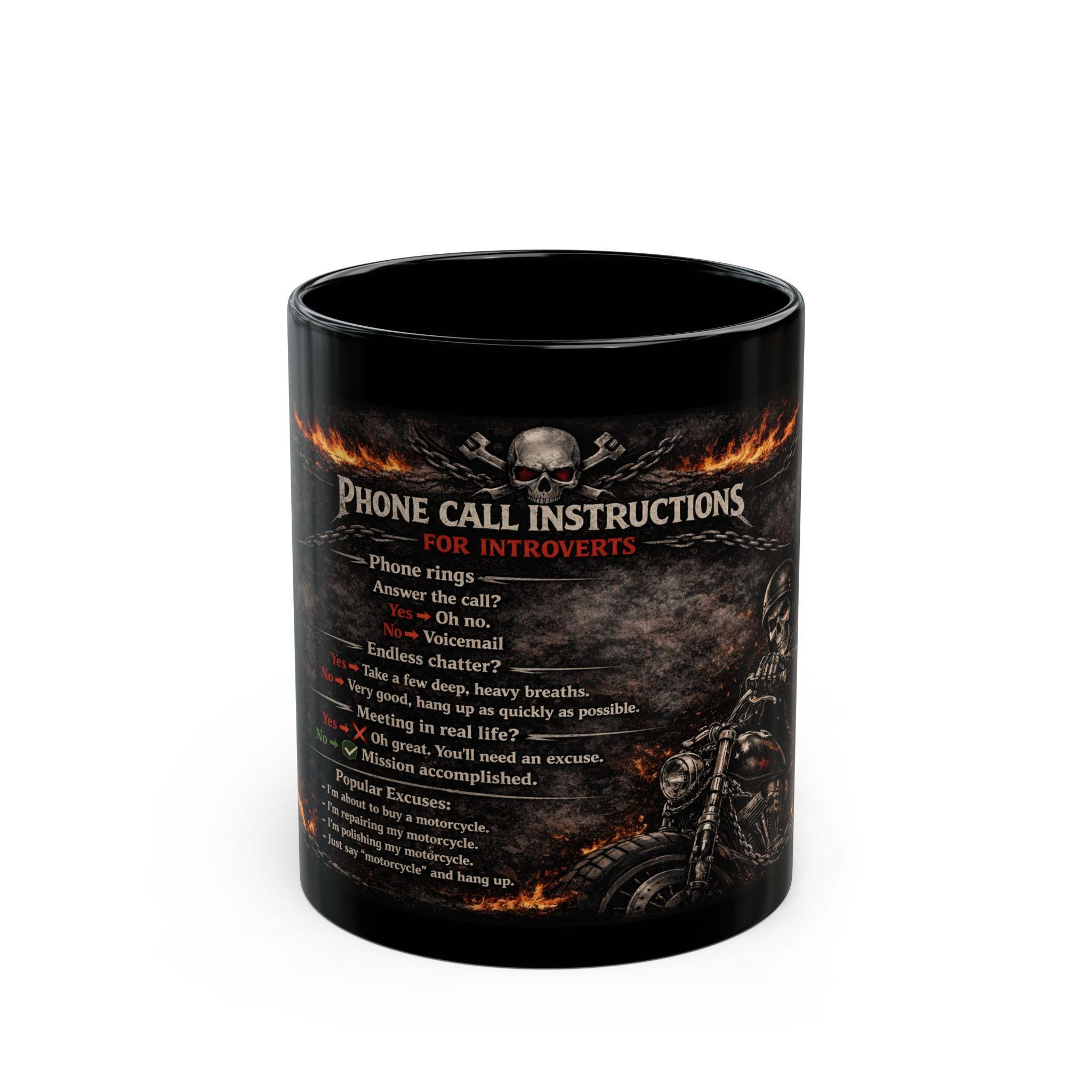 This hardcore biker-style flowchart mug shows exactly how an introvert survives incoming calls — with sarcasm, excuses, and just a touch of doom.