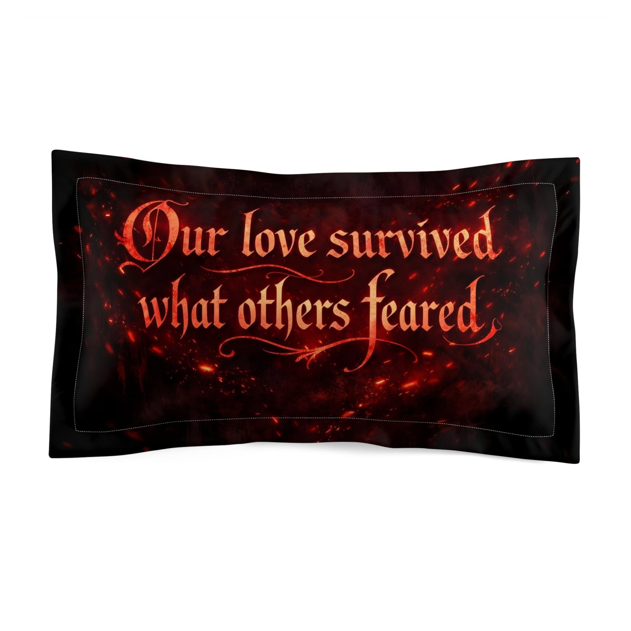 This rectangular microfiber pillow sham carries a moody, heartfelt message—"Our love survived what others feared"—set against a smoldering, ember-like background. The brushed microfiber surface feels soft and lightweight to the touch while keeping the print sharp and vivid. It slips on and off easily with a double-layer envelope closure and a cream-colored back, so you can change covers without fuss. Sized to fit standard pillow inserts (insert not included), this sham adds a quietly dramatic, emotional accent to a bedroom, reading nook, or cozy corner. It settles into low, intimate light and quiet evenings—perfect for someone who leans into romantic intensity and the comfort of shared resilience.