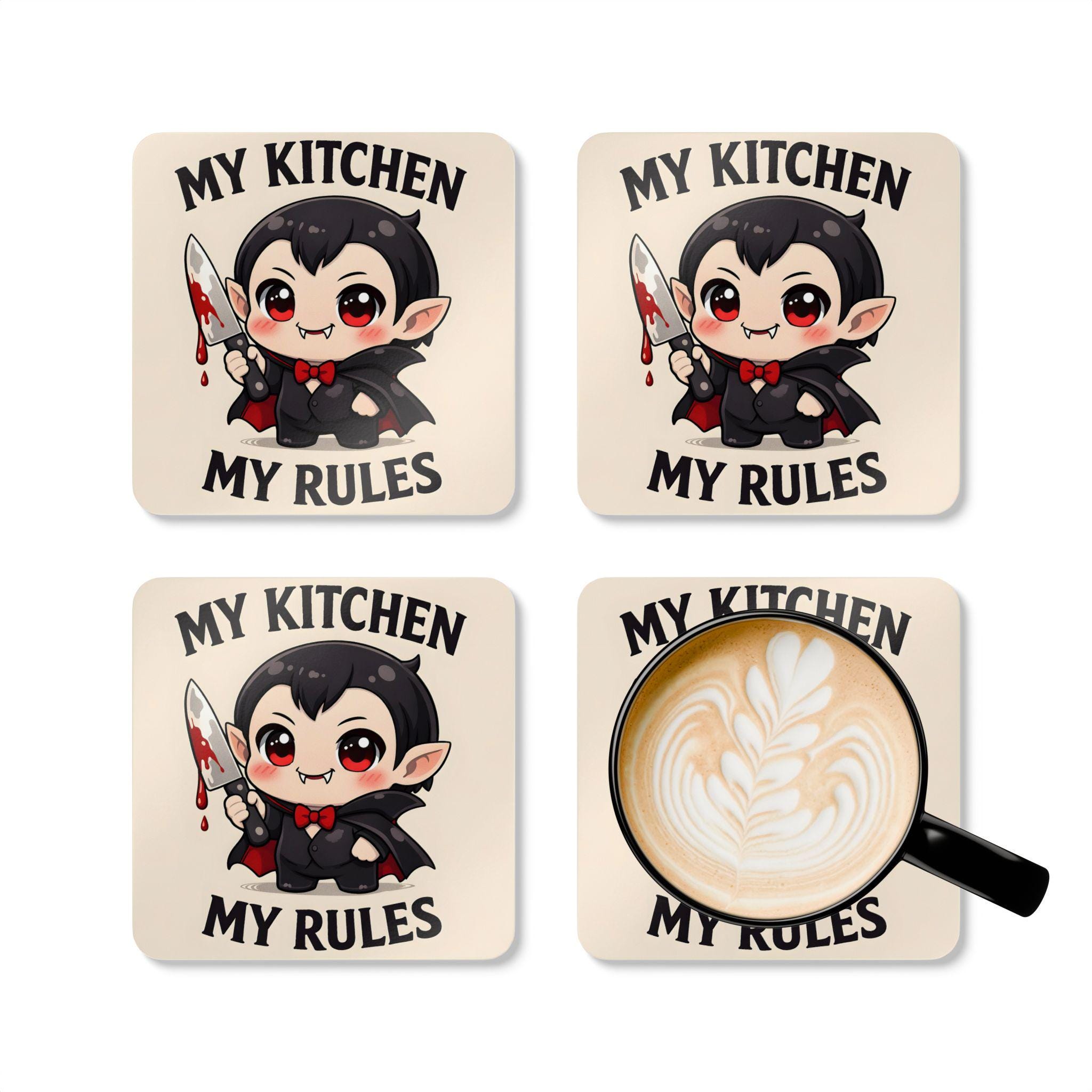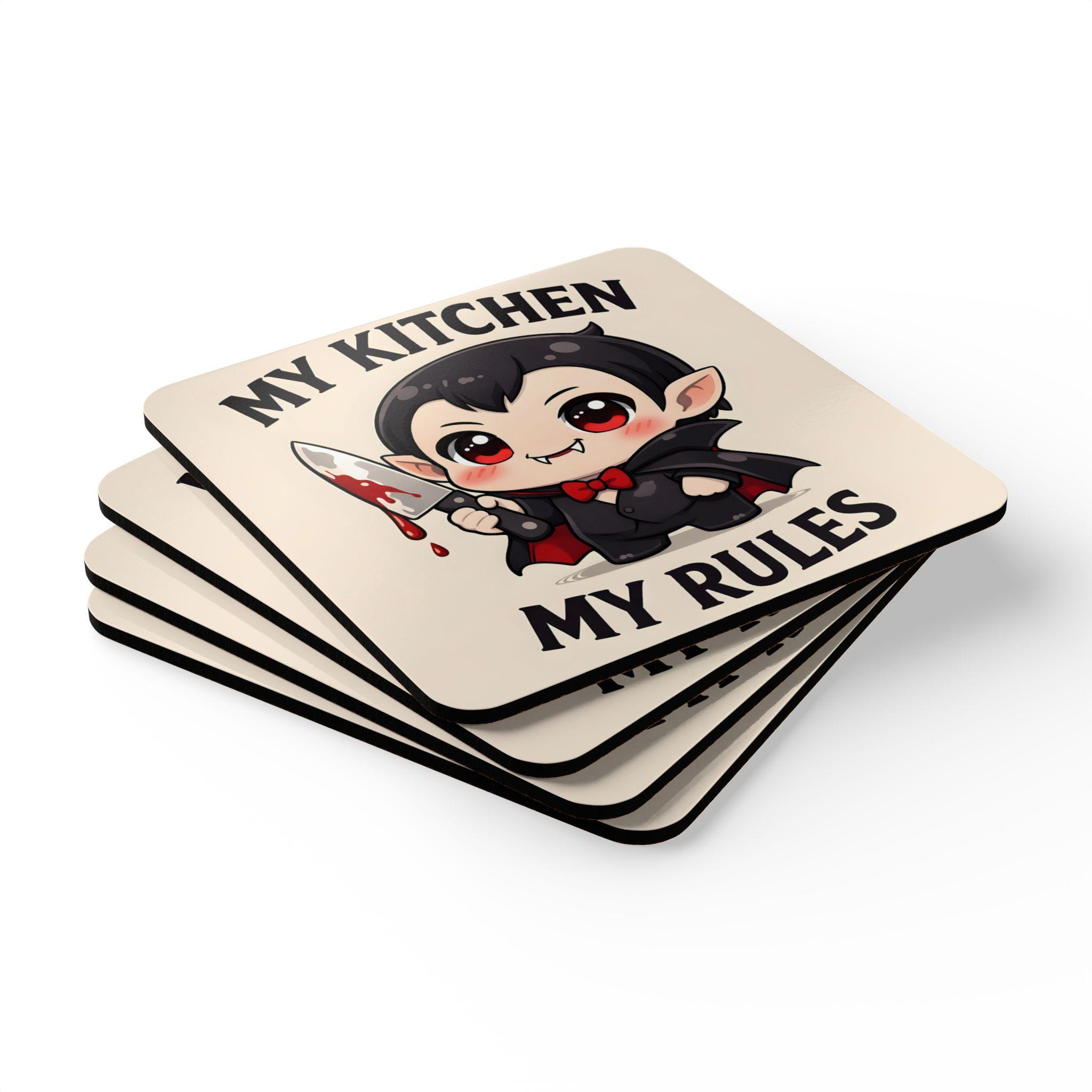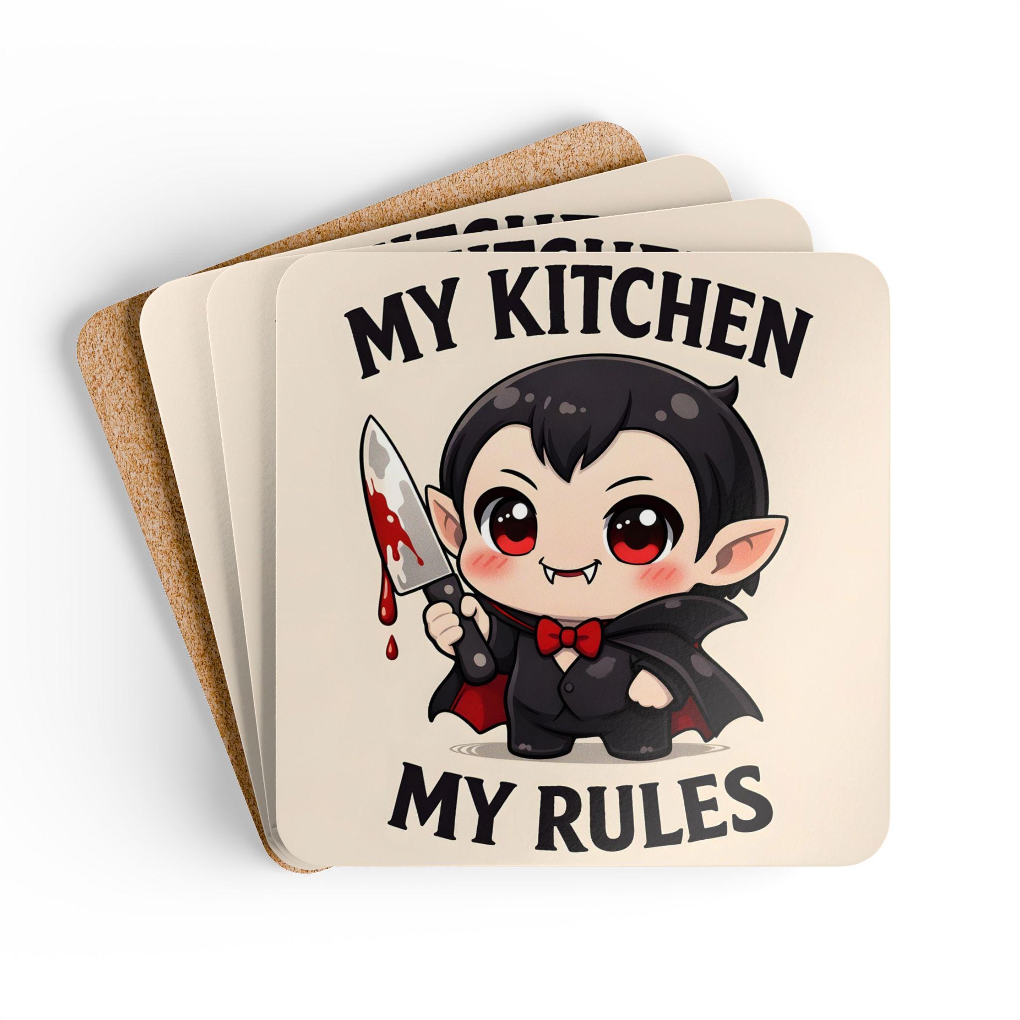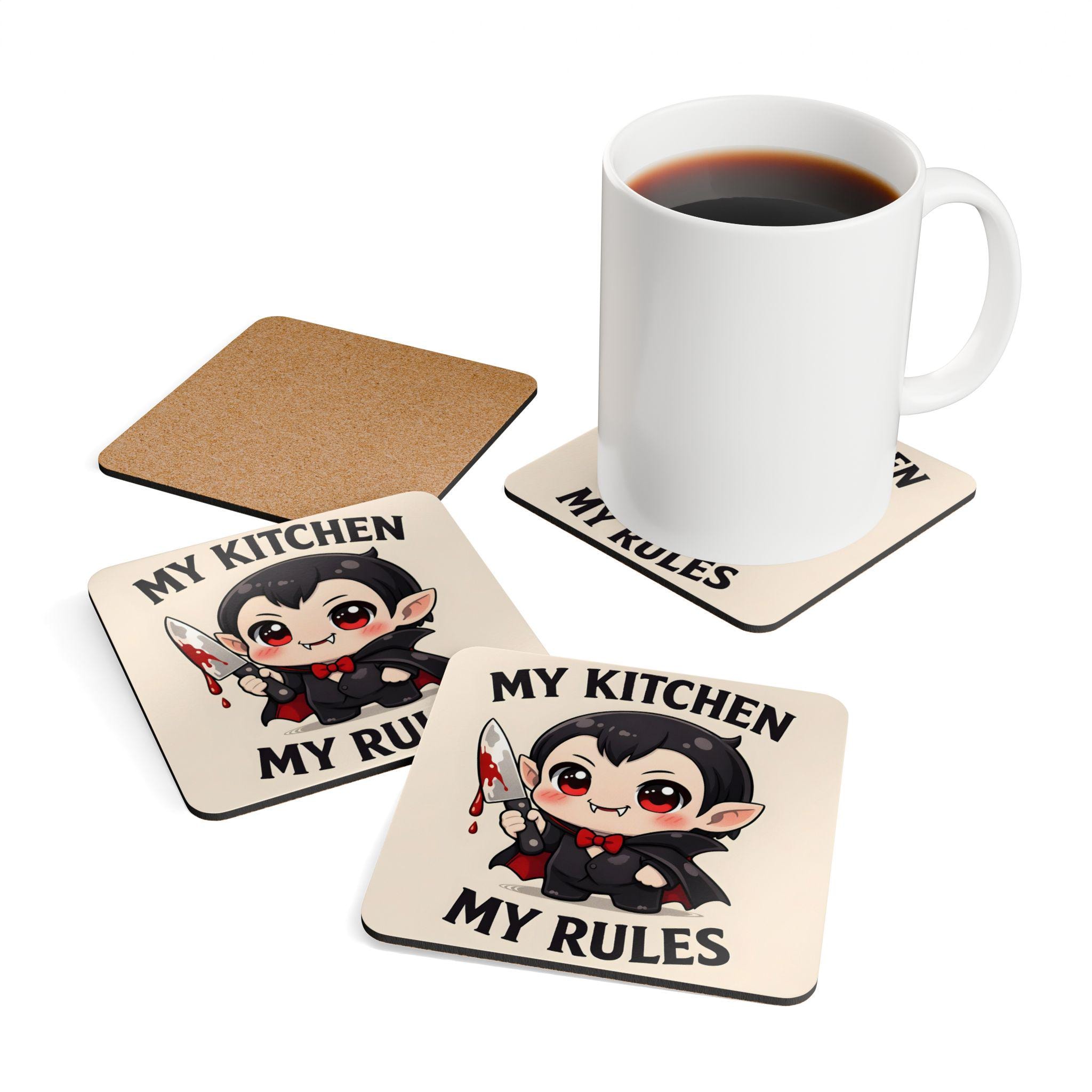 These cork-backed coasters bring playful spooky charm to everyday spills. Each 3.75" square coaster features a glossy, full-color print of a cheeky chibi vampire holding a dripping knife with the bold caption “MY KITCHEN MY RULES.” The high-gloss MDF top makes the artwork pop with vibrant, crisp colors, while the natural cork backing grips surfaces and protects tabletops from rings and light heat. Slim (0.16") and sold as a set of four, they stack neatly in kitchen drawers or on coffee tables, ready for movie nights, Halloween gatherings, or any day you want to add a wink of dark humor to your home.