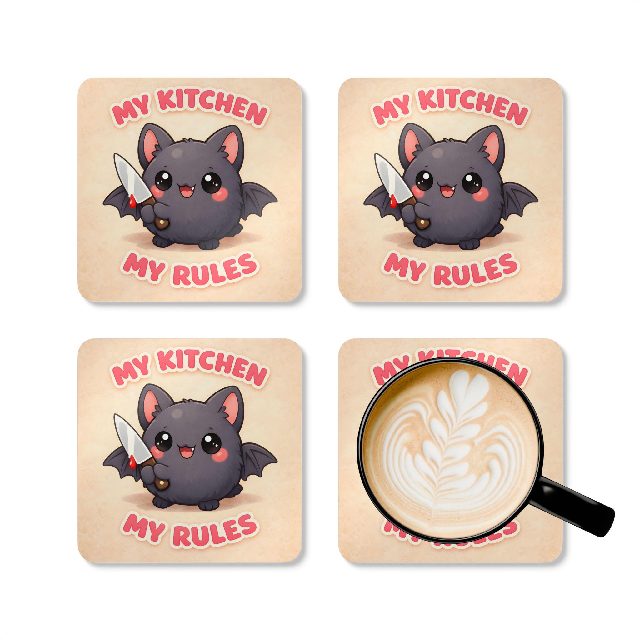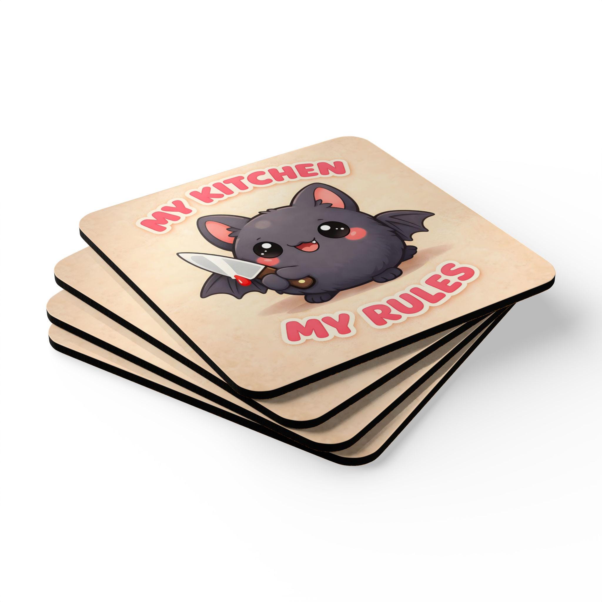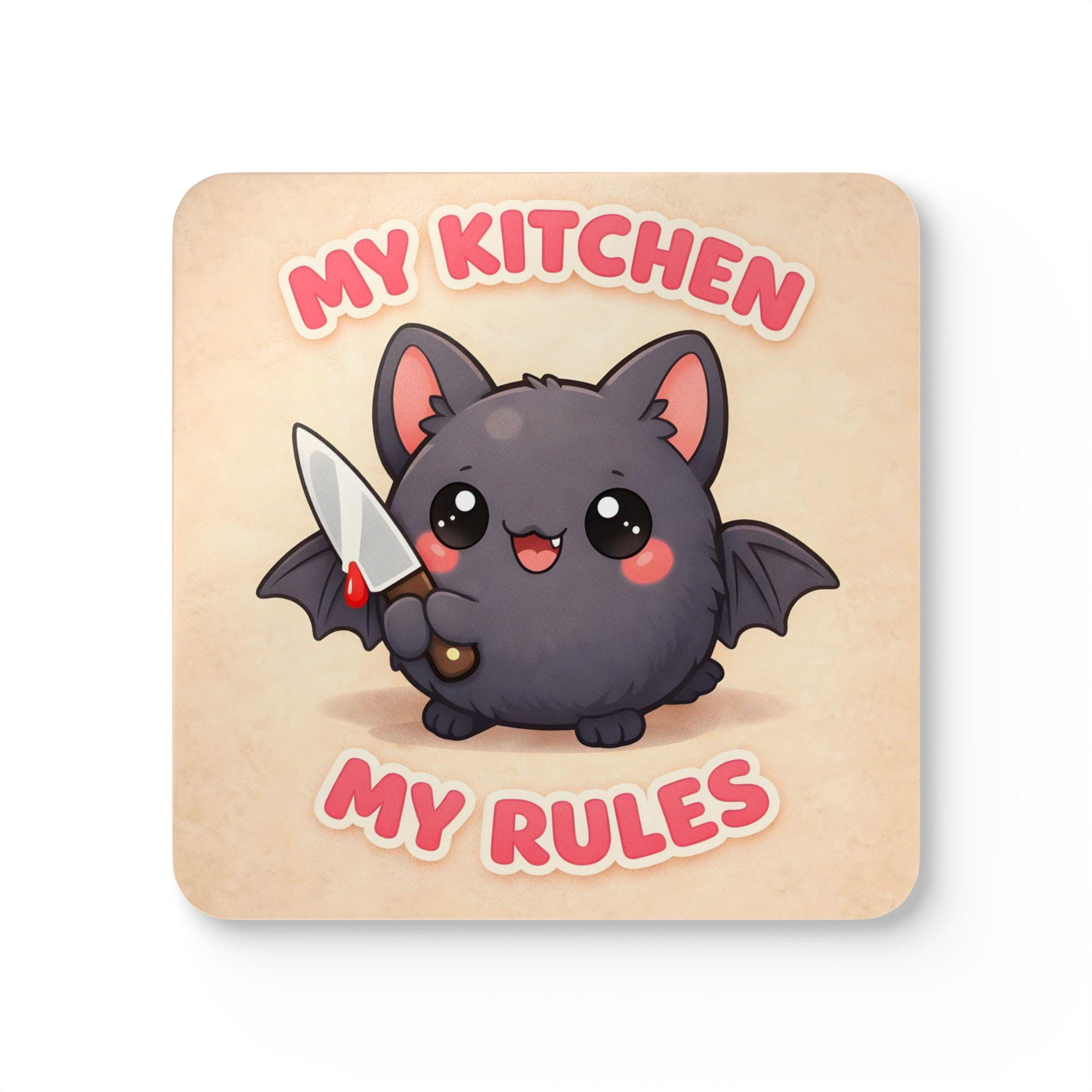 Bring a playful, slightly mischievous charm to your kitchen with these glossy cork-backed coasters. Each 3.75" square features bright, crisp printing on a durable high-gloss MDF top, showing off a cute bat character holding a knife with the cheeky line “My Kitchen My Rules.” The cork backing grips surfaces and protects tabletops from moisture and heat, while the slim 0.16" profile keeps them unobtrusive on crowded counters. Set of four — lively accents that add personality to casual dinners, late-night snacks, or coffee breaks when you want a little humor with your hospitality.