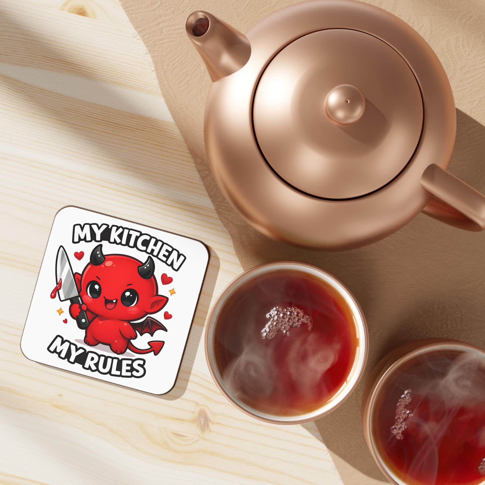 Tiny mischief, big personality. This hardboard coaster brings a cheeky spark to countertops with a glossy, full-color print of a playful red imp clutching a knife and grinning beneath the words “My Kitchen My Rules.” It settles into busy kitchens, late-night snack raids, and cozy coffee corners, catching drips and protecting surfaces while serving up a wink to anyone who spots it. The vibrant illustration reads like a private joke between housemates, a bold little accent that leans into dark-humor charm without taking itself too seriously. Lightweight and sturdy, it slips under mugs and glasses easily and pairs well with eclectic, quirky, or horror-themed decor for casual gatherings, movie nights, or everyday coffee routines.