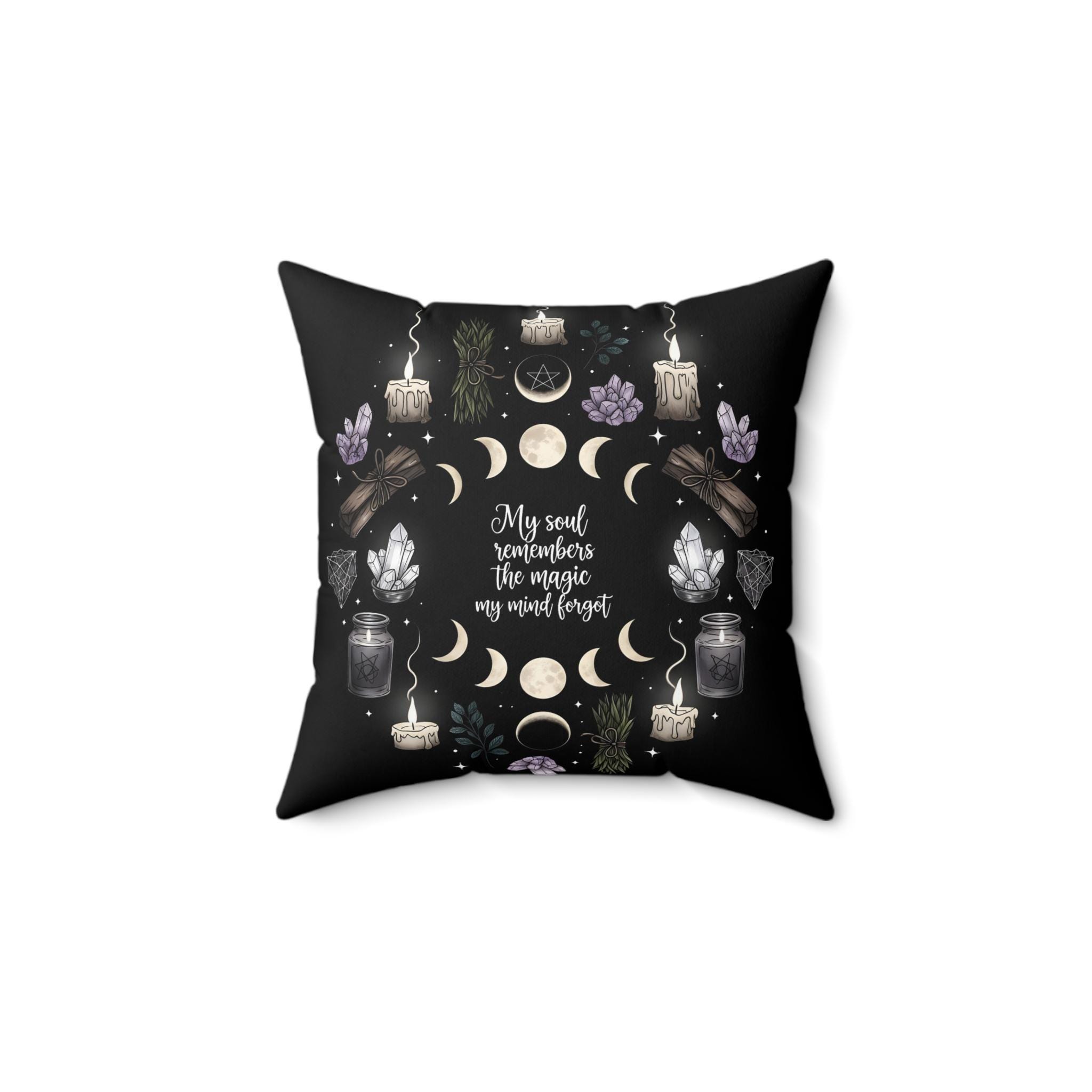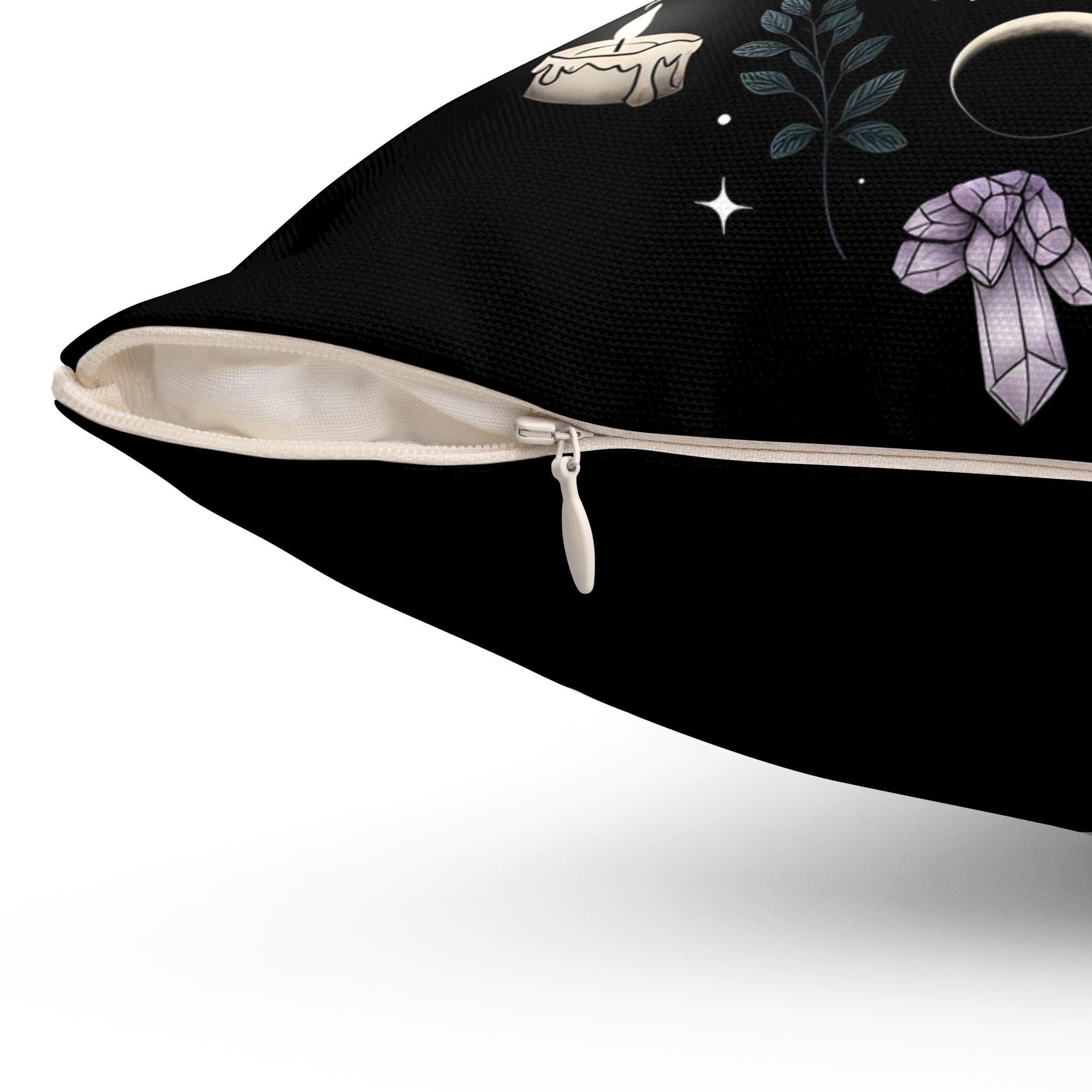 This enchanting throw pillow features crystals, moon phases, candles, herbs, and soft mystical smoke — all circling the quote: