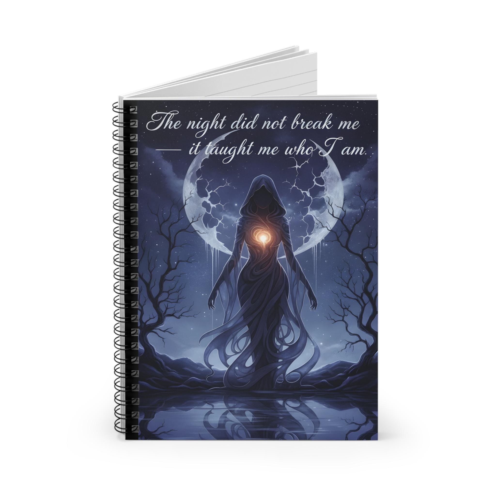 A moody, ruled spiral notebook that feels like a quiet companion on late-night thoughts. The dark, lunar-front artwork shows a cloaked figure standing beneath a cracked full moon, a warm heart-glow at its center—words above read, “The night did not break me — it taught me who I am.” The 6" x 8" size slips into bags easily and the metal spiral lets pages lie flat for uninterrupted writing. Inside, thick 90gsm ruled pages welcome journal entries, sketches, lists, and study notes, while a rear document pocket keeps loose papers secure. This notebook blends practical details with a reflective, slightly mystical vibe—made for people who journal through the night, track their inner work, or want a striking notebook for everyday use.