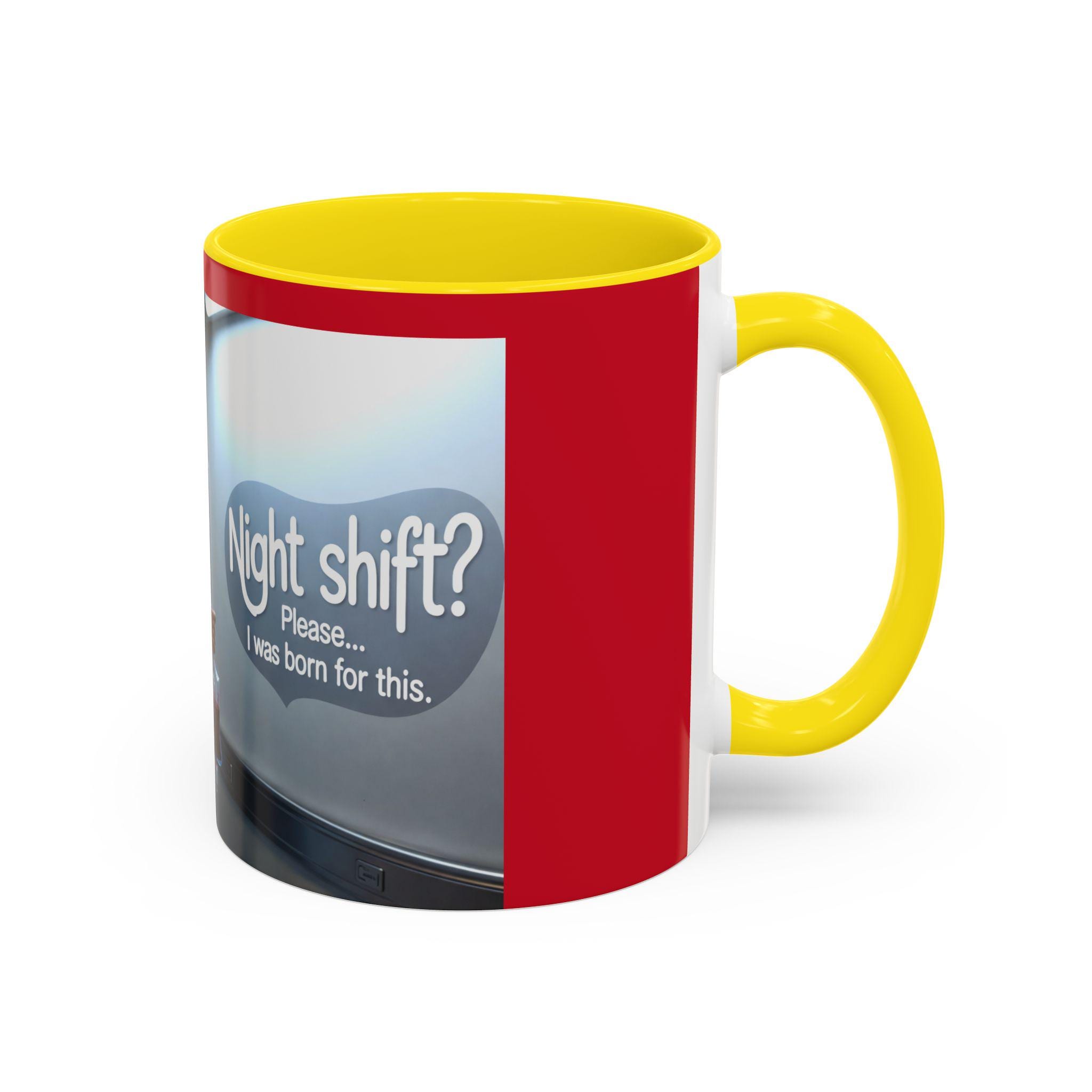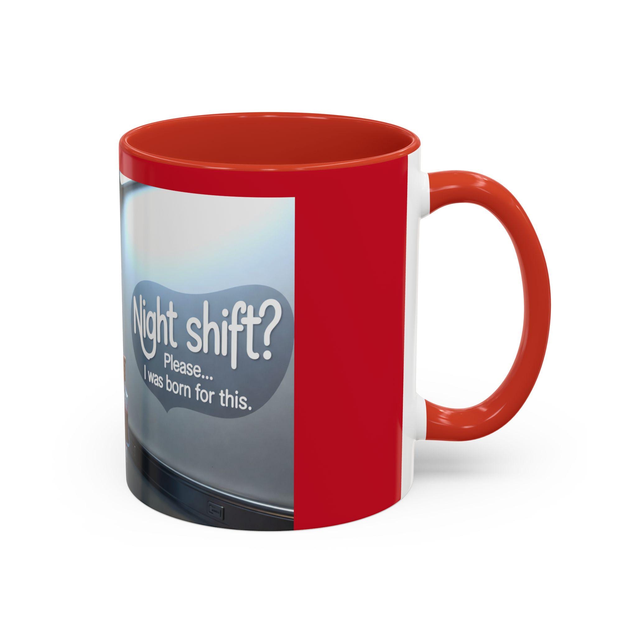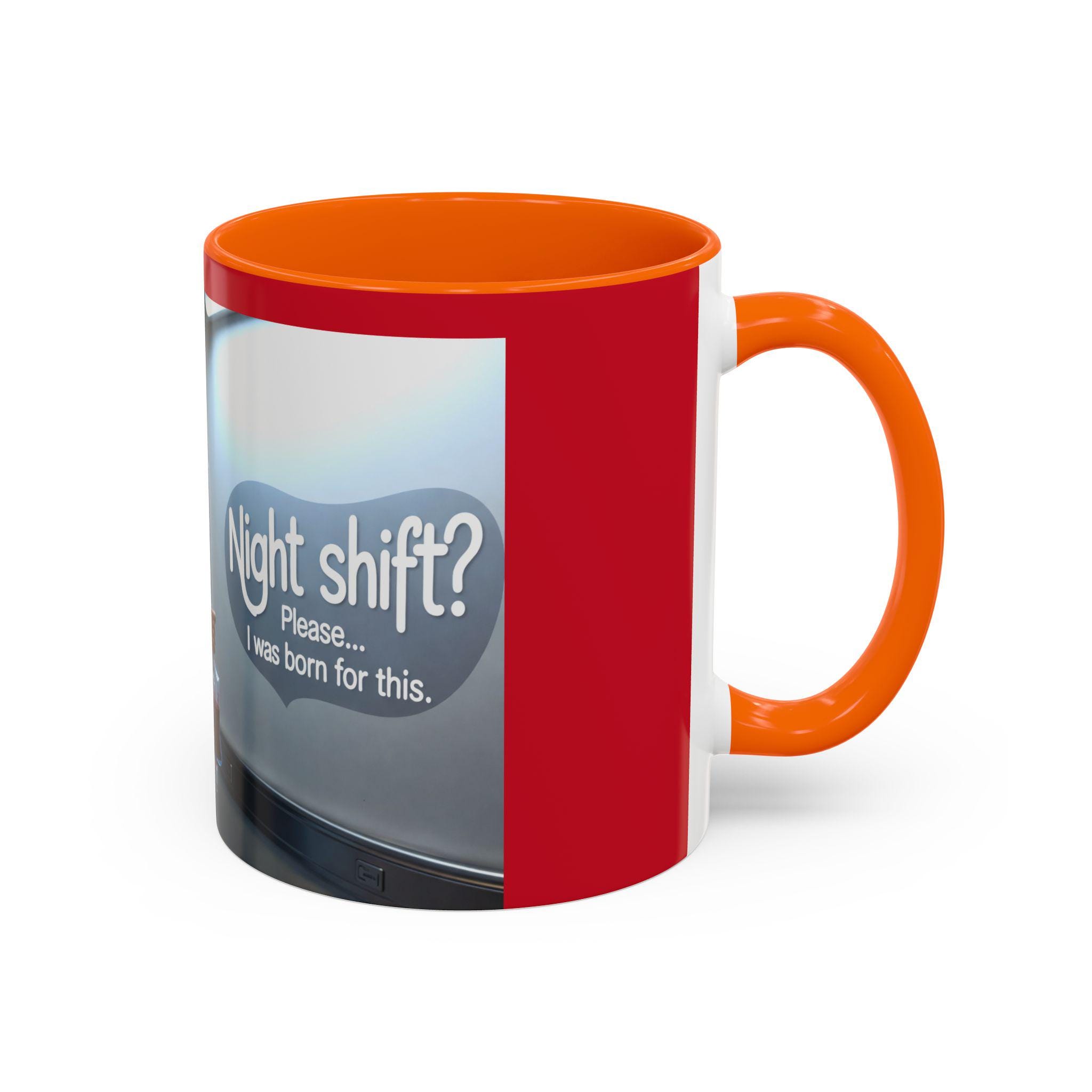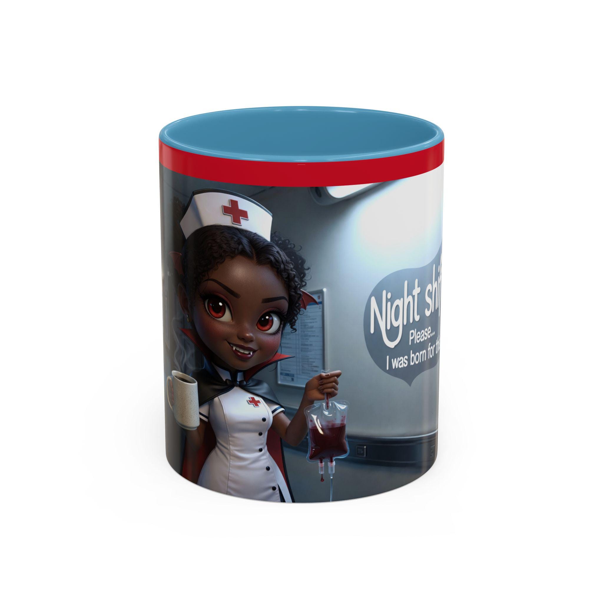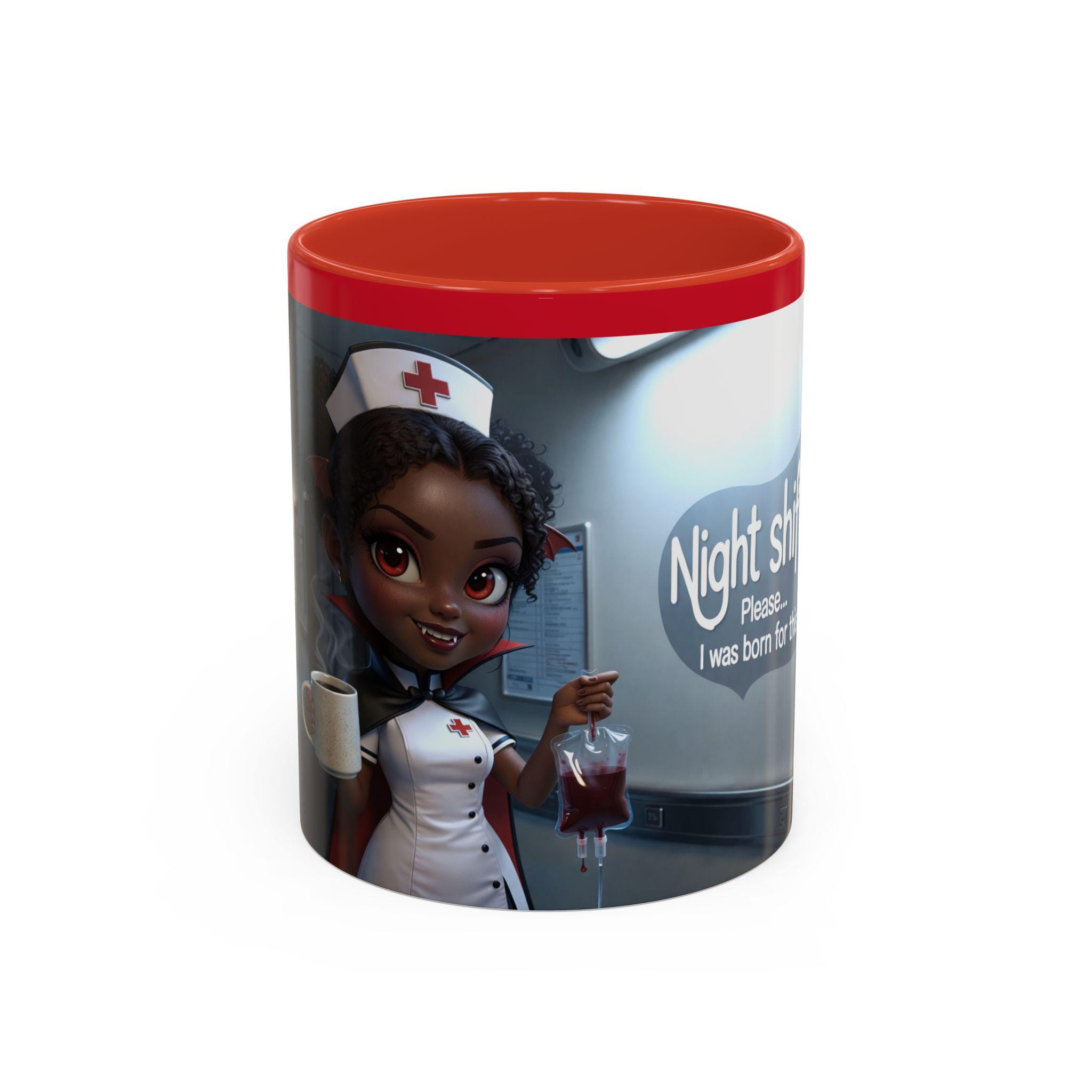 Late-night rounds, quiet fluorescent hum, and that small, fierce pride that comes with keeping watch when the rest of the world sleeps. This ceramic accent coffee mug pairs a bold colored handle and interior with a glossy finish and crisp, vibrant print that celebrates night-shift caregivers. The artwork shows a confident nurse character offering a comforting IV bag and a confident line — gentle humor that reads like an inside nod between colleagues. Sip something warm between calls, prop it on a charting cart, or keep it on your break table as a bit of encouragement during long overnight hours.