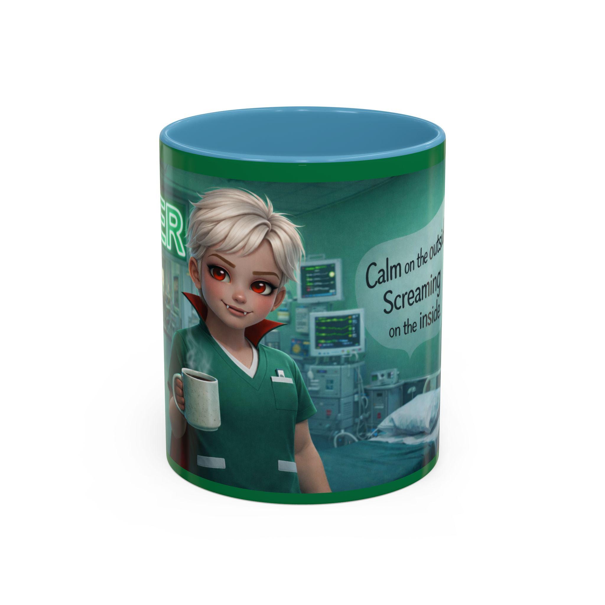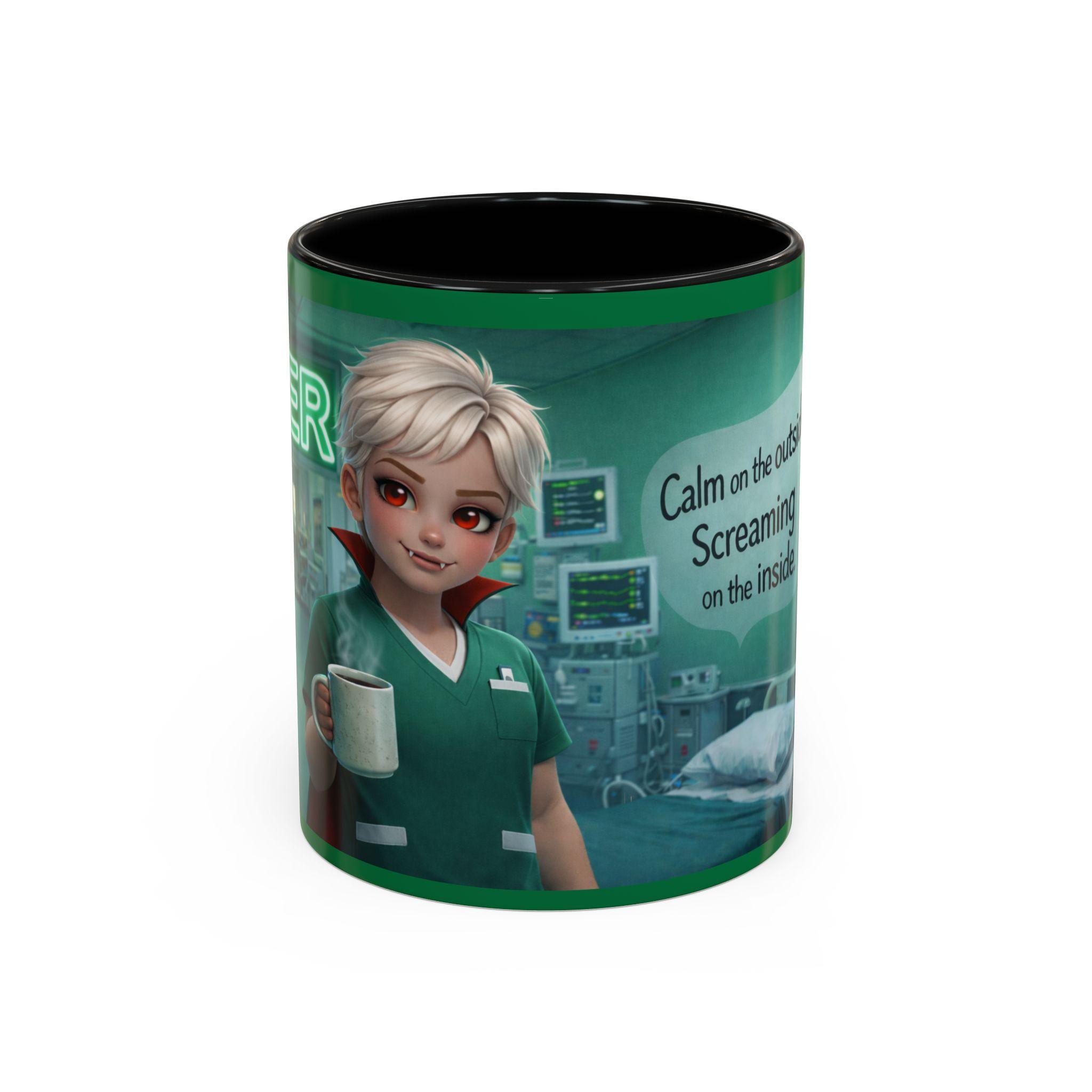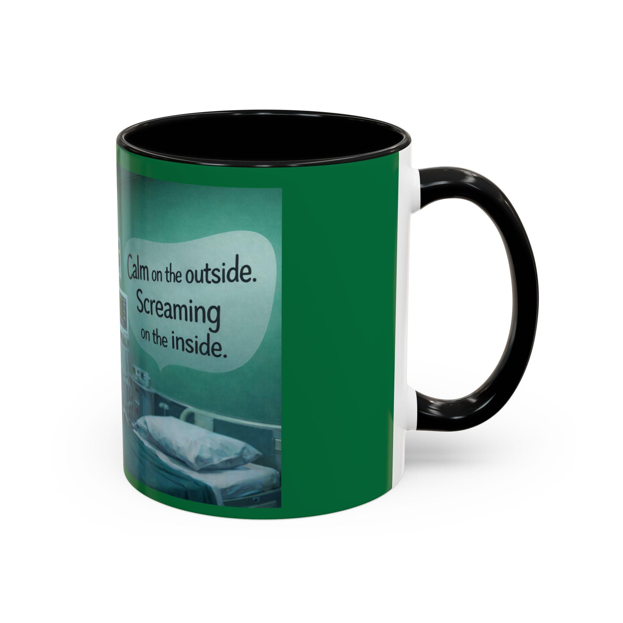 This ceramic accent mug brings a warm, steady companion to demanding shift work. Designed with deep green accents and a glossy finish, the design features a comforting scene of a nurse holding a steaming cup next to a calm hospital backdrop and the phrase "Calm on the outside. Screaming on the inside." It’s the kind of mug that speaks in knowing chuckles between charting, night rounds, and coffee breaks — a small, honest nod to resilience. The colored interior and handle add a pop of personality on your desk or break-room shelf, while the sturdy C-handle and two size options let you sip exactly how you need to. Dishwasher- and microwave-safe, it’s built for real-life hustle and those quick, necessary warm-ups.