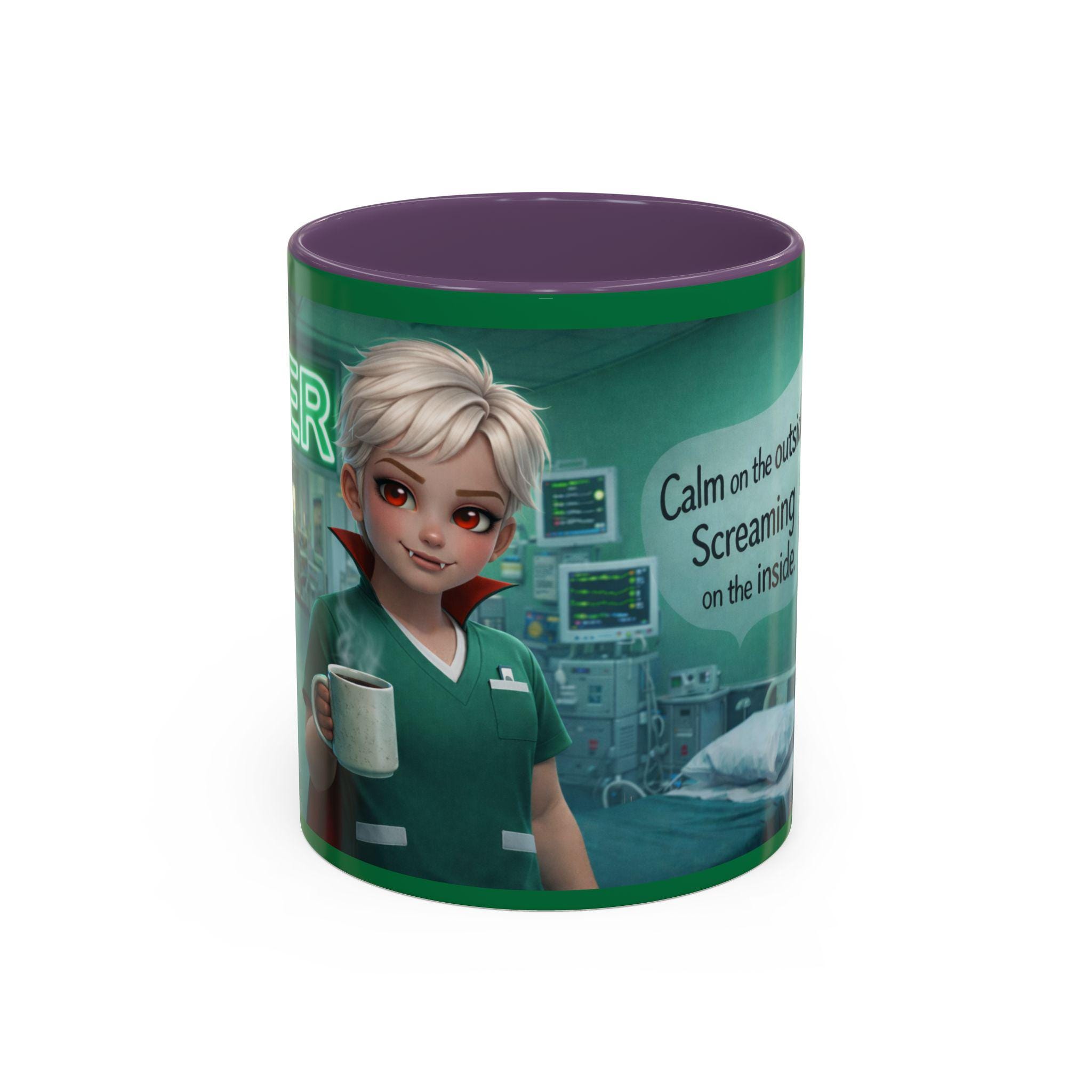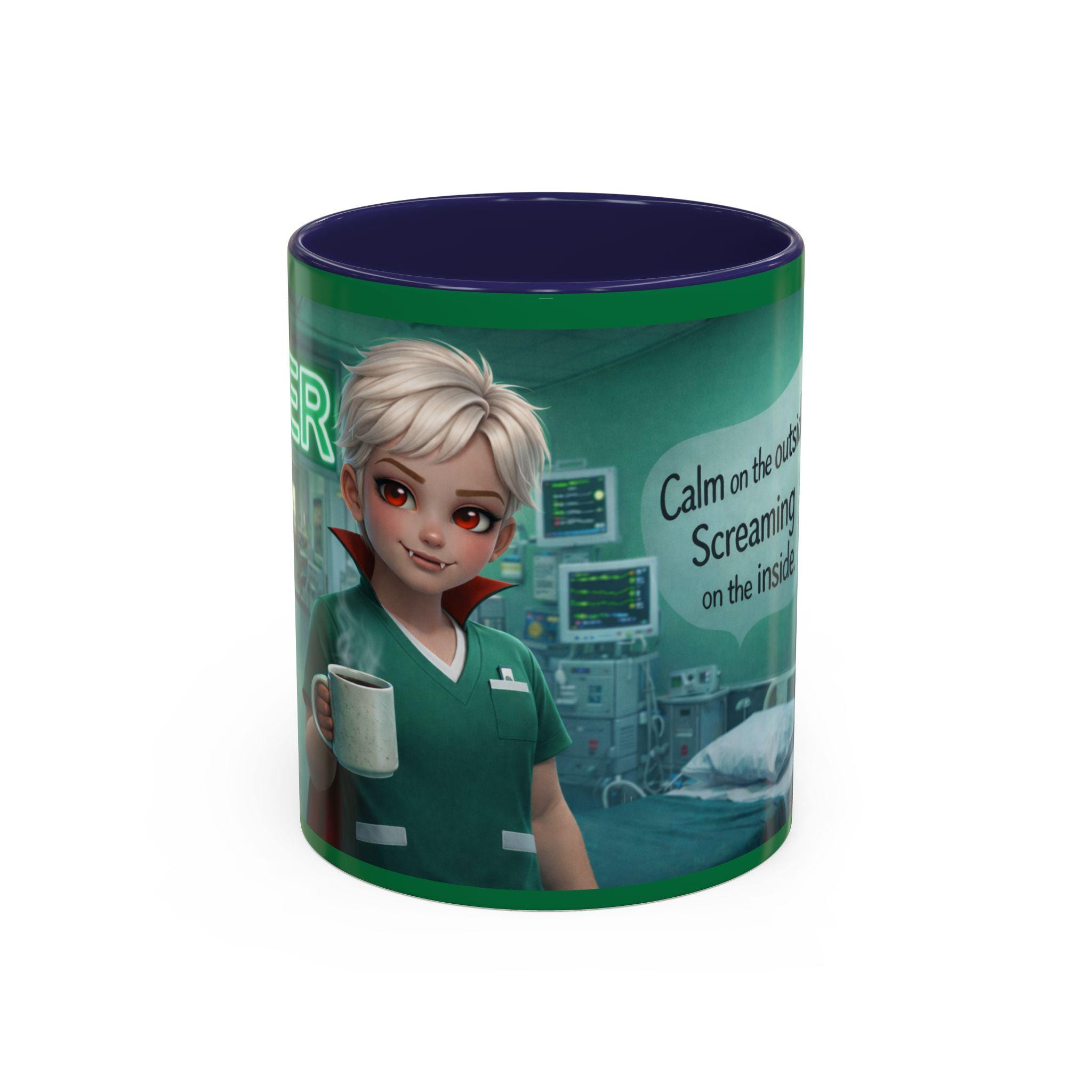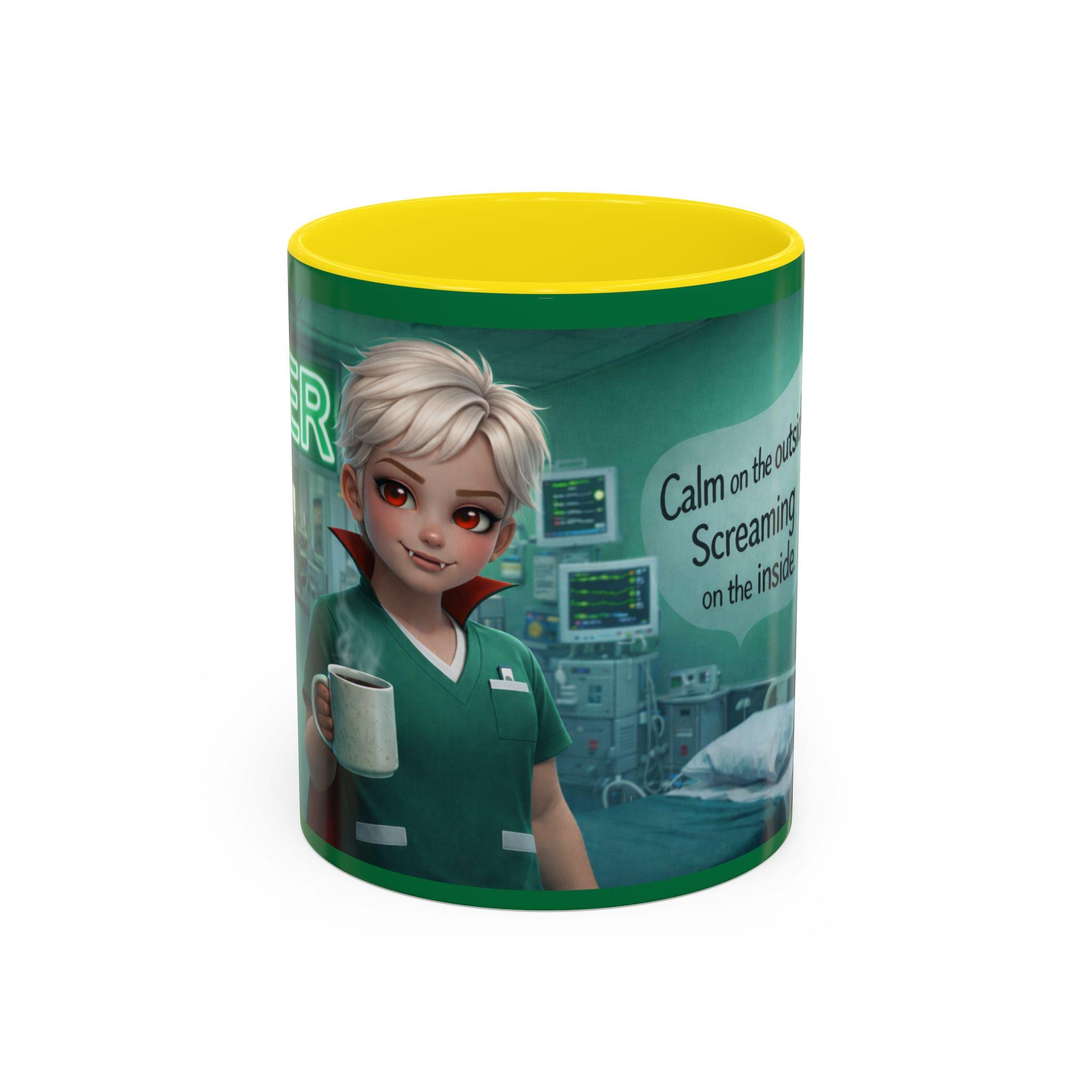This ceramic accent mug brings a warm, steady companion to demanding shift work. Designed with deep green accents and a glossy finish, the design features a comforting scene of a nurse holding a steaming cup next to a calm hospital backdrop and the phrase "Calm on the outside. Screaming on the inside." It’s the kind of mug that speaks in knowing chuckles between charting, night rounds, and coffee breaks — a small, honest nod to resilience. The colored interior and handle add a pop of personality on your desk or break-room shelf, while the sturdy C-handle and two size options let you sip exactly how you need to. Dishwasher- and microwave-safe, it’s built for real-life hustle and those quick, necessary warm-ups.