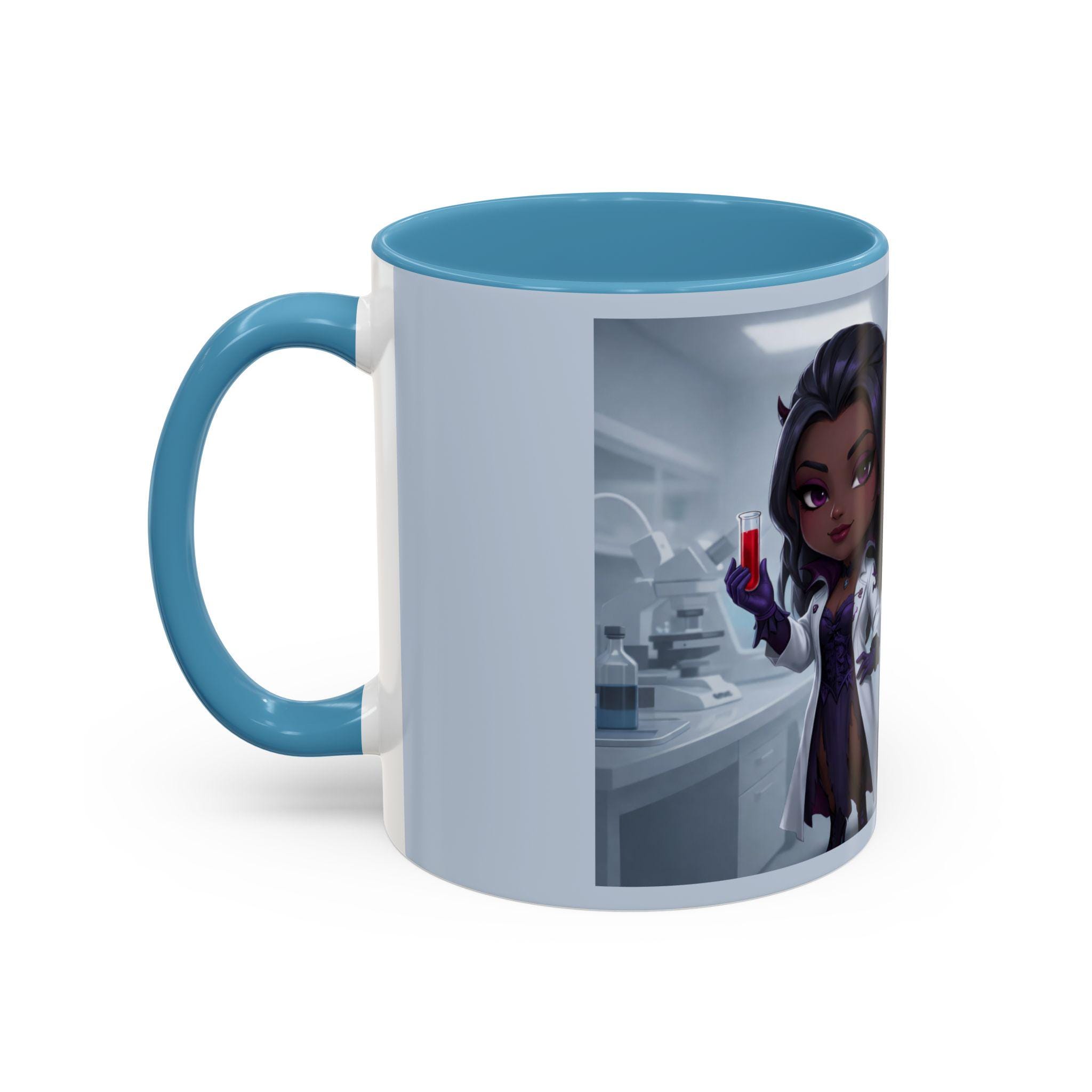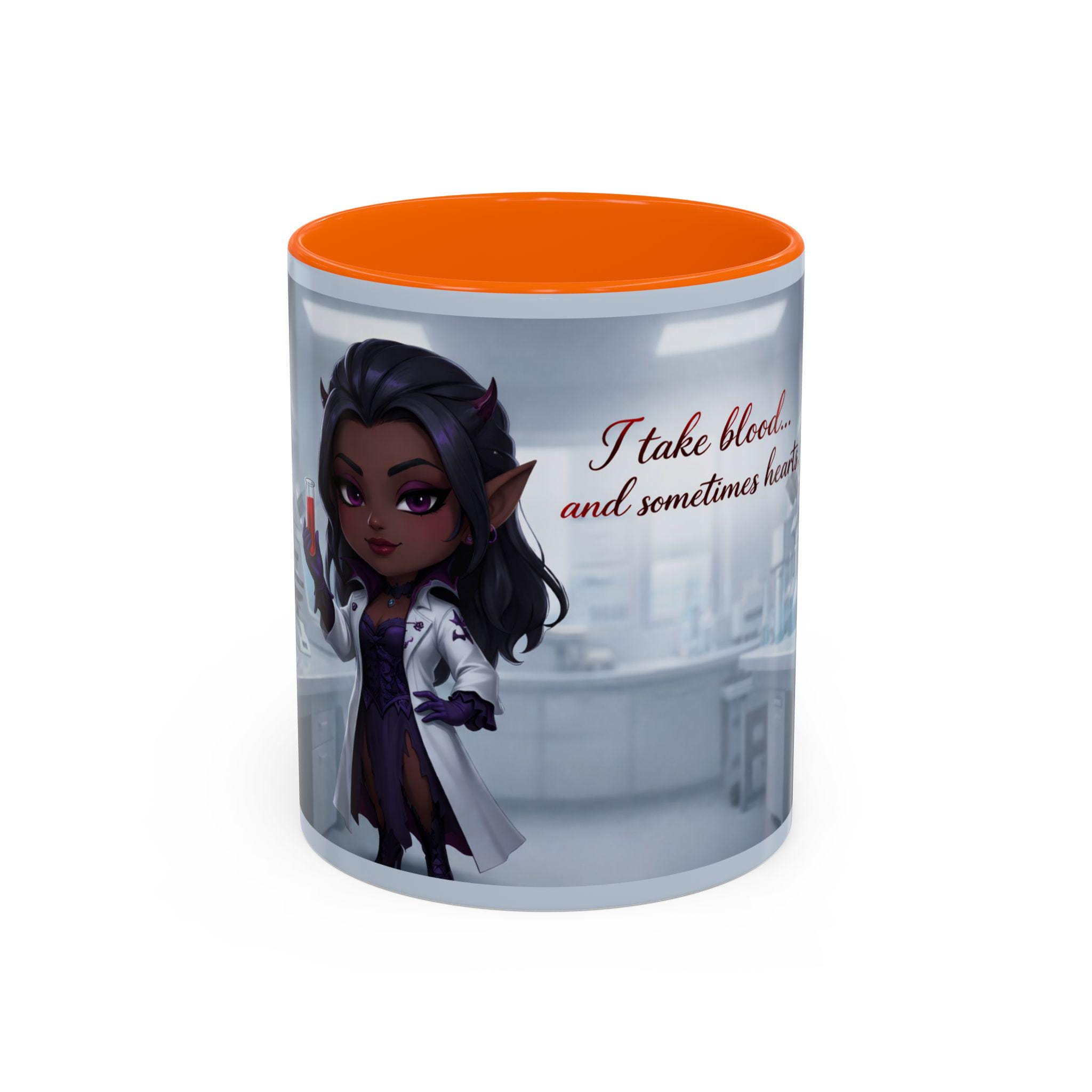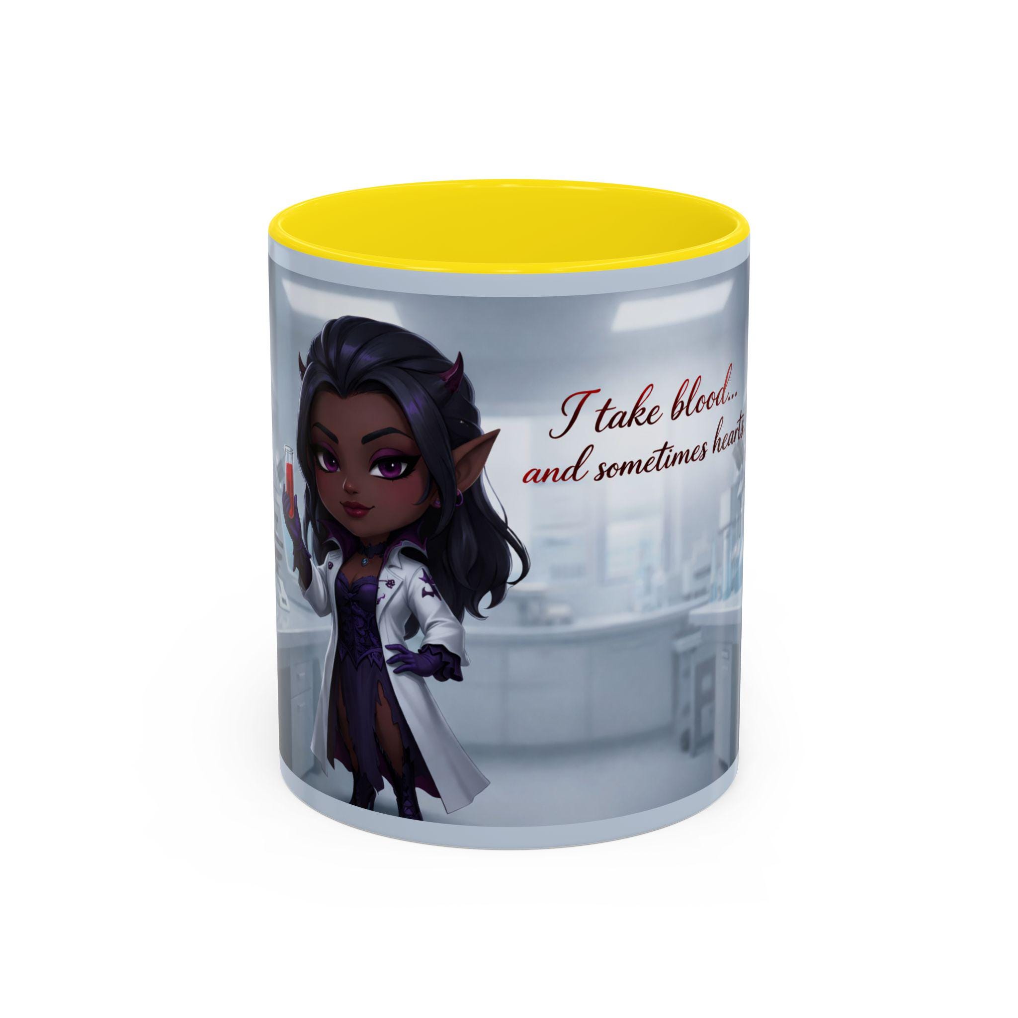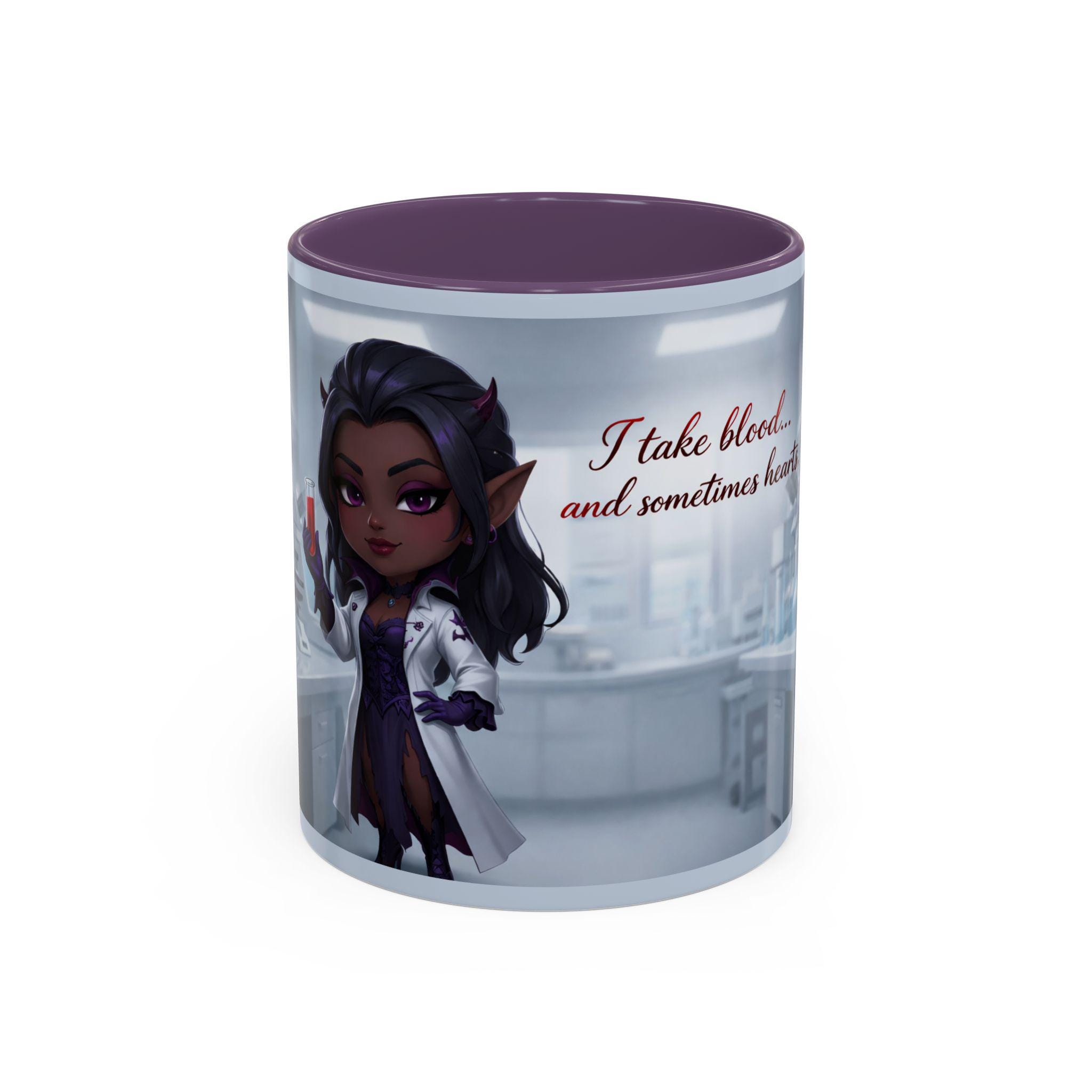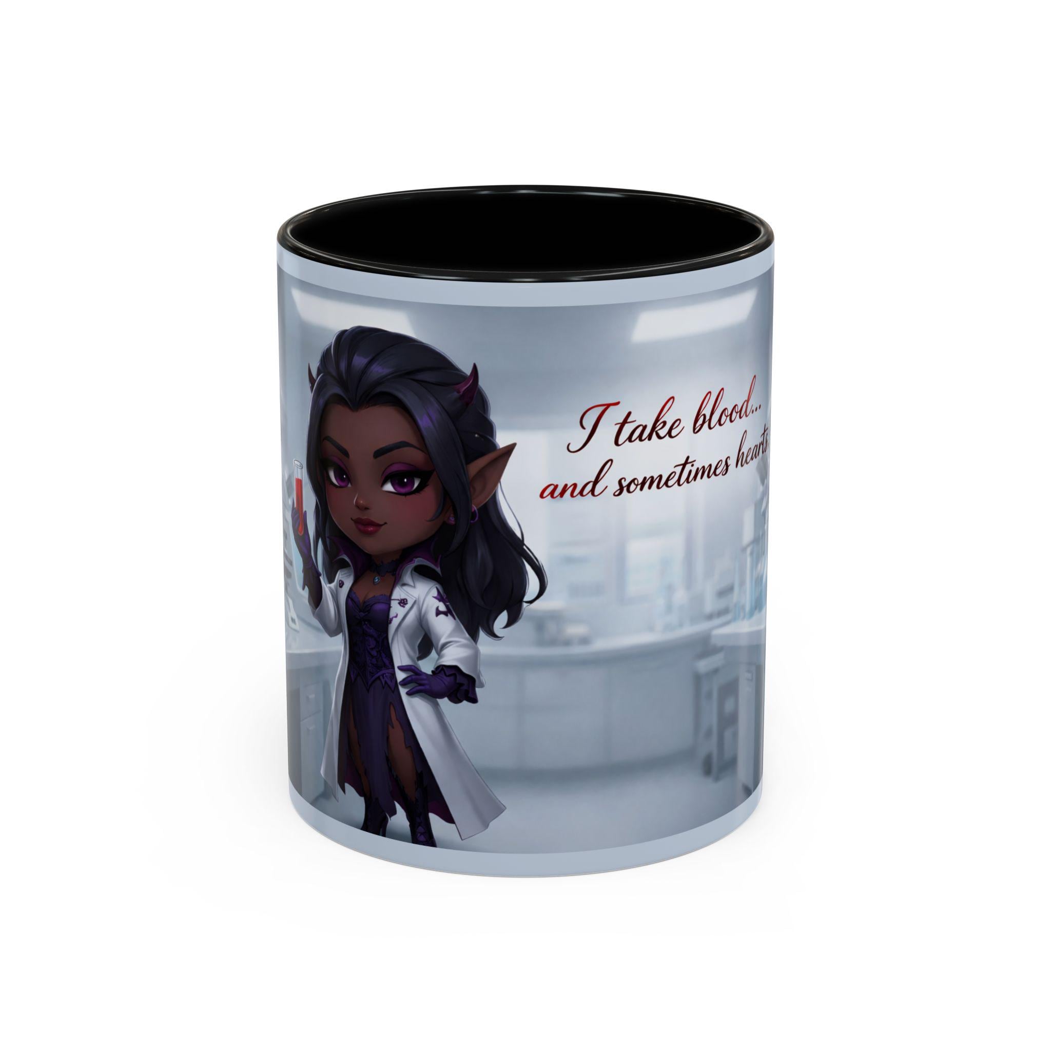 This mug features an elegant chibi-style vampire lab technician, holding a blood sample with a confident smile — paired with the flirtatiously wicked quote:
