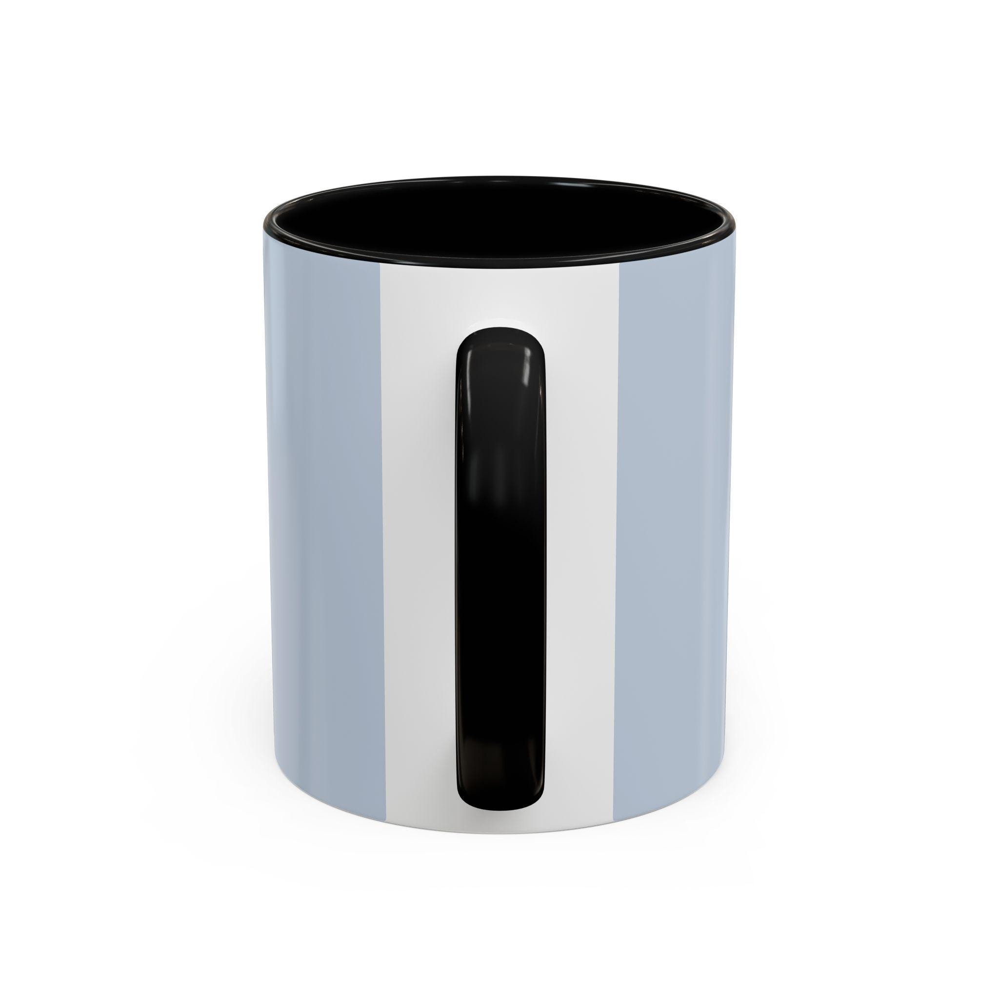 - Durable white ceramic with colored interior and C-shaped handle.