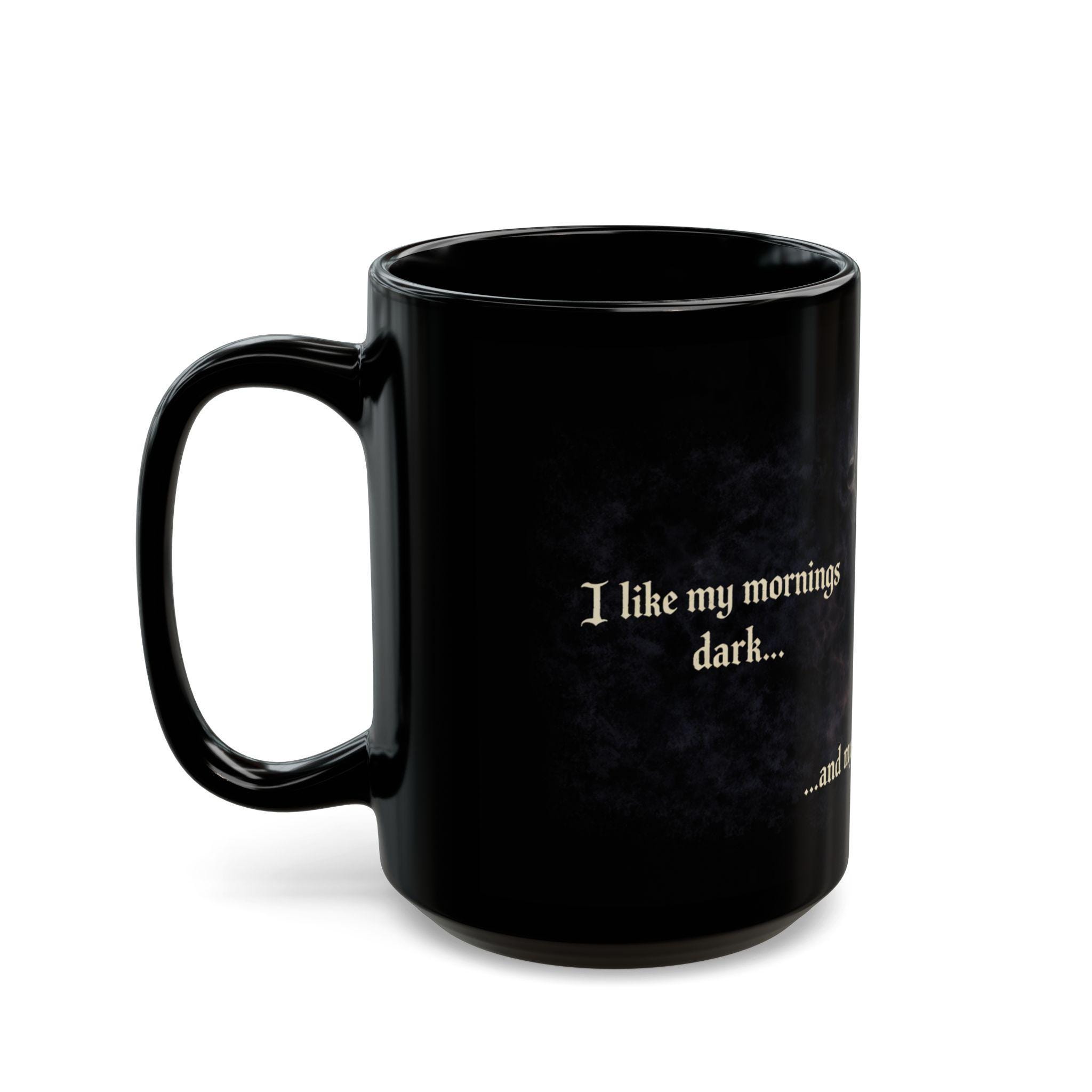 It sits heavy and warm in your hand, the C-shaped handle comfortable for long sips. Use it during early-morning routines or late-night writing sessions when you want your coffee to match the mood—deep, bold, and quietly defiant. The high-quality print keeps the dark tones vivid against the black glaze, so the artwork reads like a private emblem for those who prefer their brew with attitude and atmosphere.