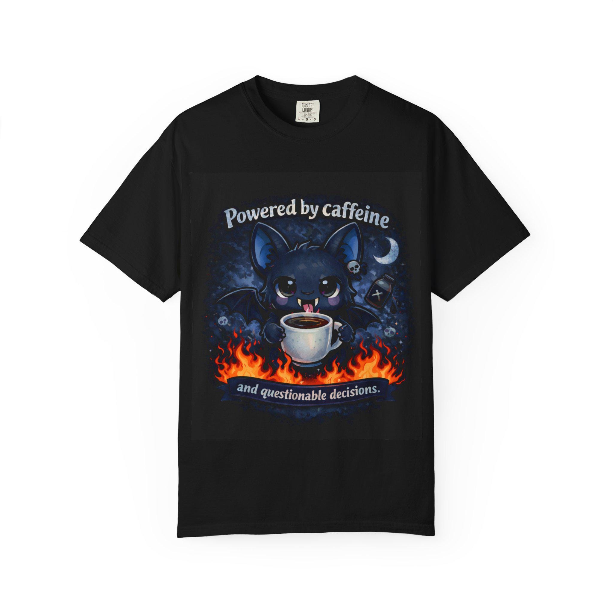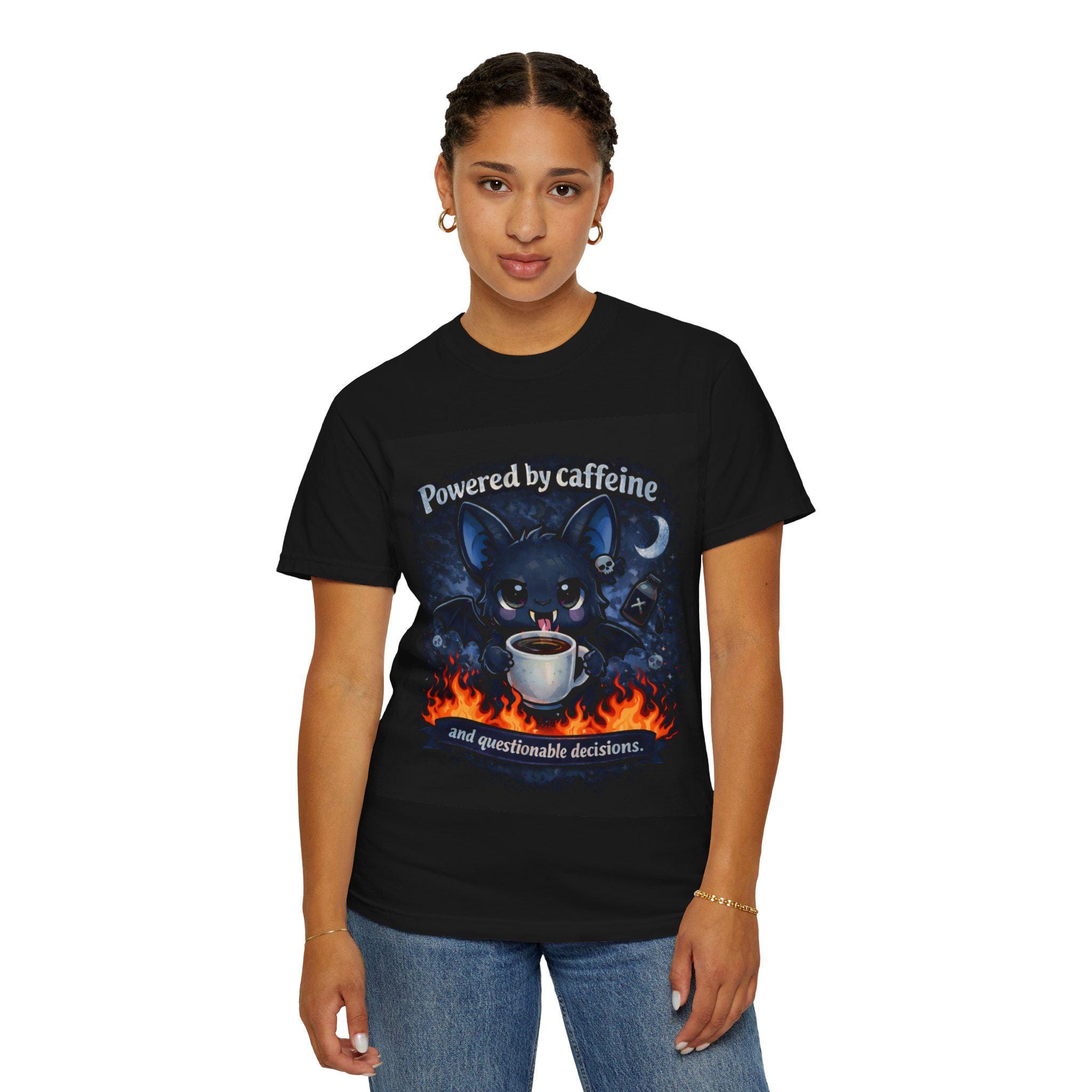 Soft, comfortable, and printed in vivid detail, this tee is made for coffee lovers, night owls, bat fans, and anyone who runs on caffeine and impulse energy.