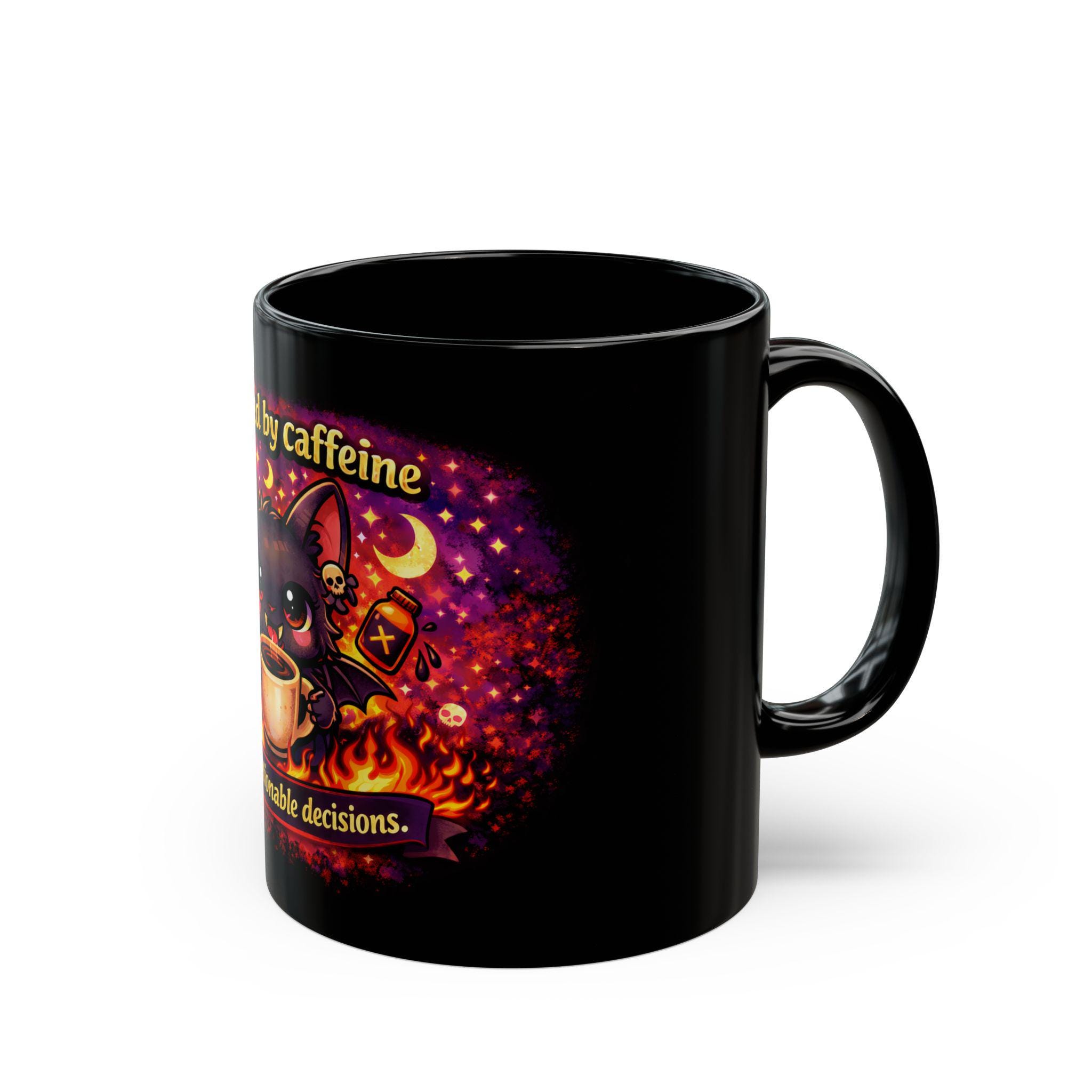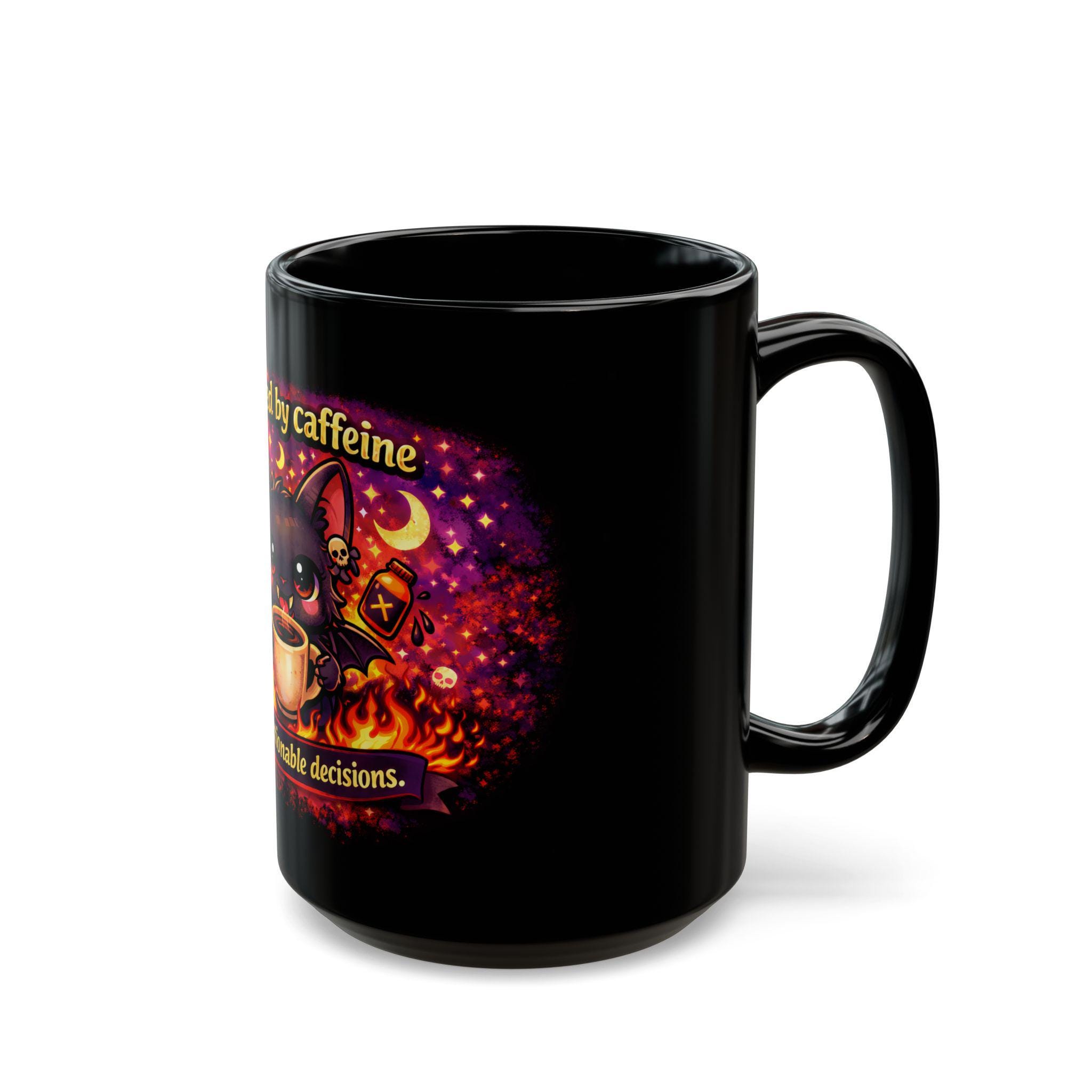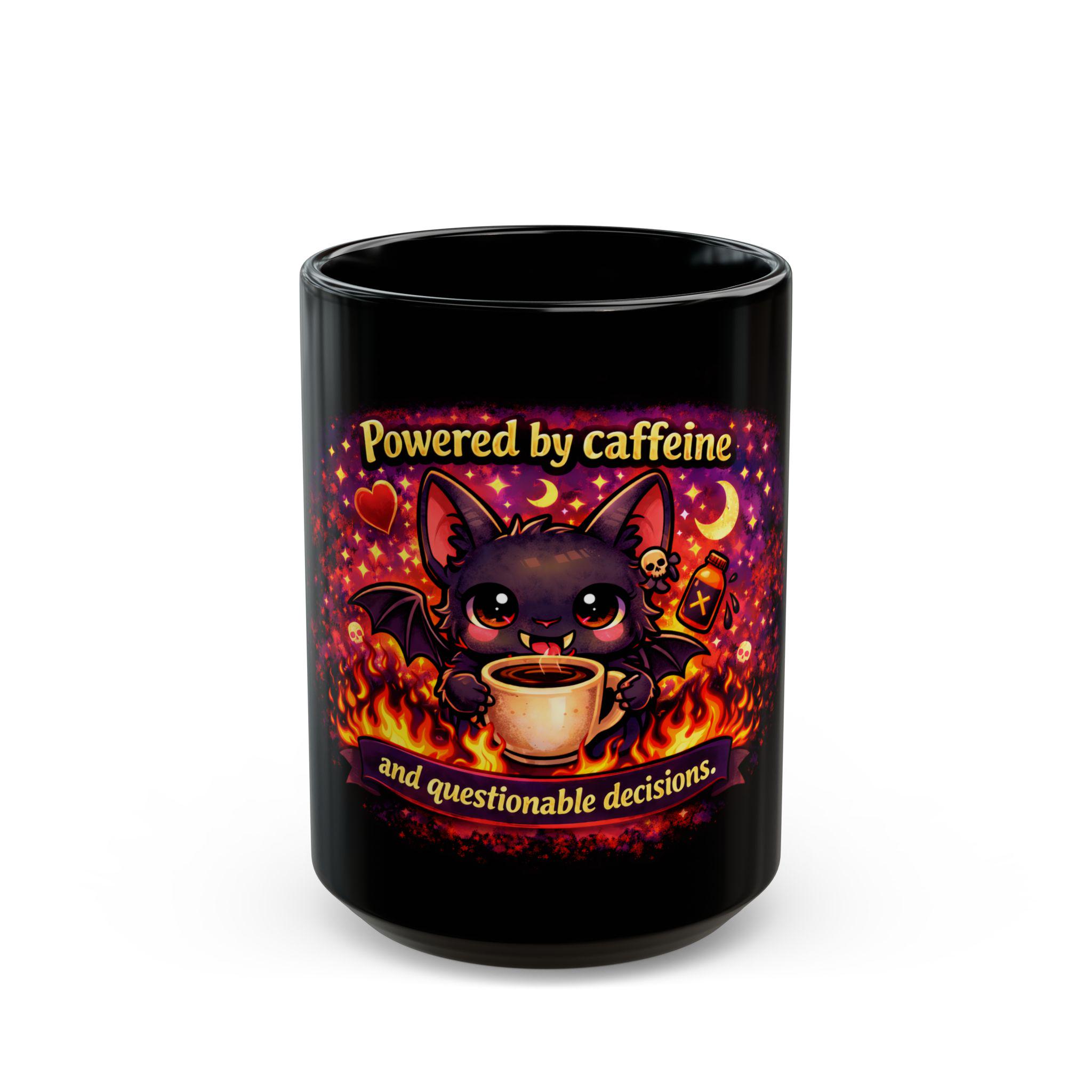 Printed in ultra-vibrant colors on a glossy black ceramic mug, this cup is perfect for coffee lovers, bat fans, night owls, and anyone who lives on caffeine and chaos.