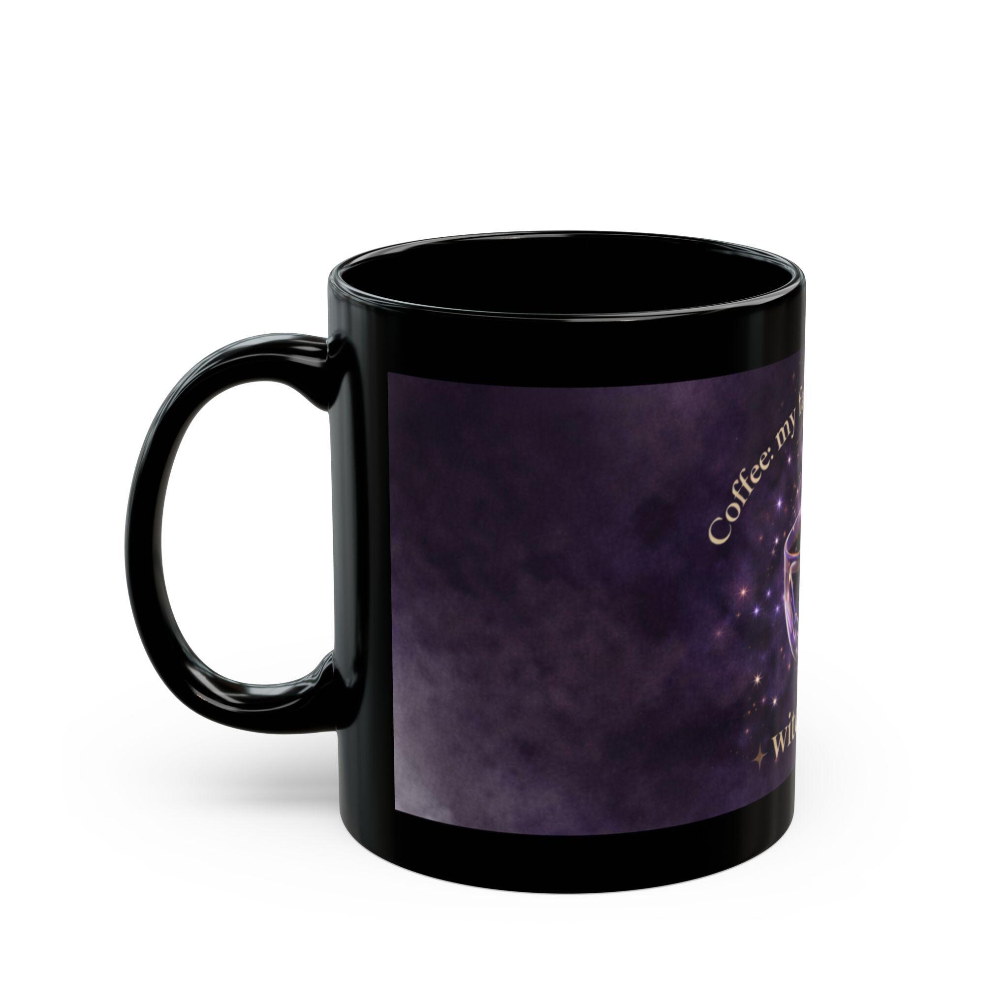 Featuring a glowing purple coffee cup surrounded by sparkles, smoke, and an ethereal dark background, this mug is perfect for witches-at-heart, magical souls, and anyone who believes that coffee is its own form of spellwork.