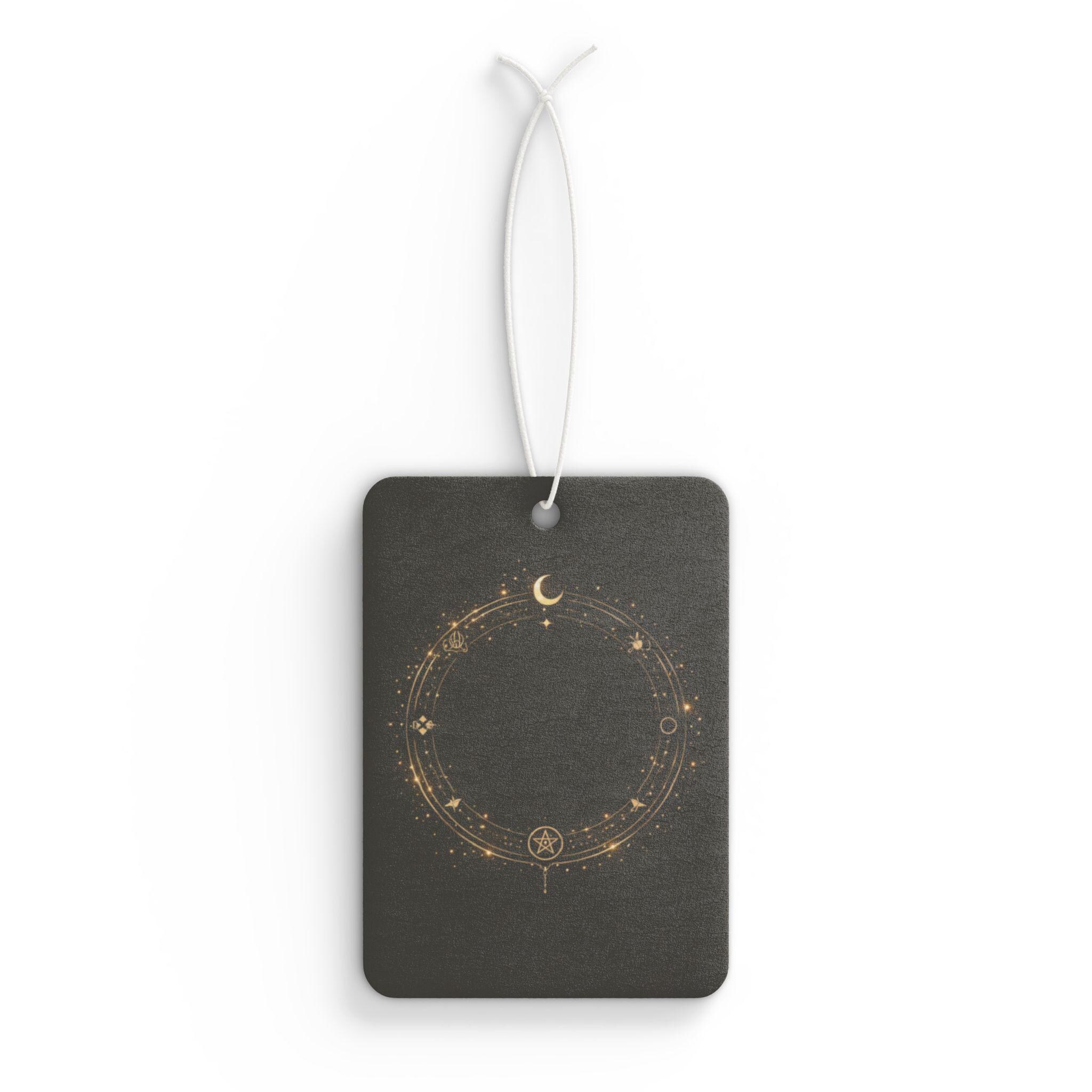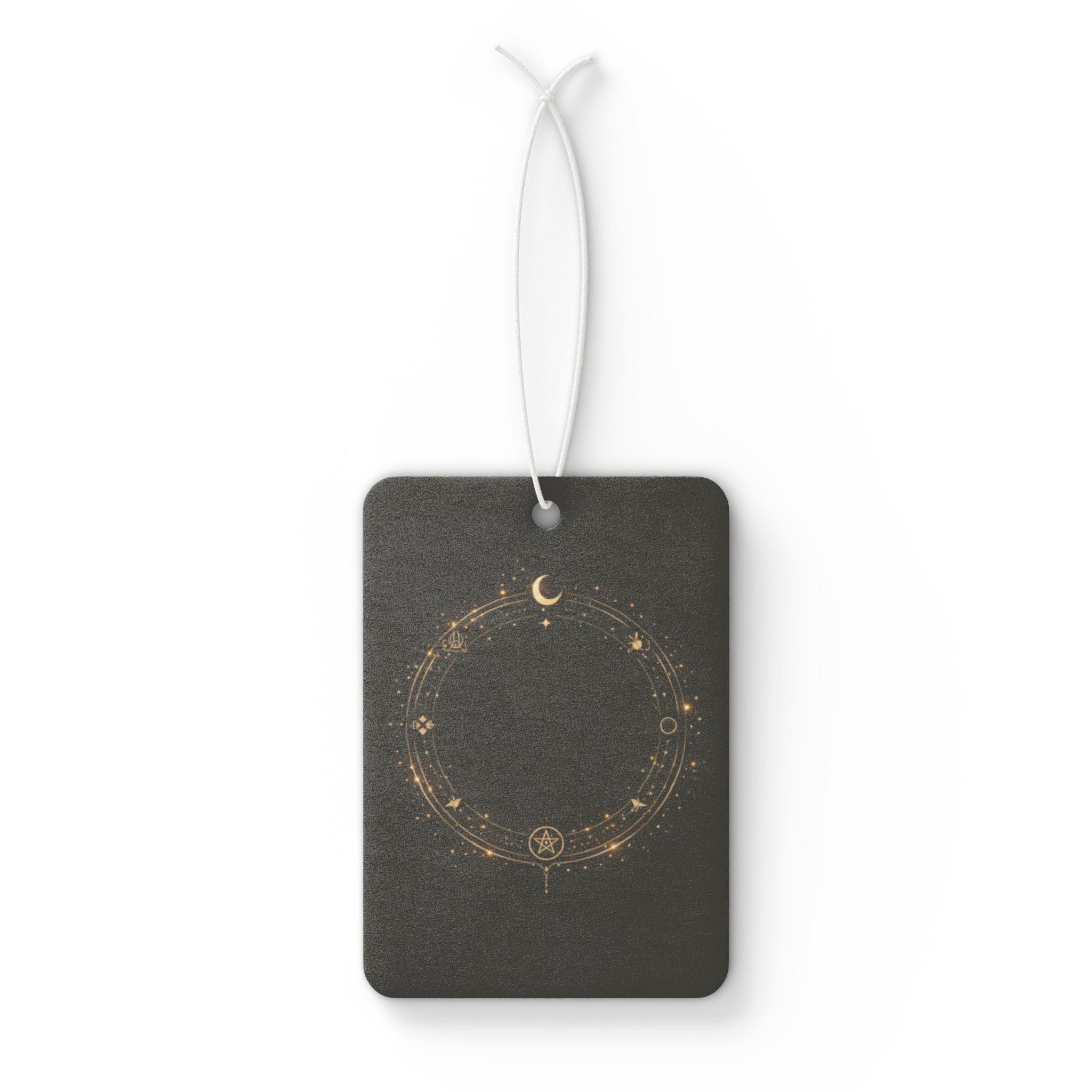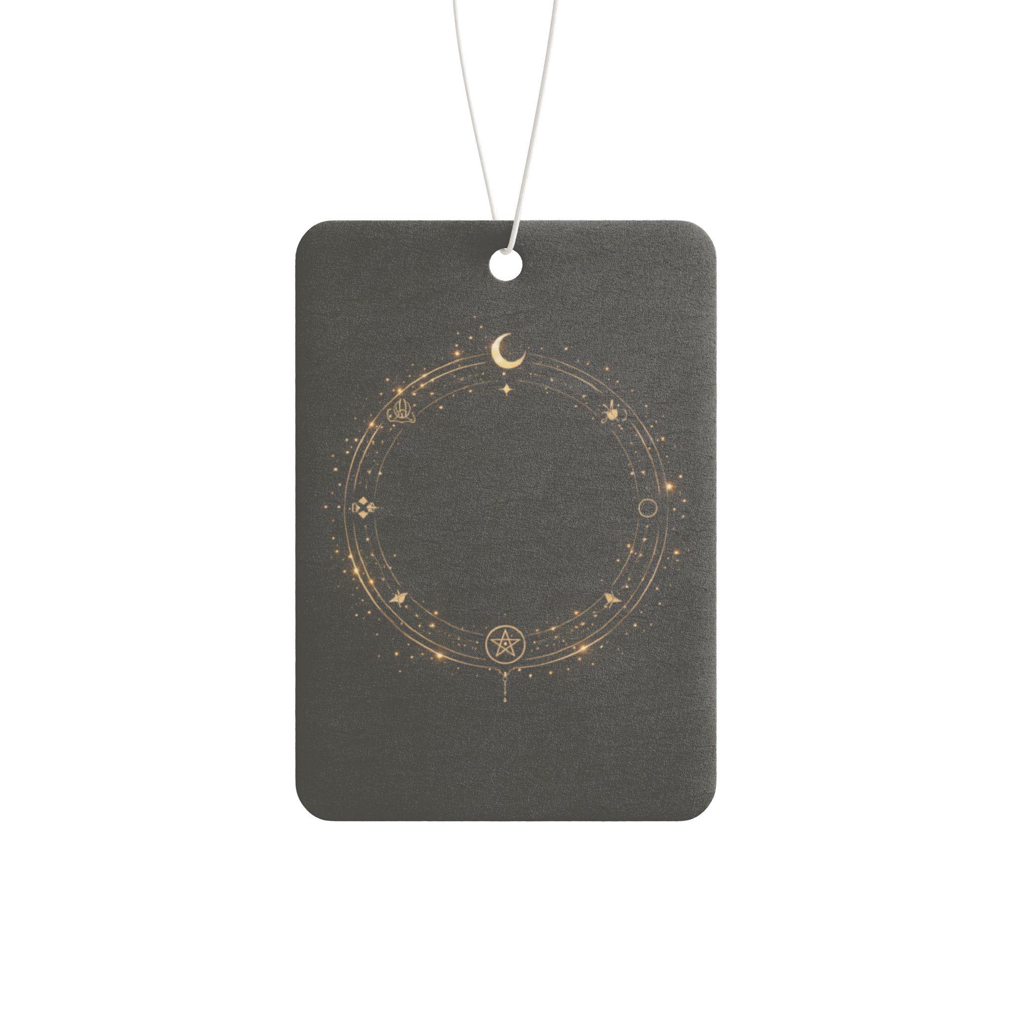 This gothic-inspired car air freshener features an elegant gold witch circle with moon and star details — perfect for anyone who loves subtle mysticism, celestial symbols, and dark aesthetic decor.