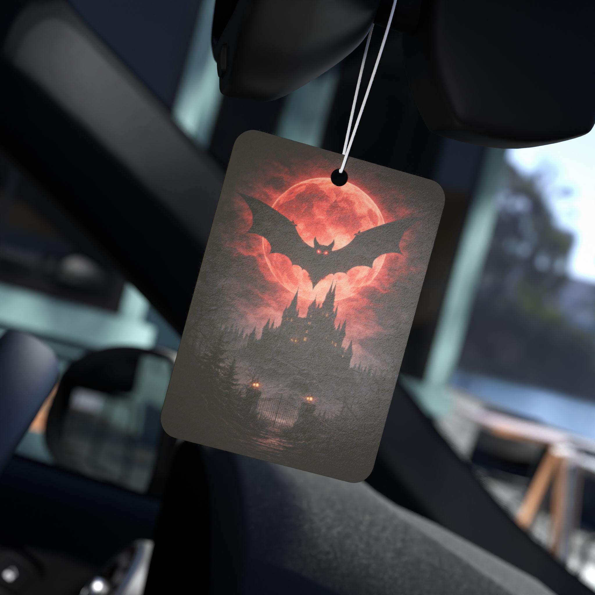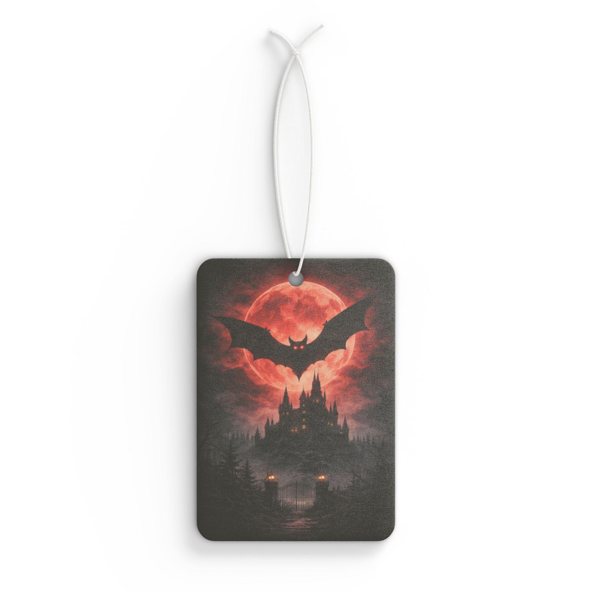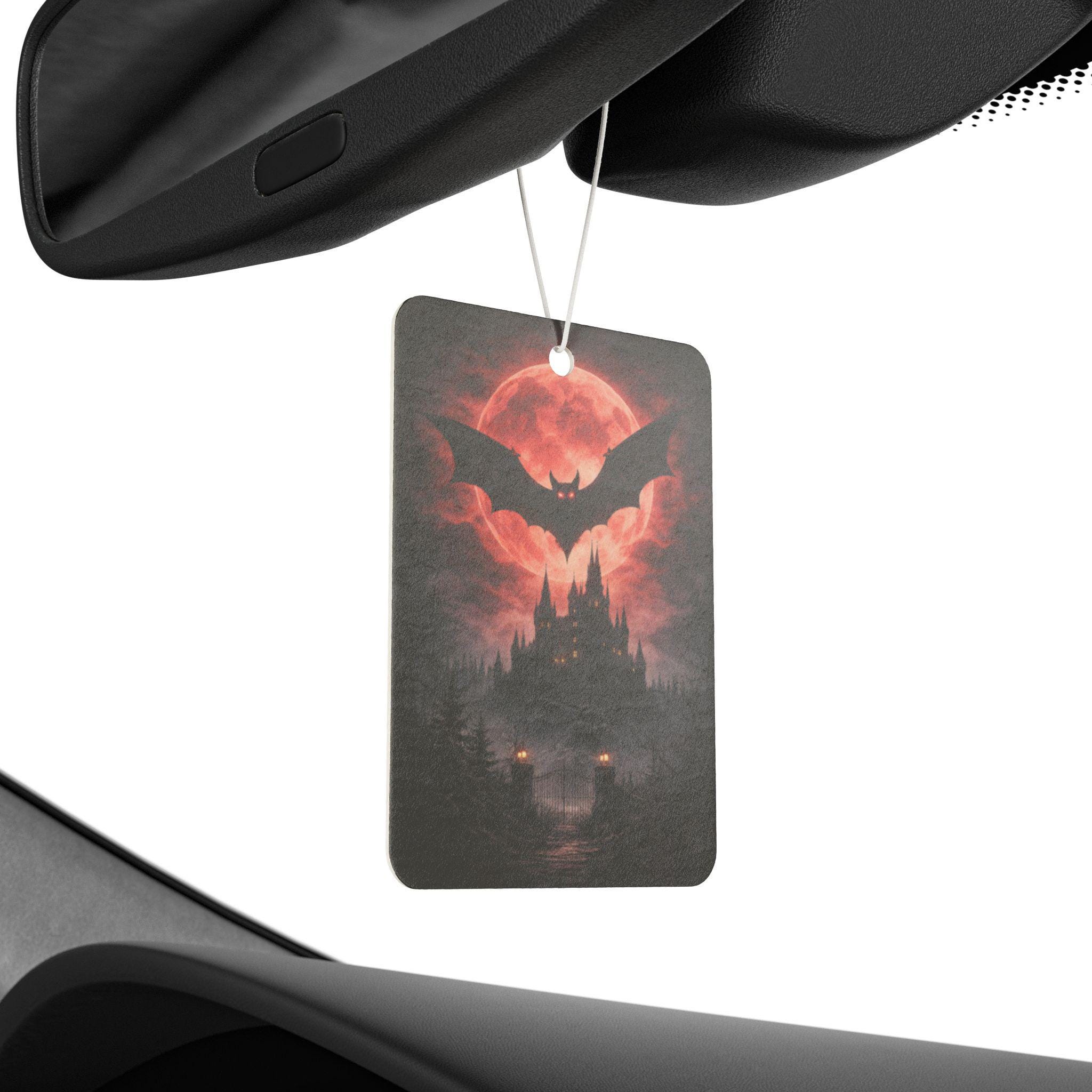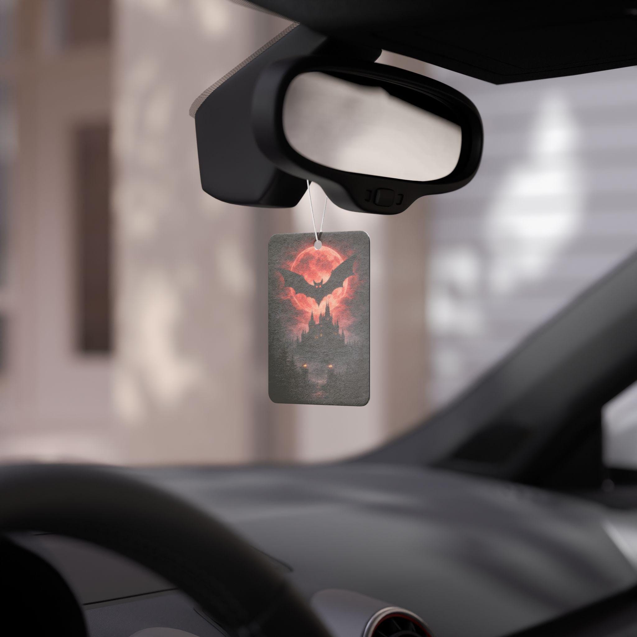 This car air freshener features a powerful bat silhouette rising over a glowing blood moon, with a dark castle emerging through the mist below. It's the perfect accessory for anyone who loves vampires, gothic castles, moody atmospheres, and Transylvania-inspired artwork.