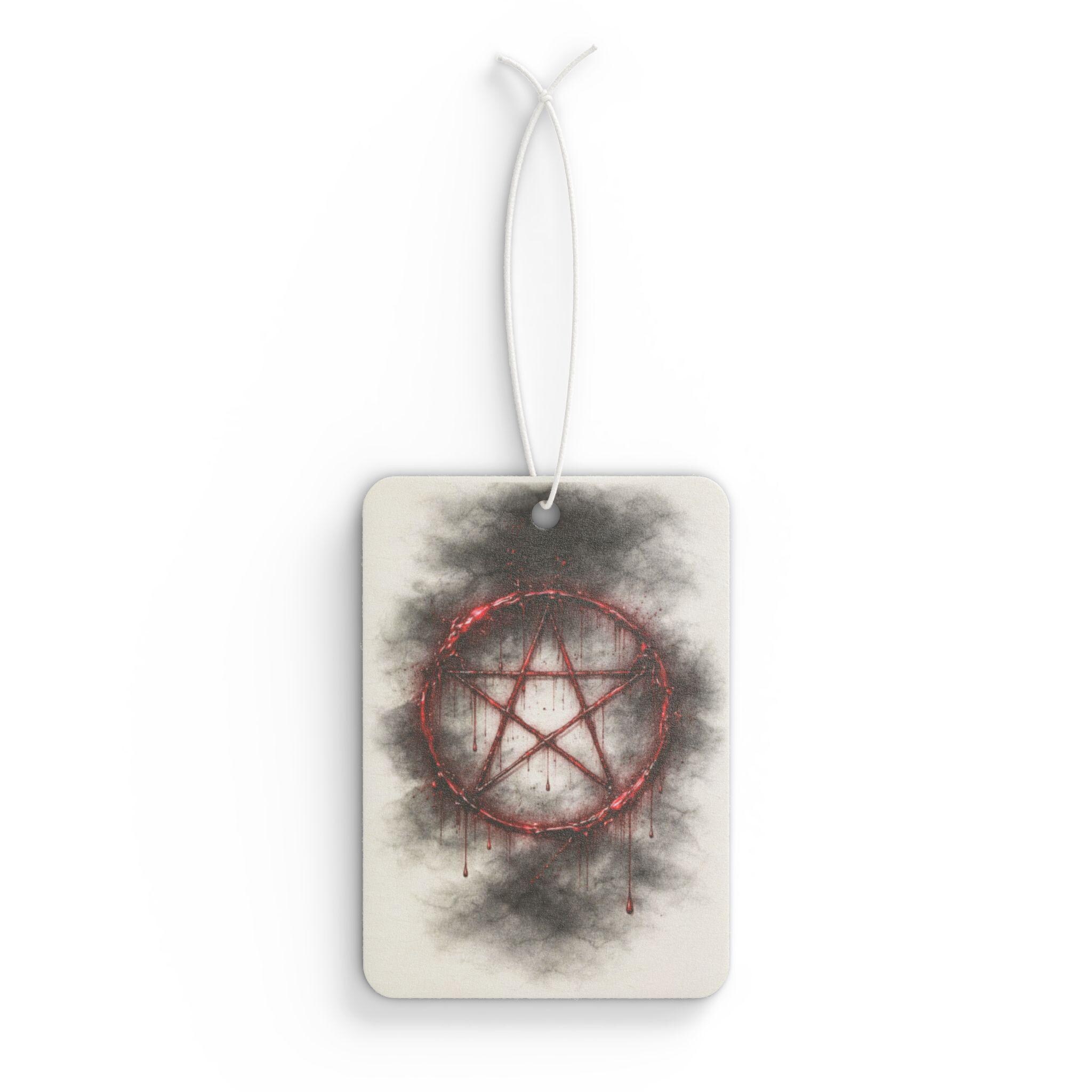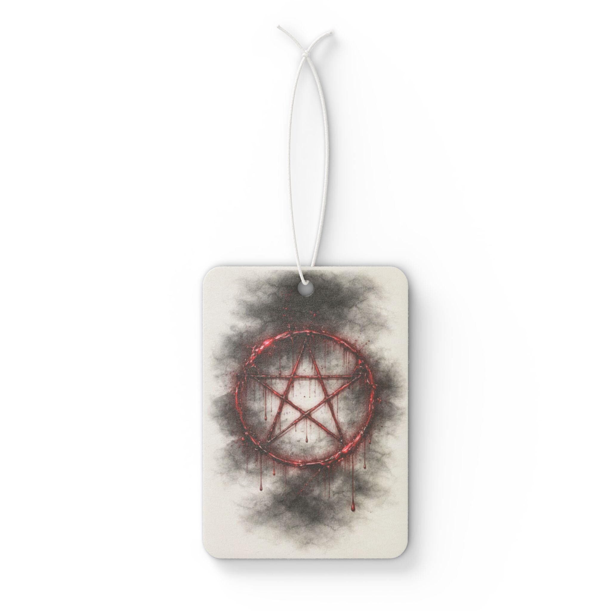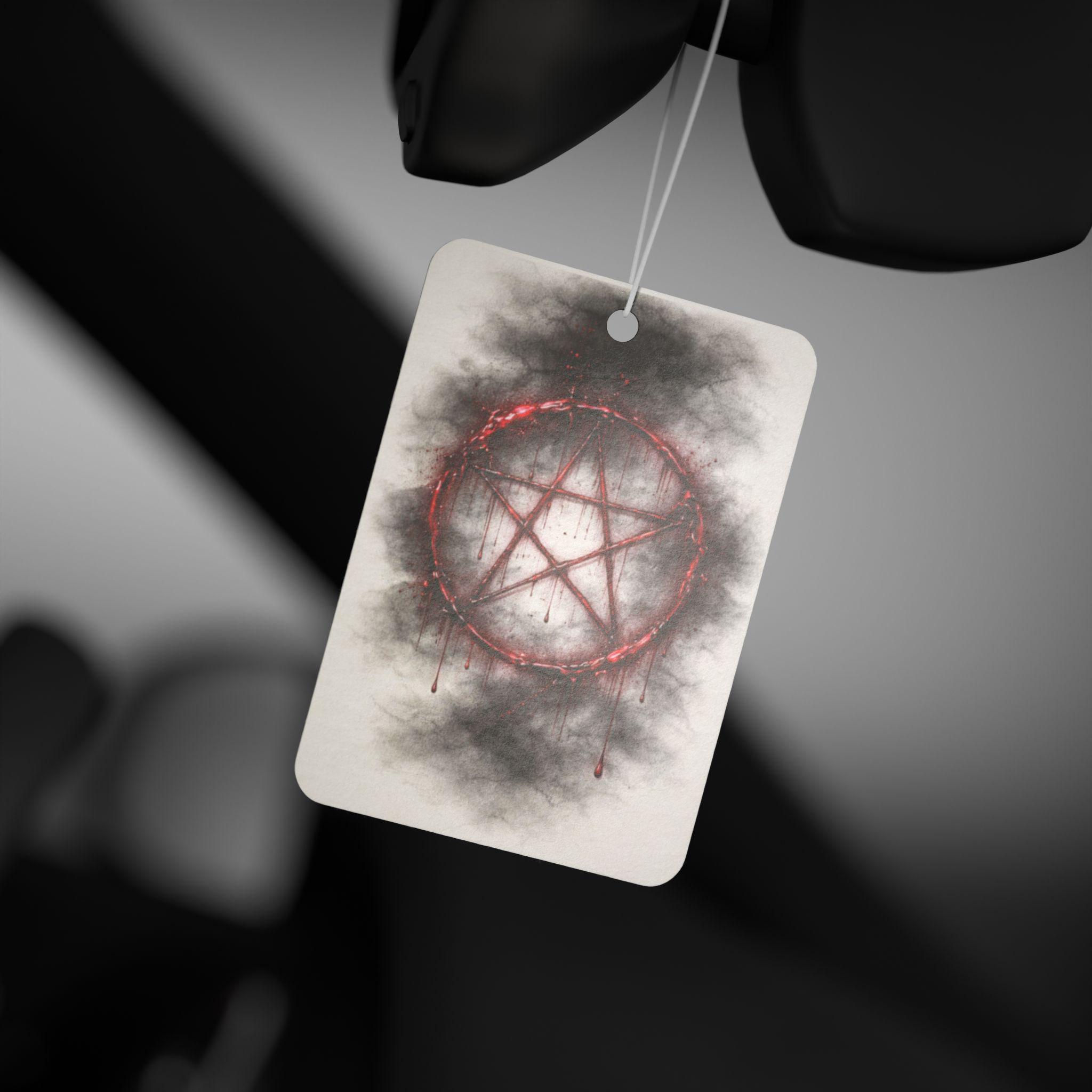 This car air freshener features a striking blood-red rune surrounded by smoky, shadow-like textures — the perfect blend of occult symbolism and dark elegance.