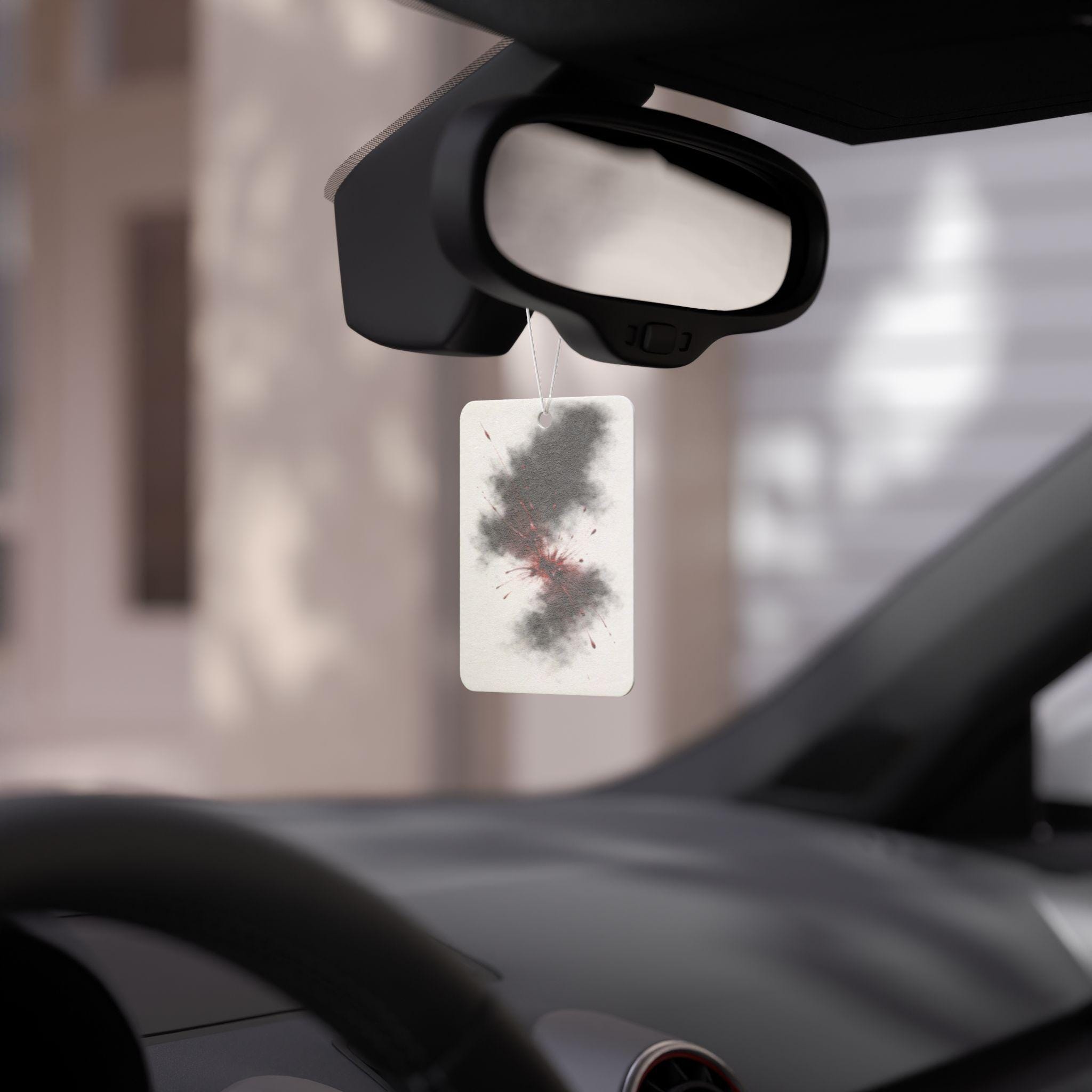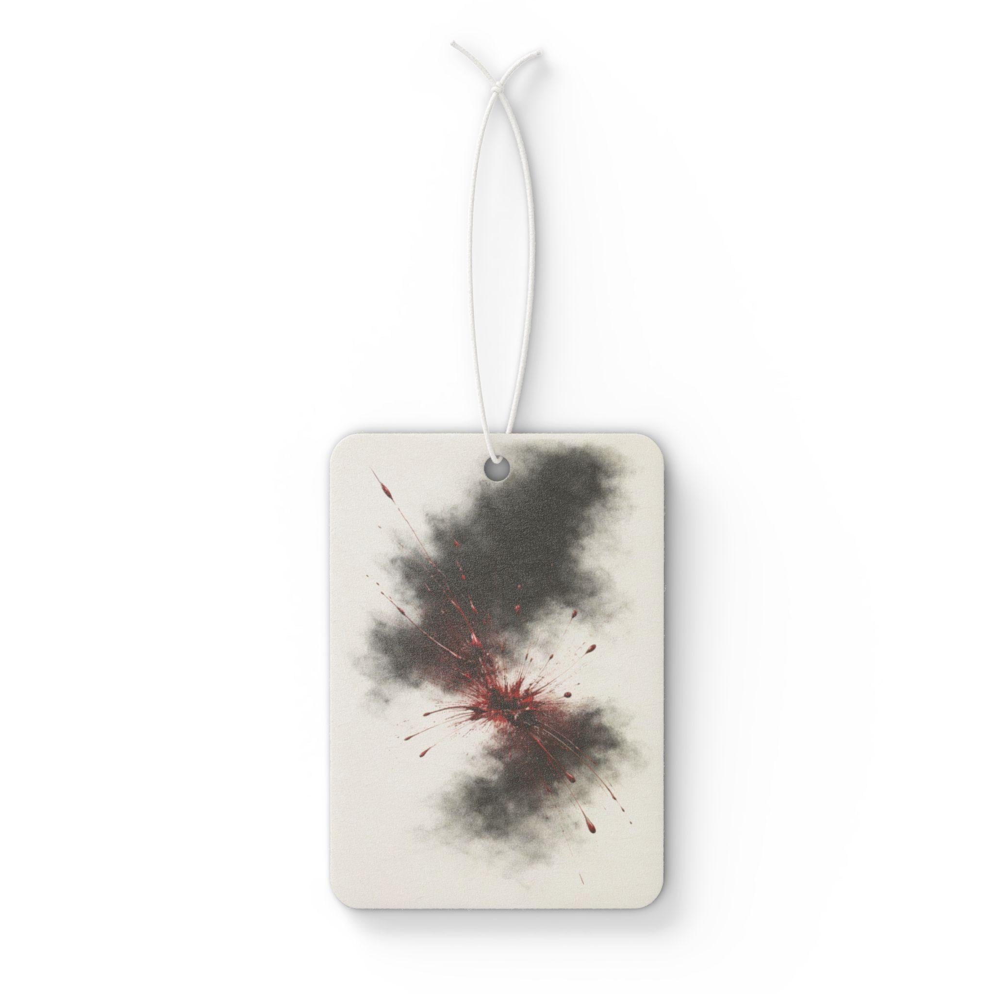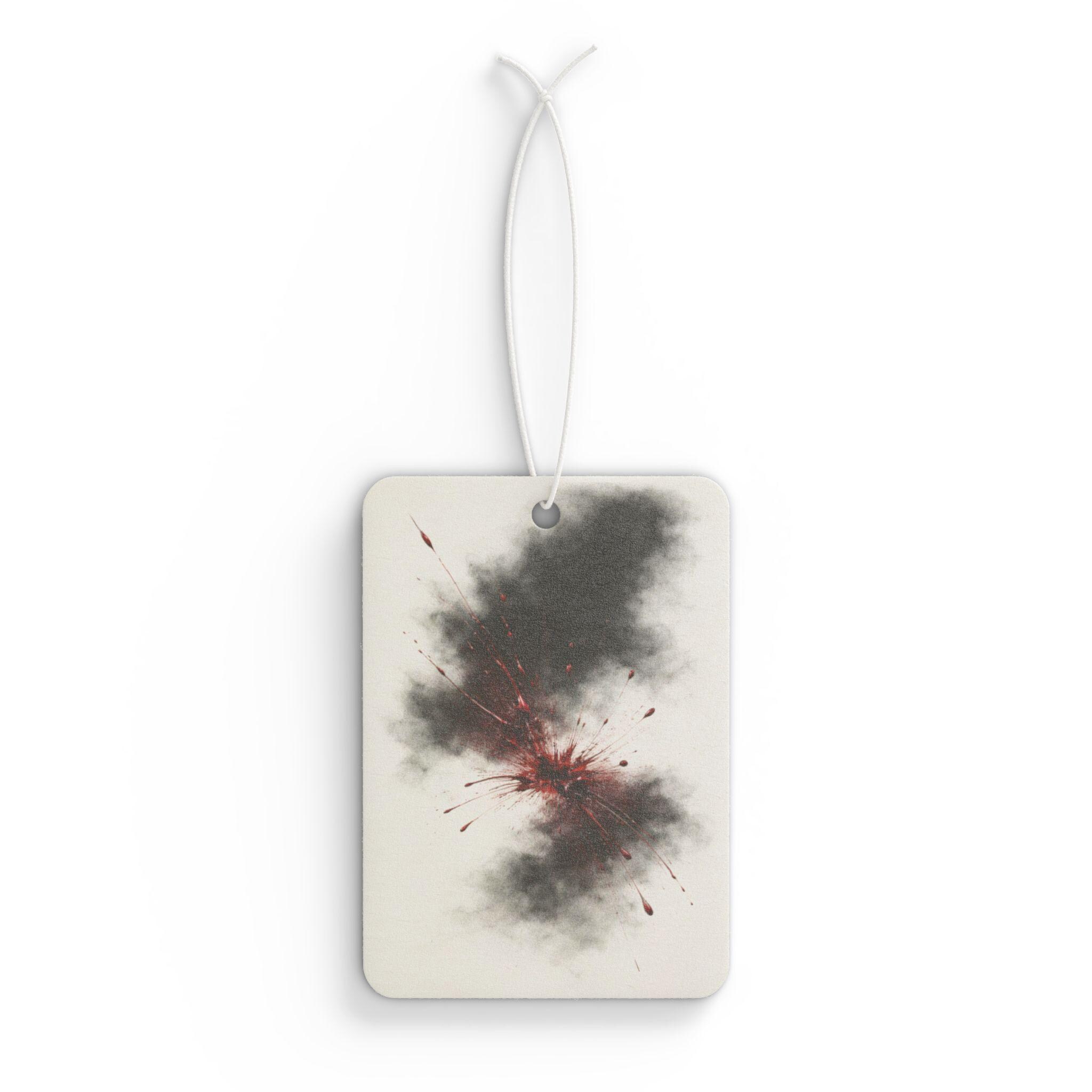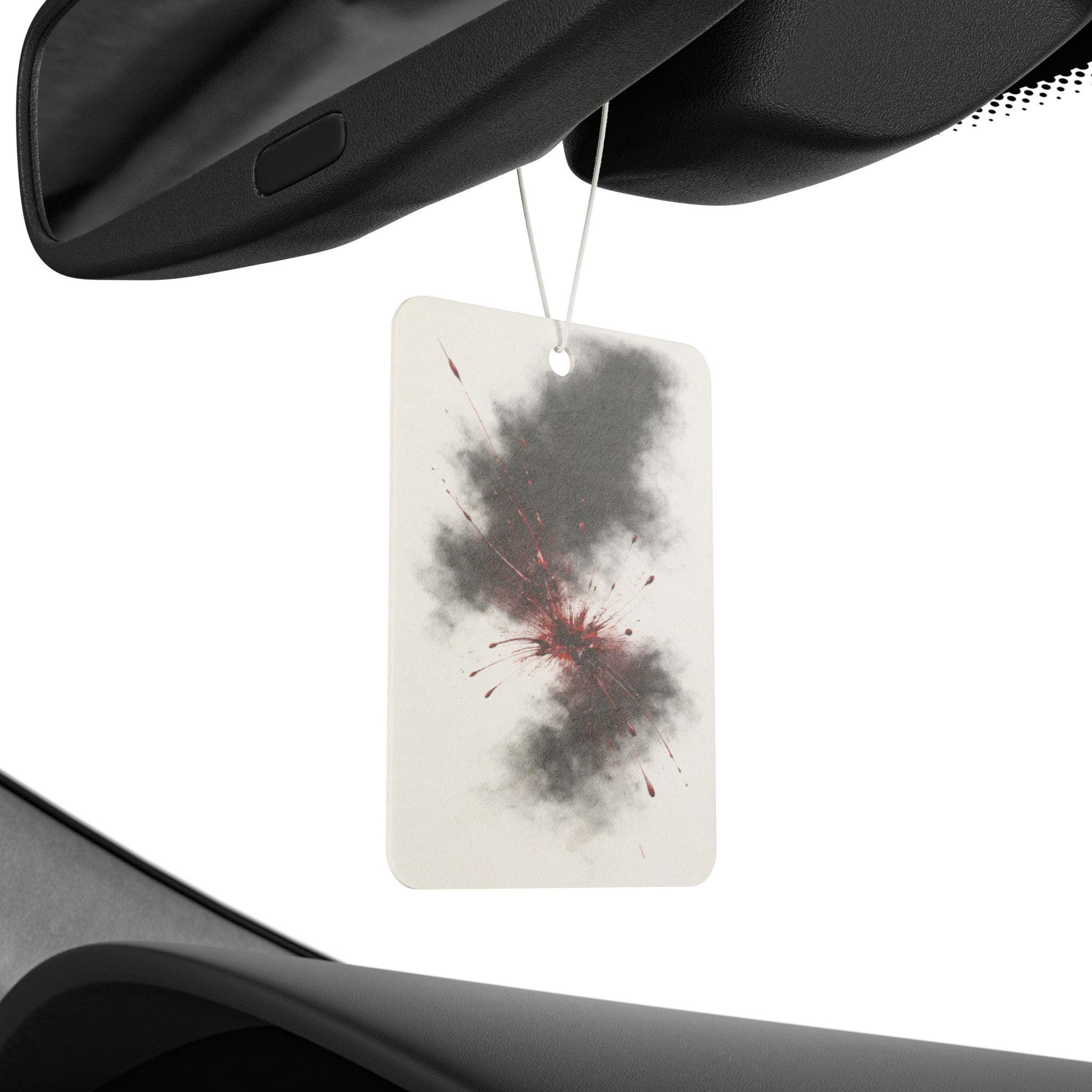 This car air freshener features a dark, smoky nebula with soft red blood accents — a minimal but powerful design that blends atmospheric darkness with a hint of mystery.