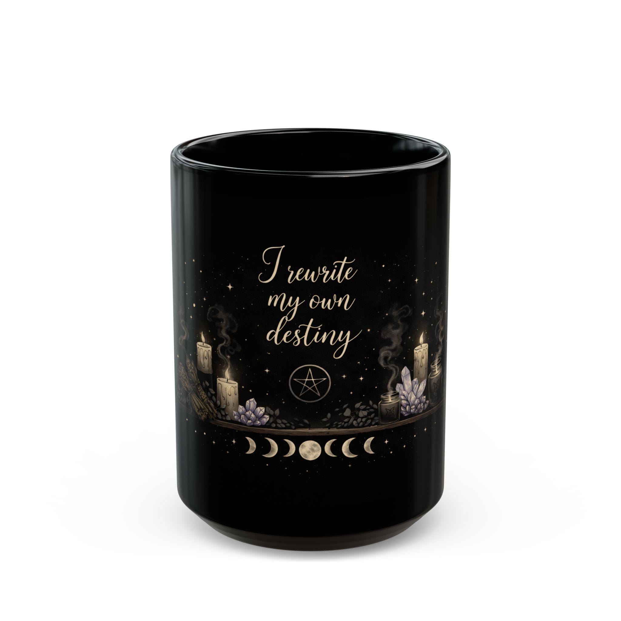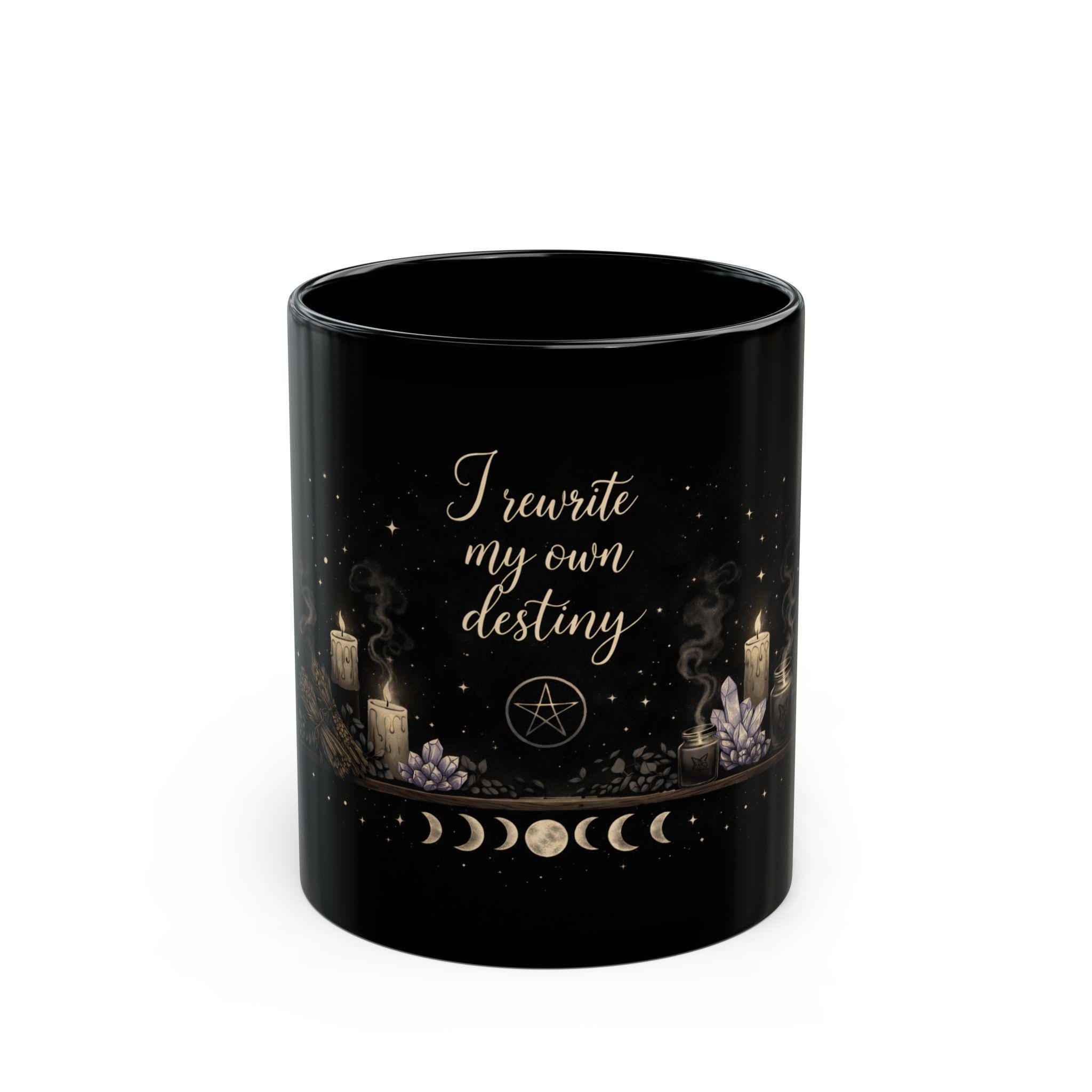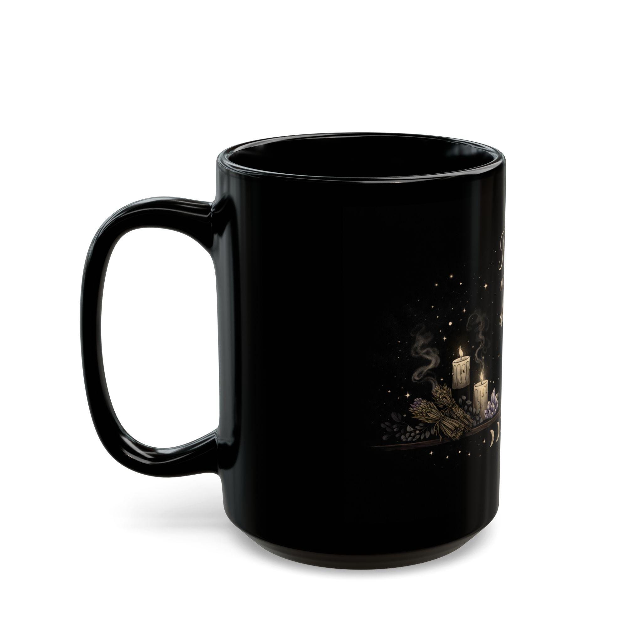 A mystical, high-quality black mug designed for witches, moon lovers, and anyone rewriting their own path.