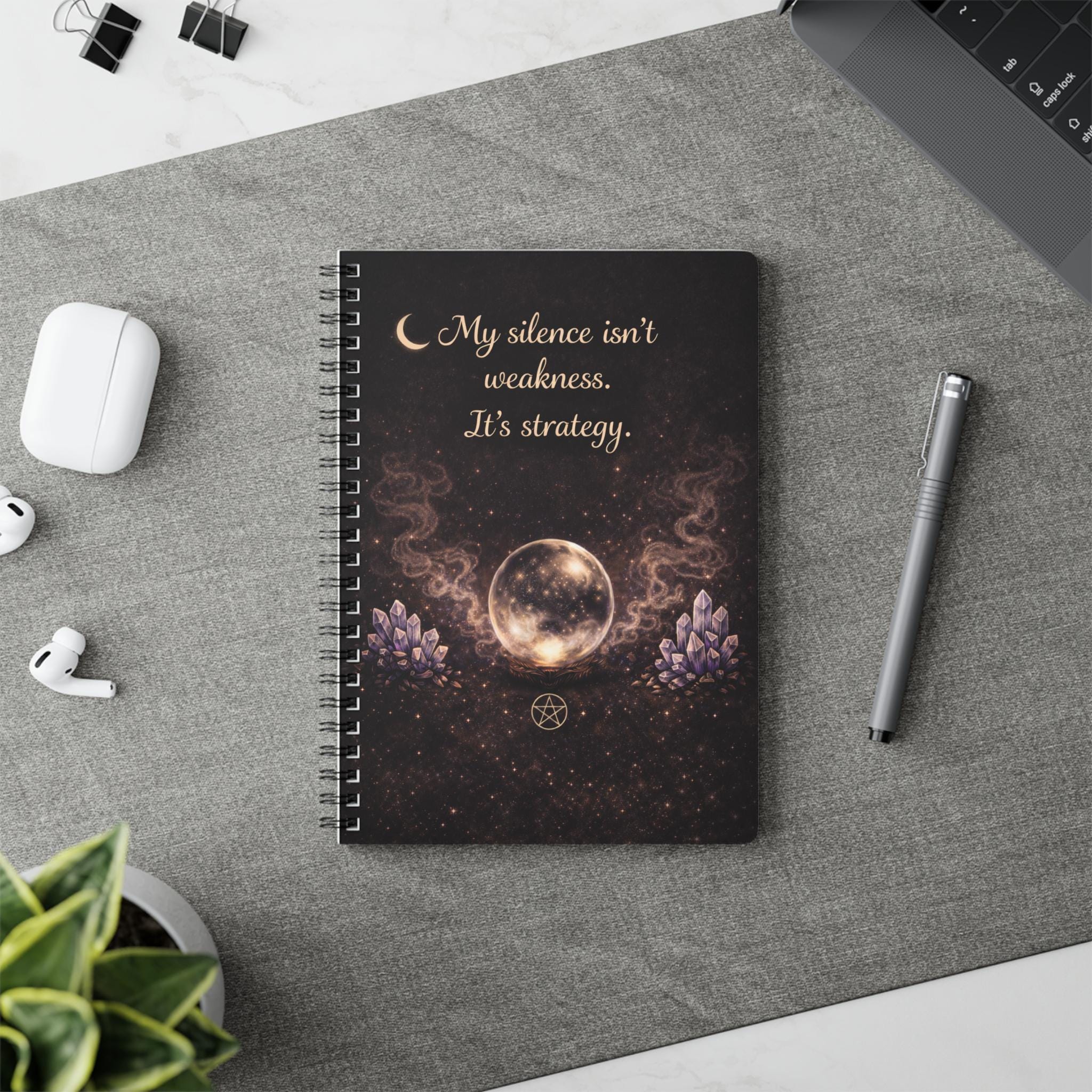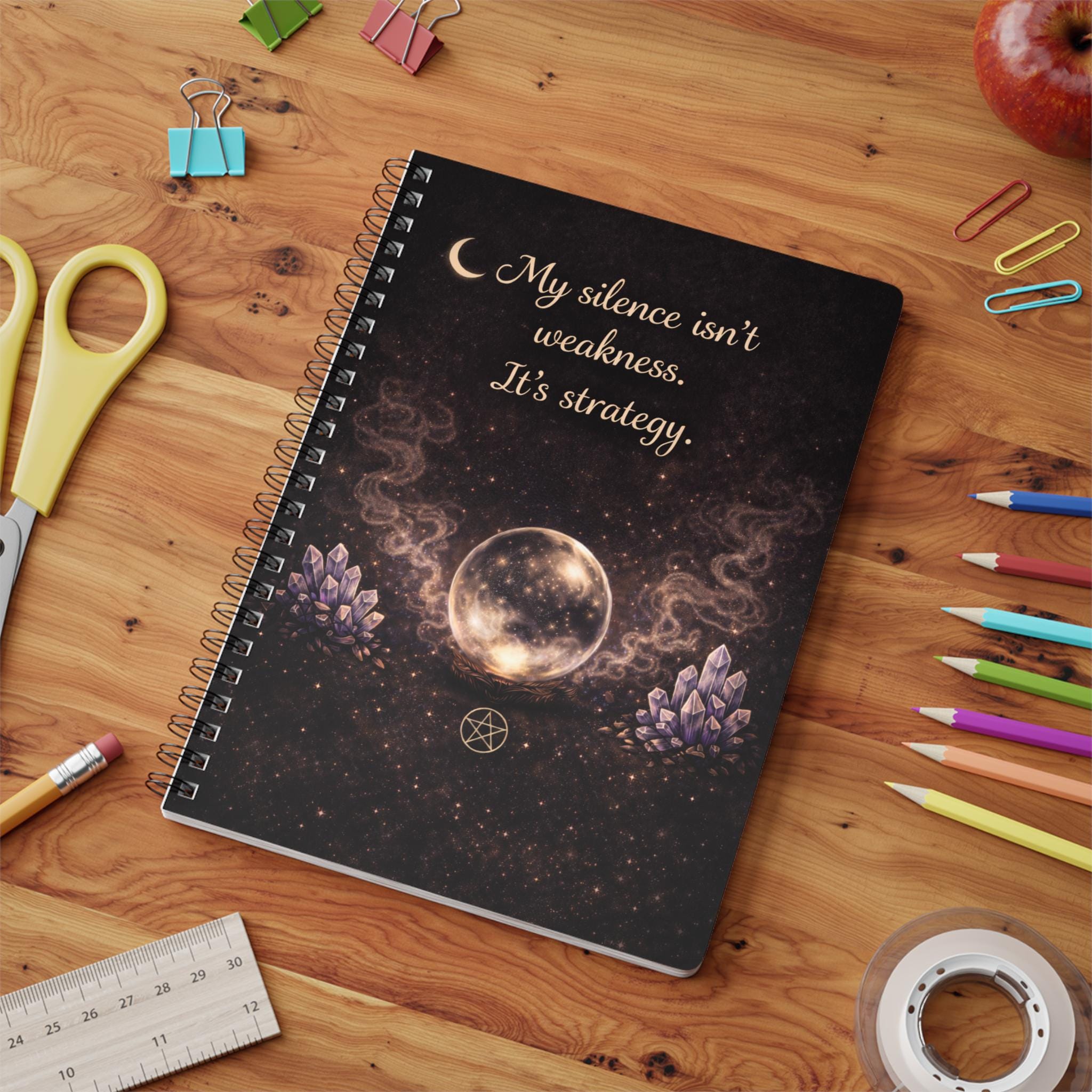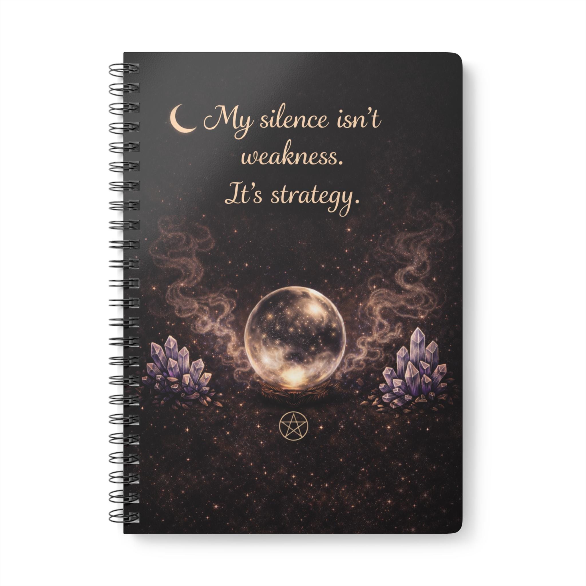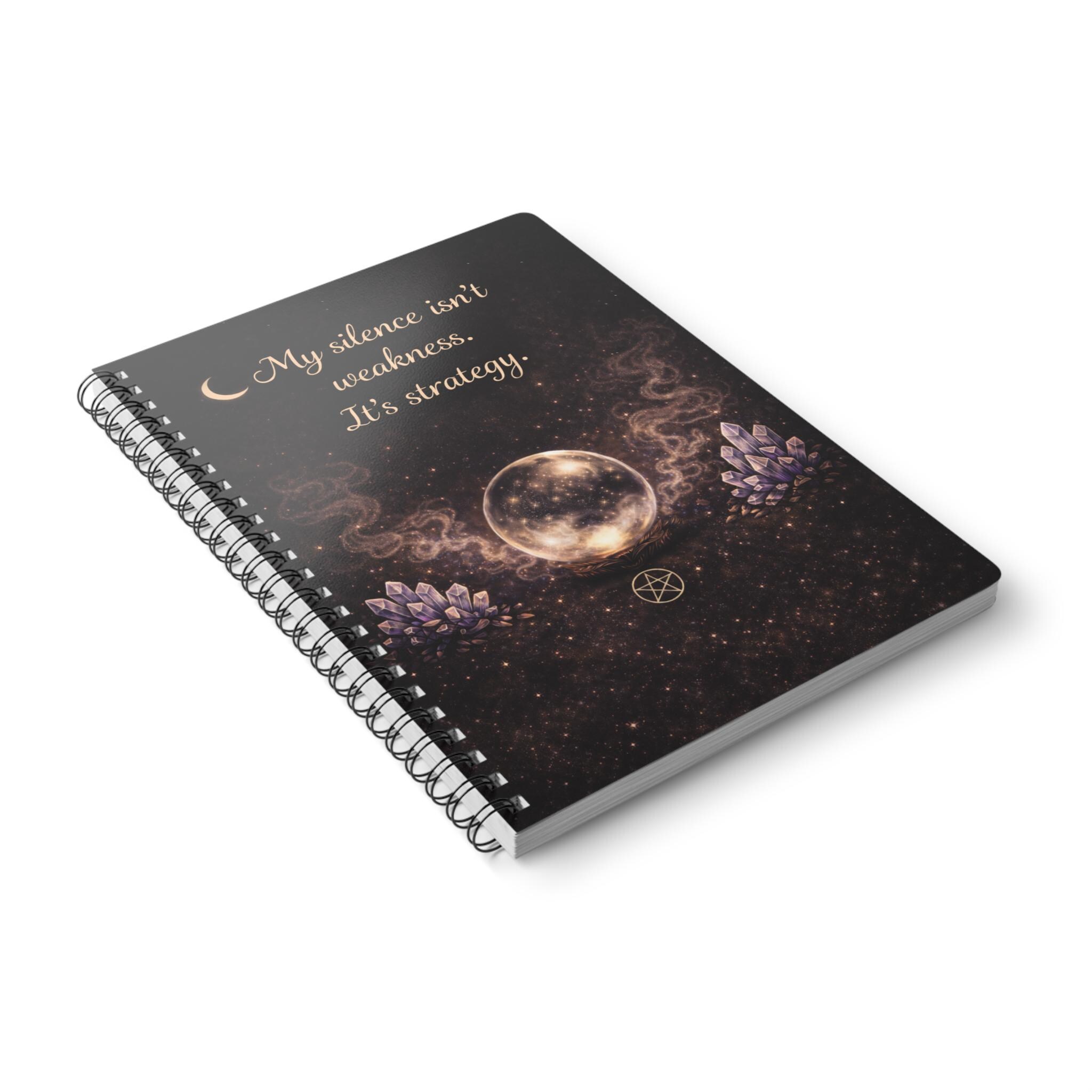 A powerful minimalist witchy notebook featuring a glowing crystal ball, lavender crystals, soft smoke and a deep celestial background.