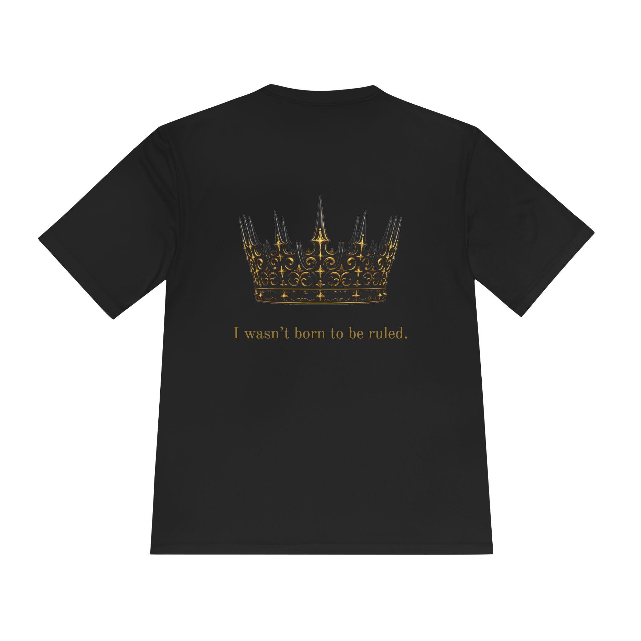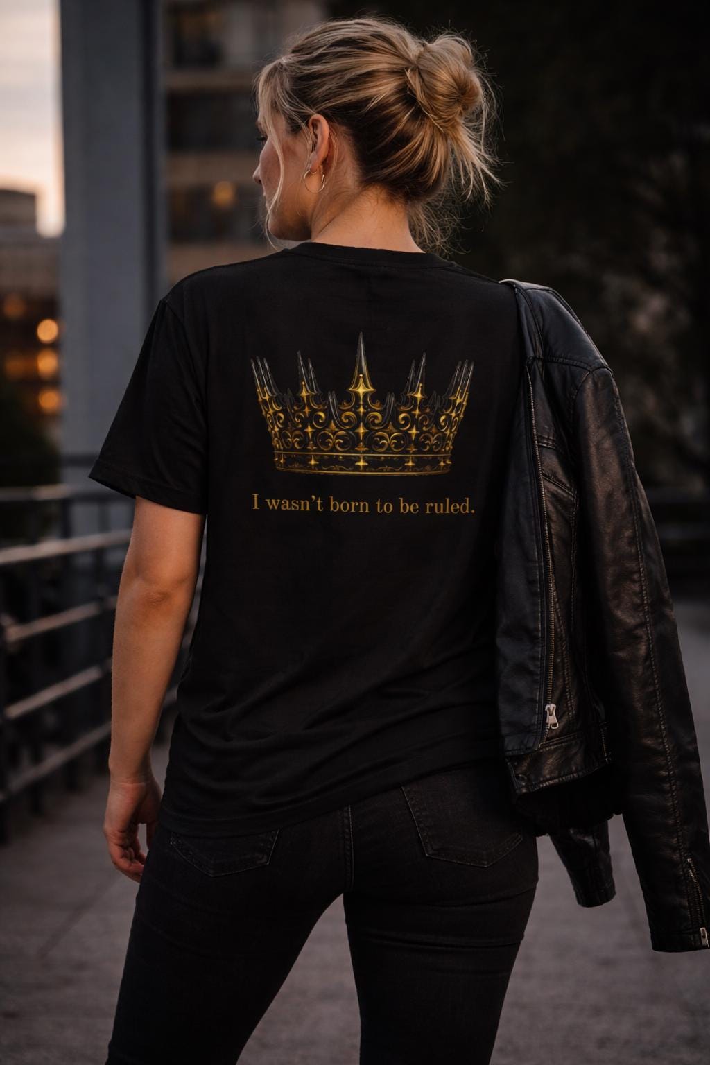 This black t-shirt features an ornate gold crown paired with the powerful quote