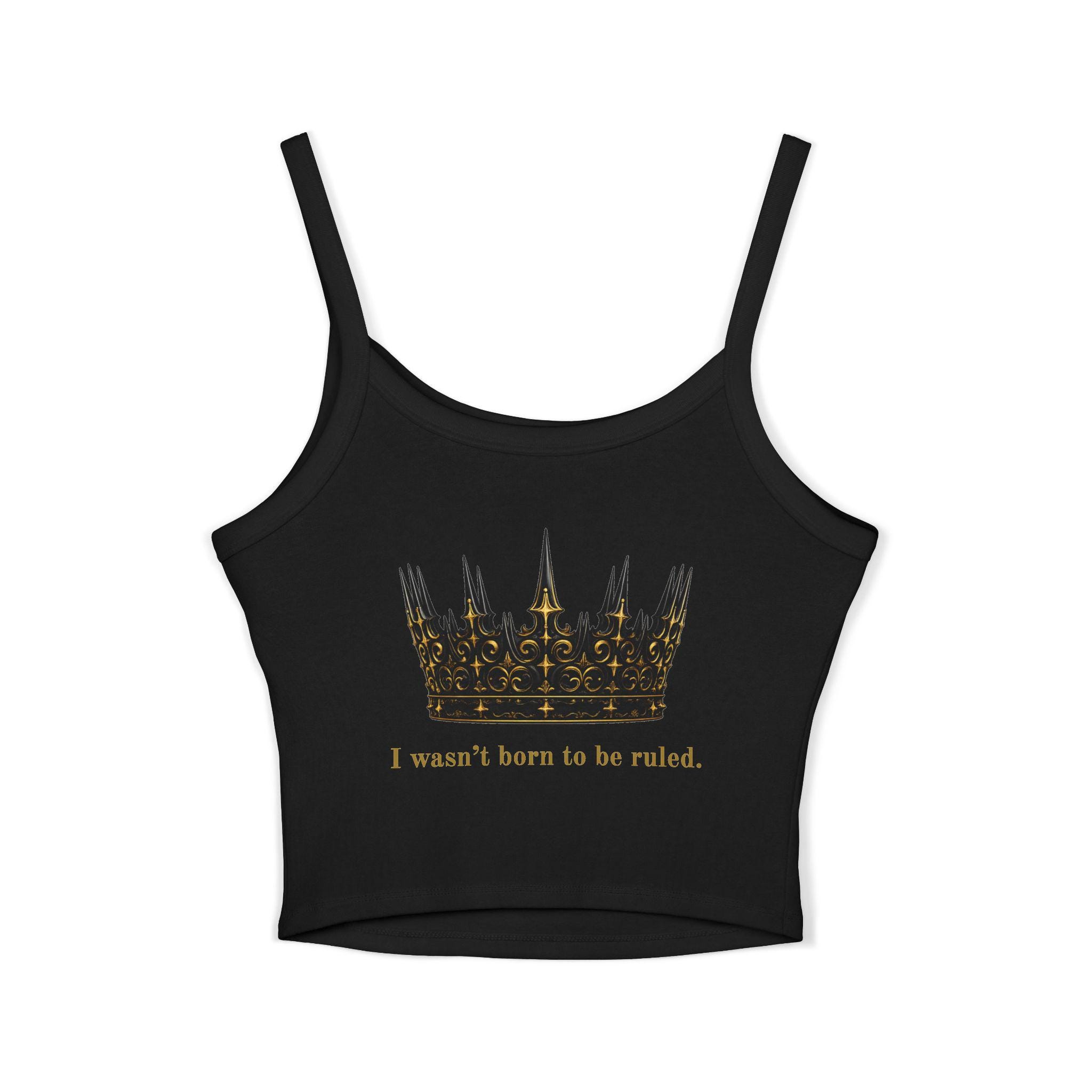 This black tank top features an ornate gold crown paired with the bold quote
