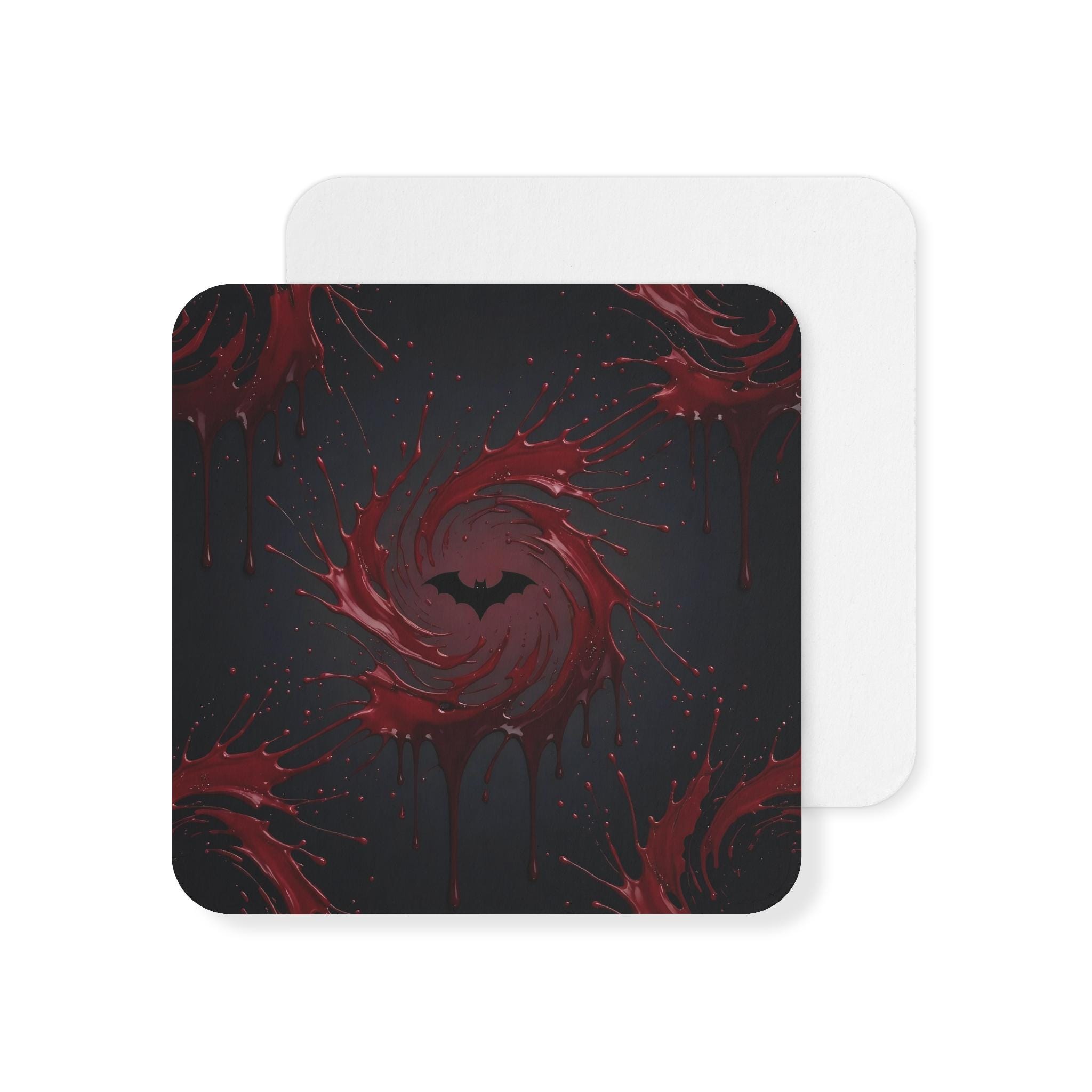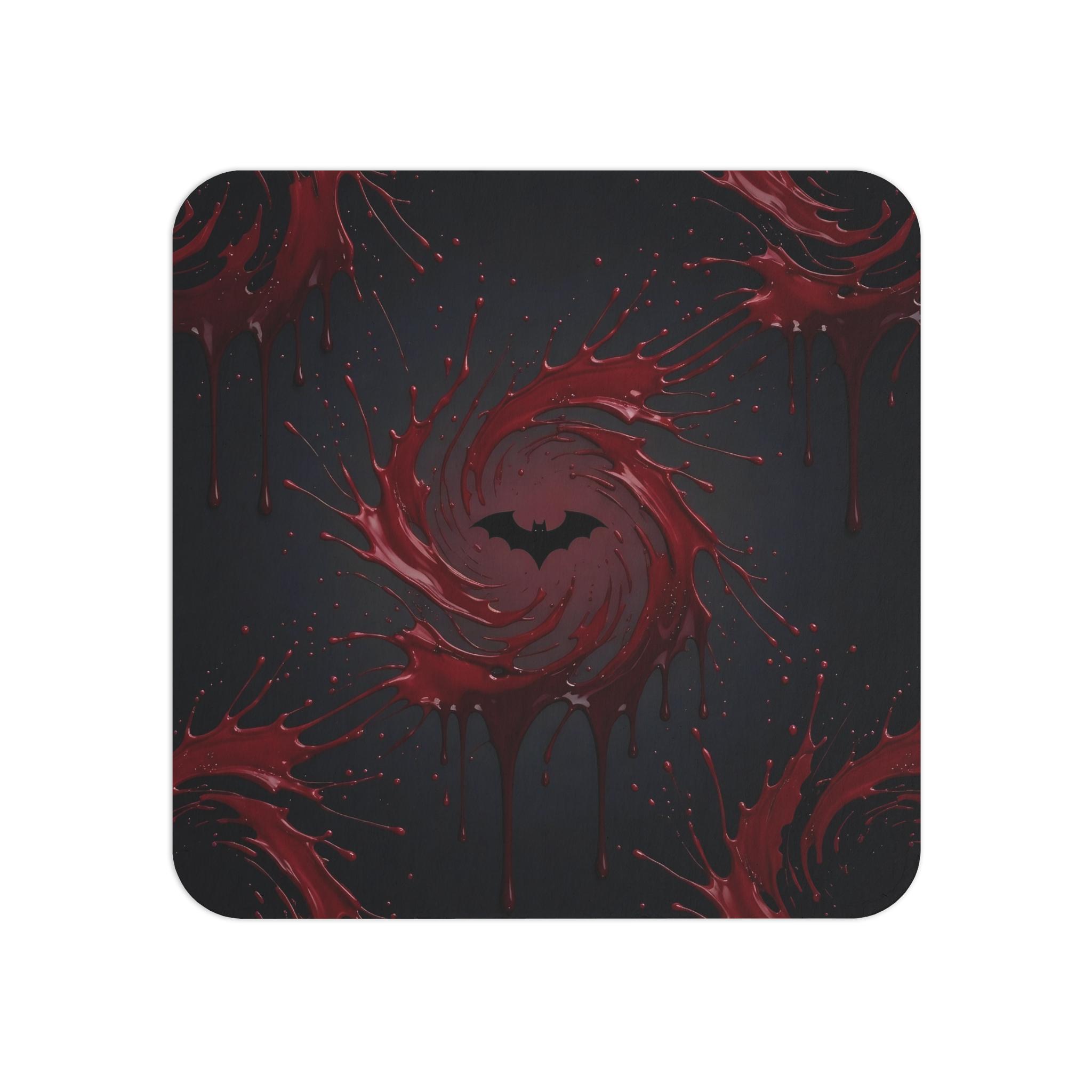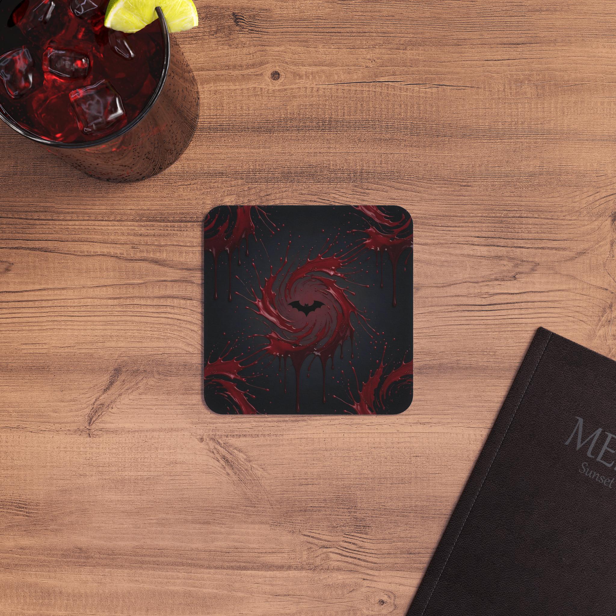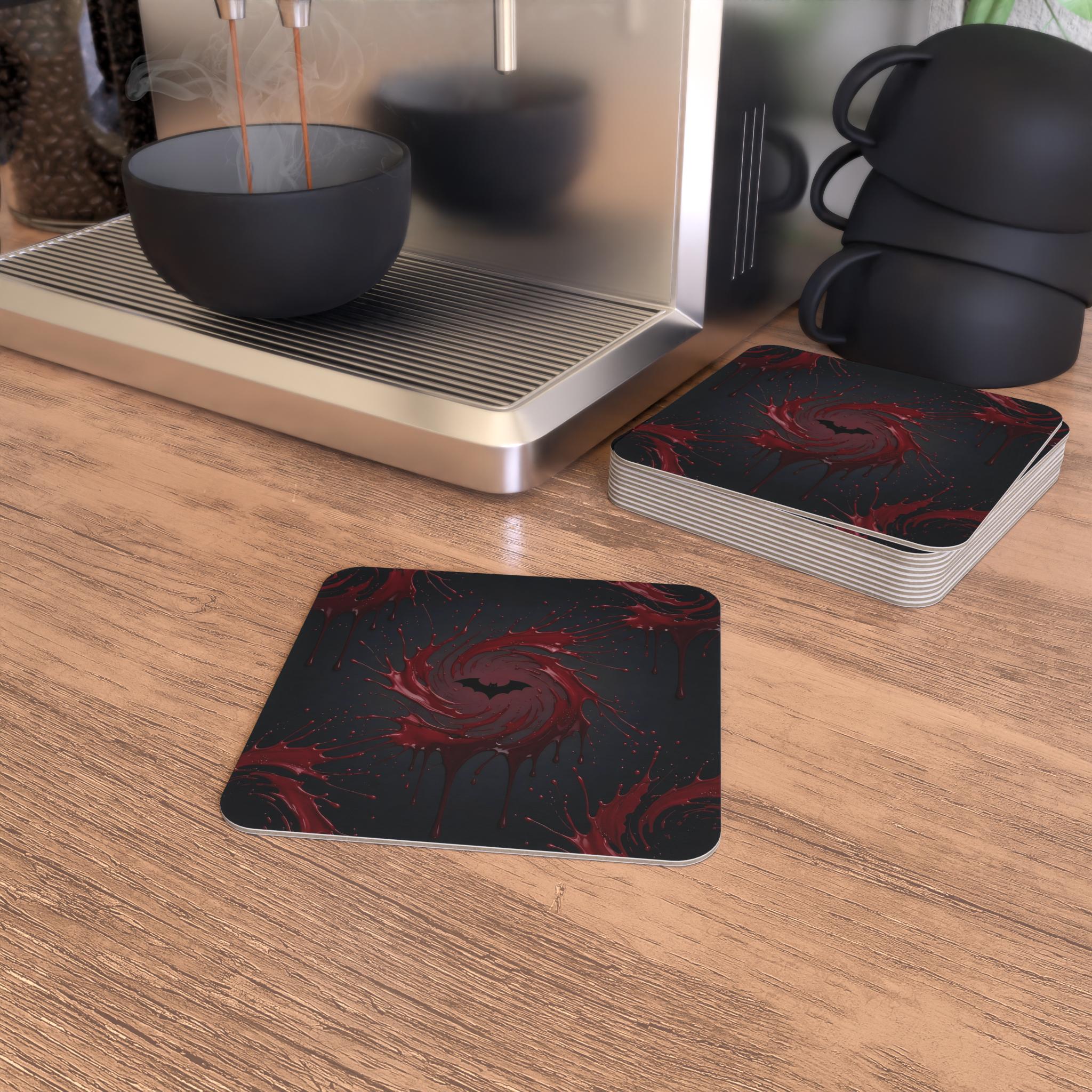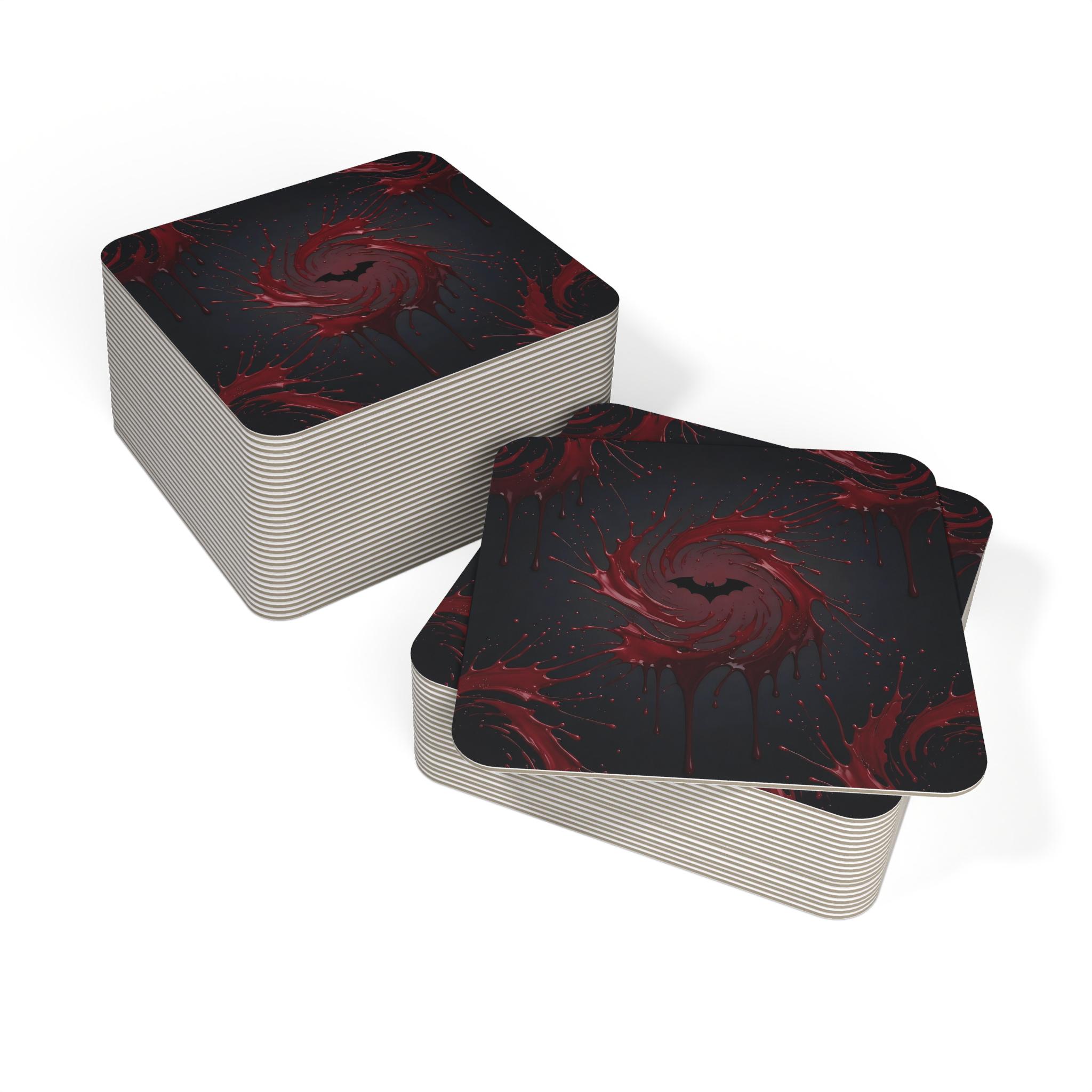 Featuring a swirling blood-red splash with a black bat silhouette, these coasters instantly turn any drink into a dramatic moment.