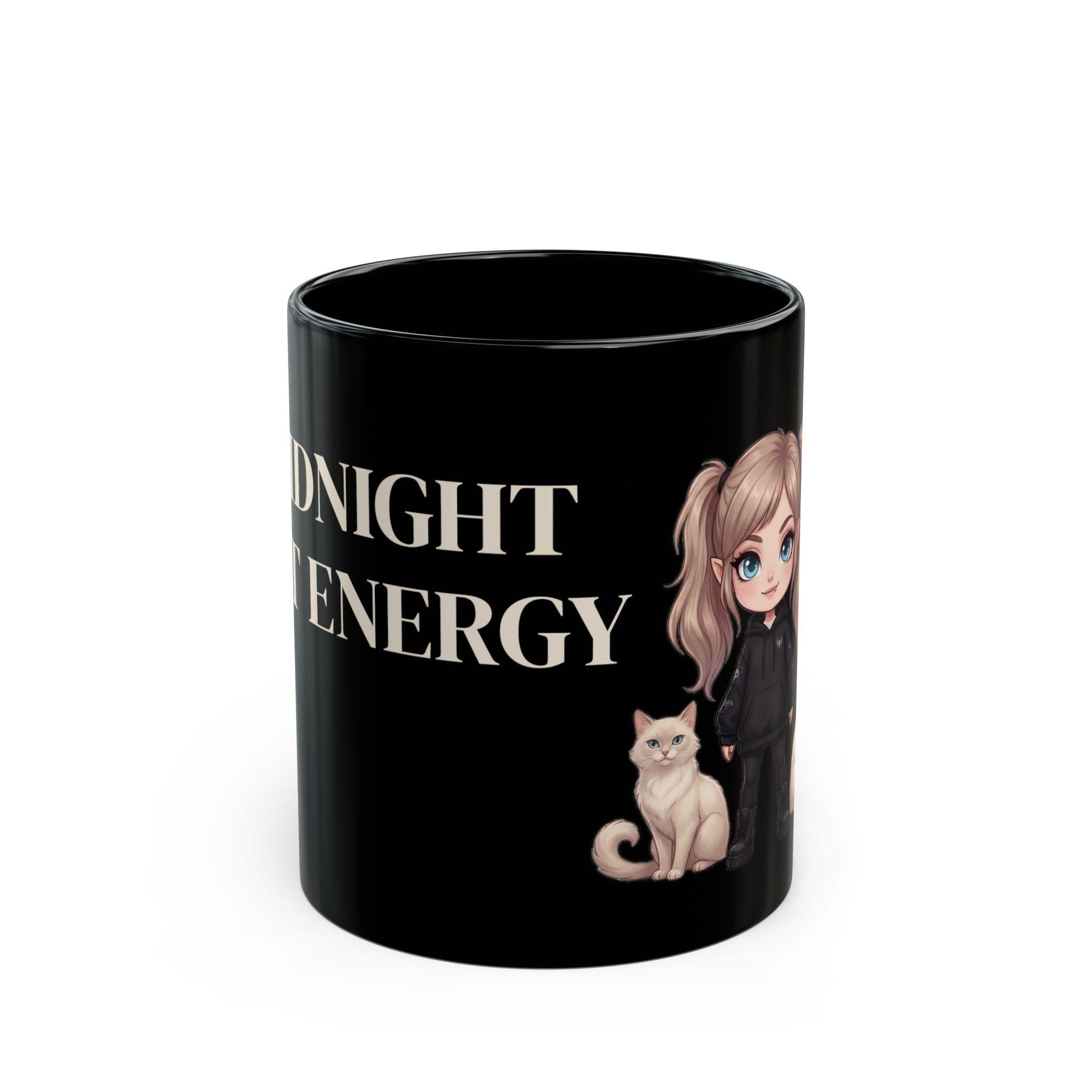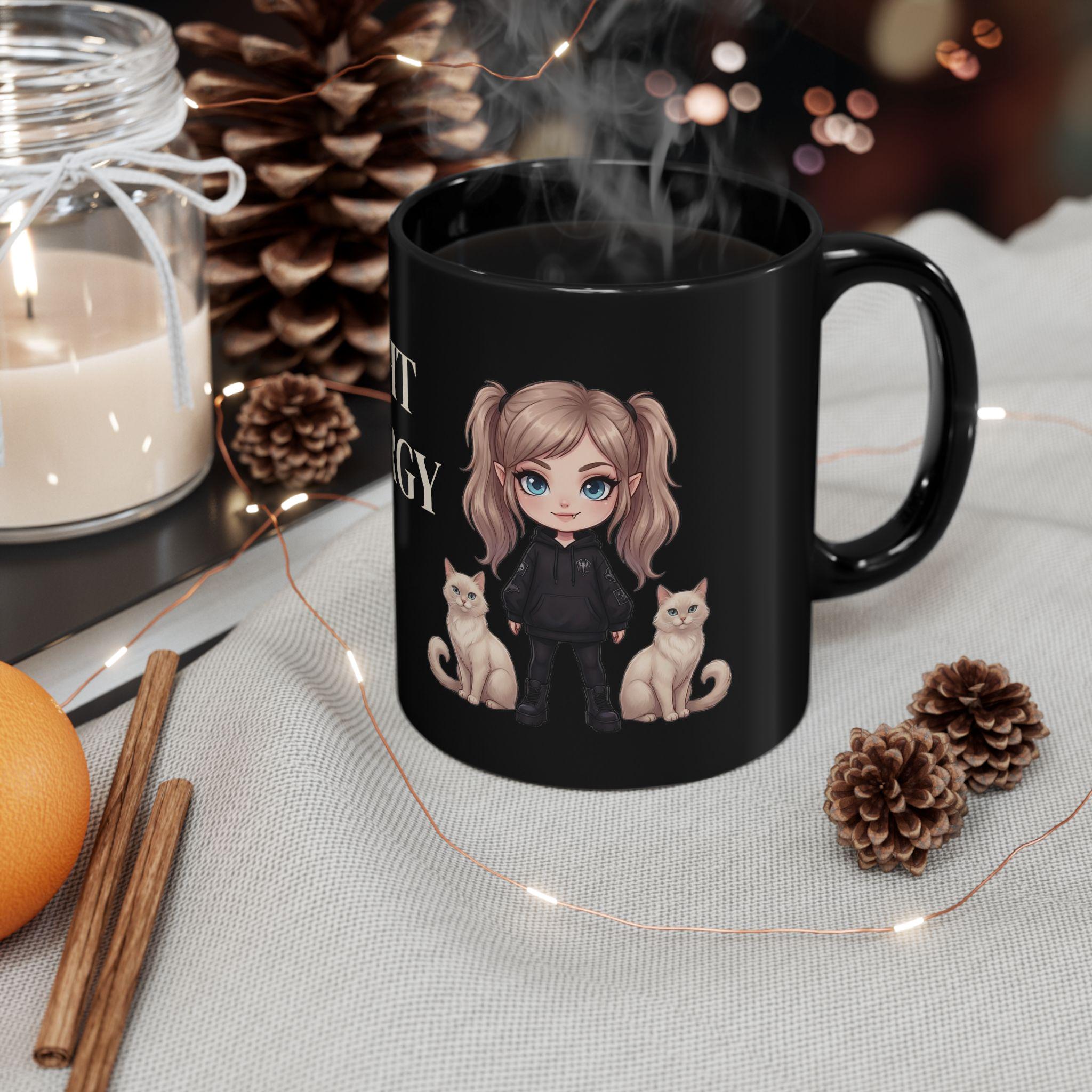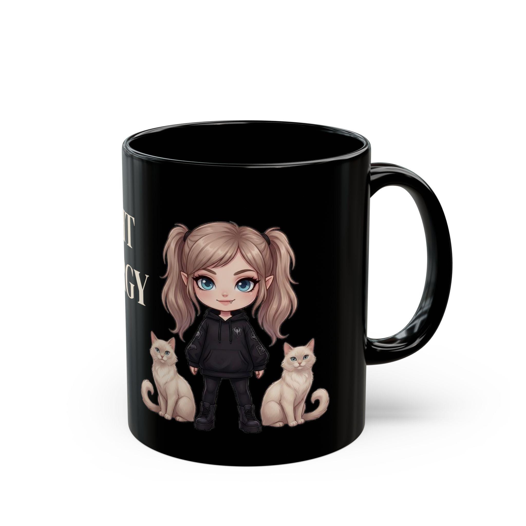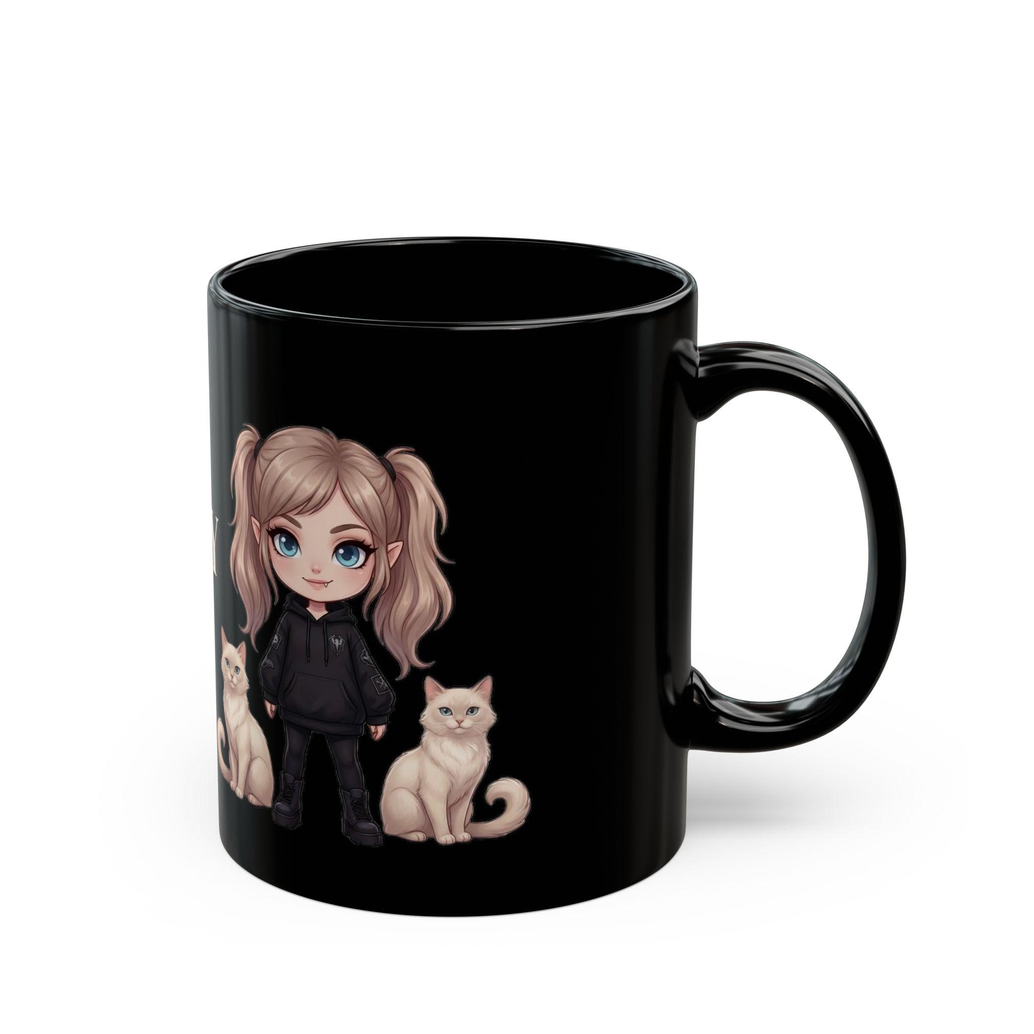 This black ceramic mug features a dark aesthetic vampire girl with her two cats — confident, calm and a little mysterious.