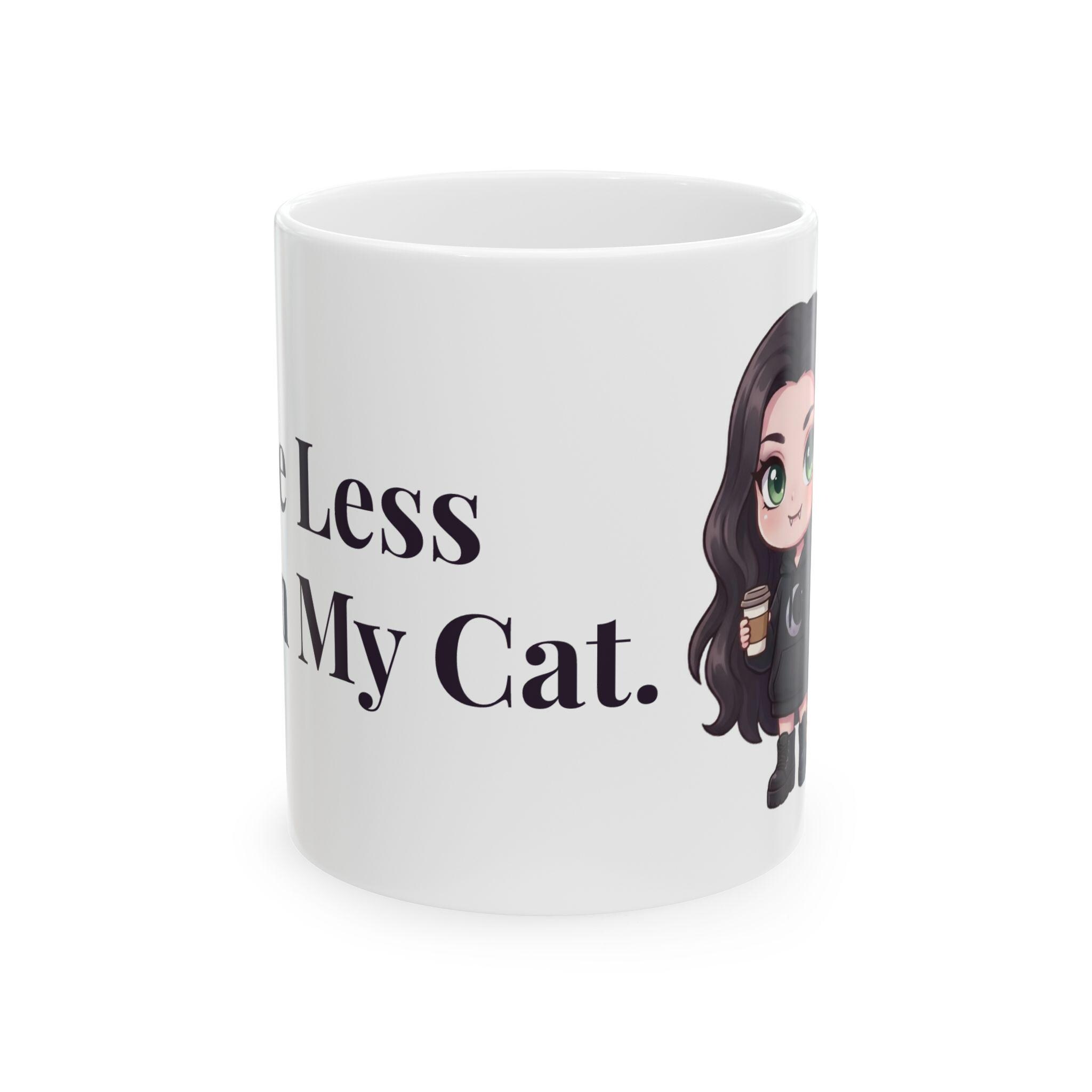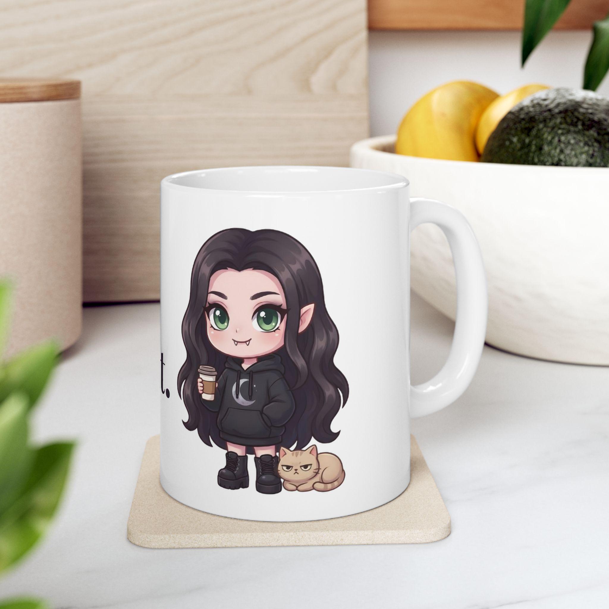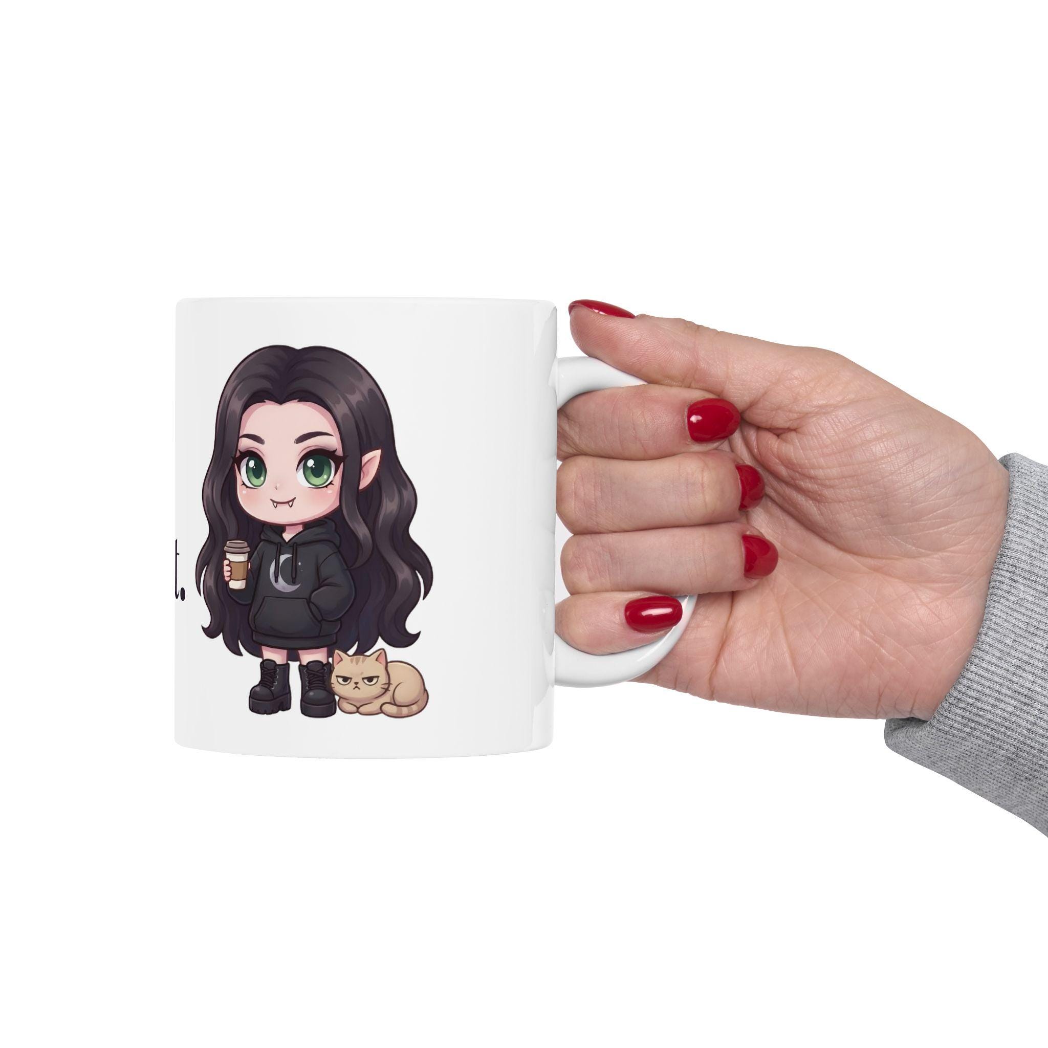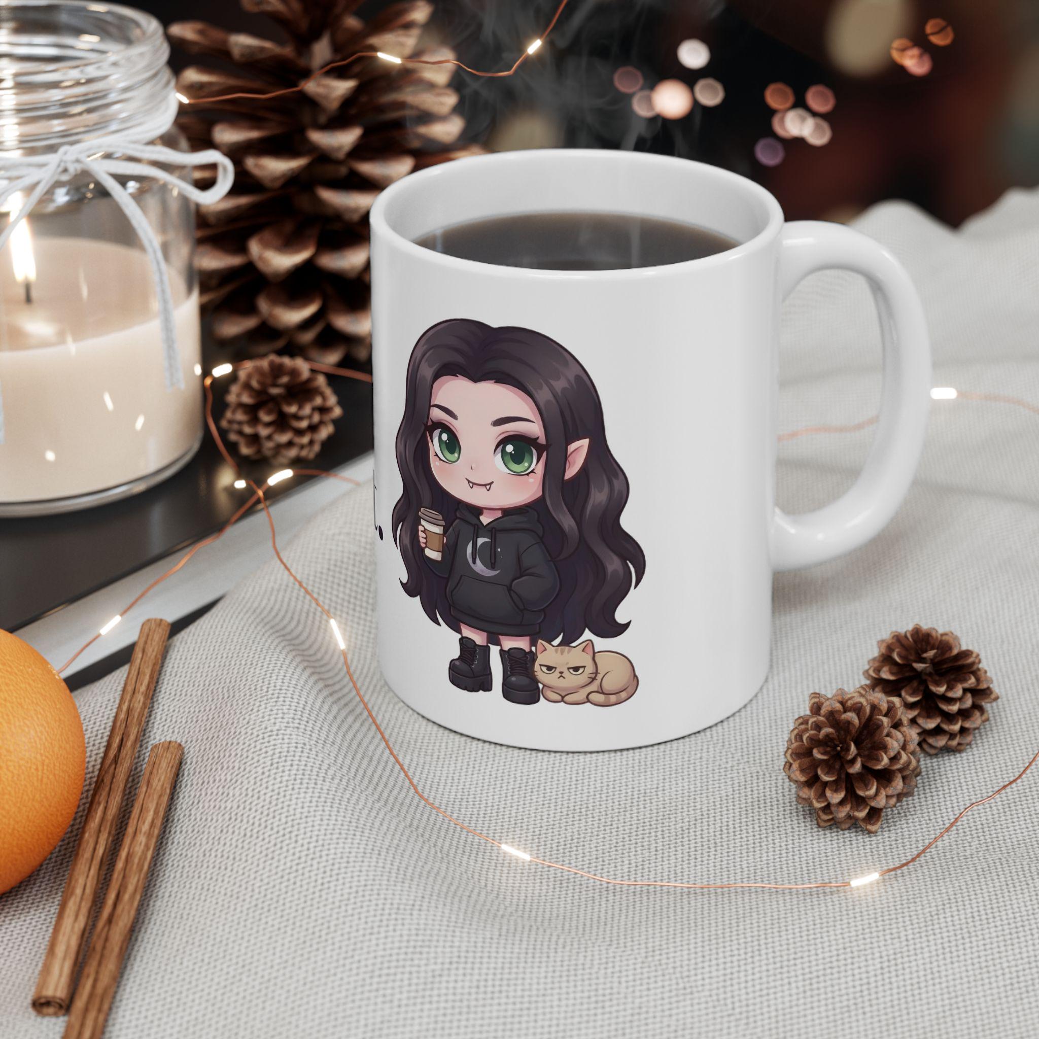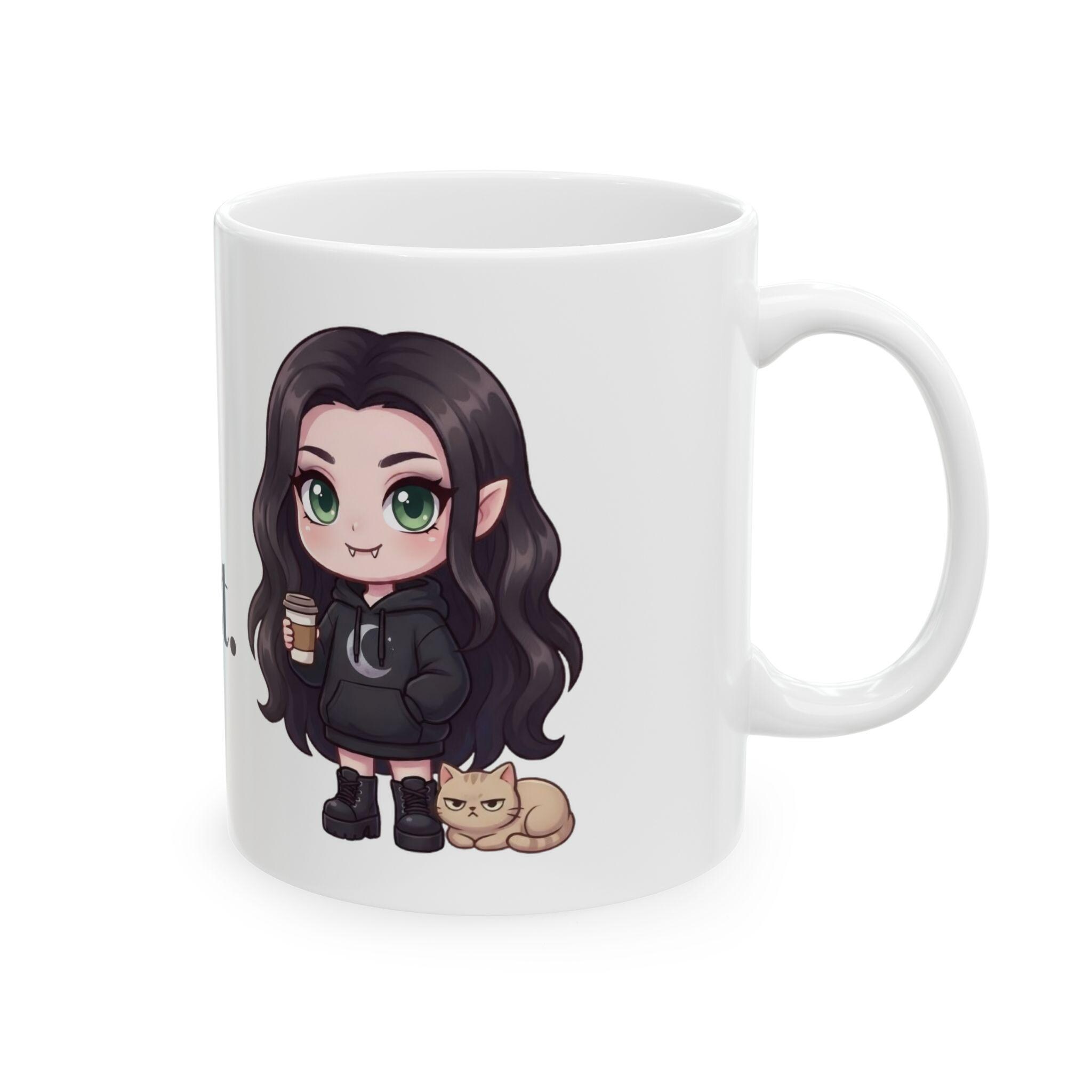 This white ceramic mug features a cute vampire girl with tiny visible fangs, holding her coffee while her grumpy cat sits next to her. Perfect for cat moms with a dark sense of humor and a strong coffee dependency.