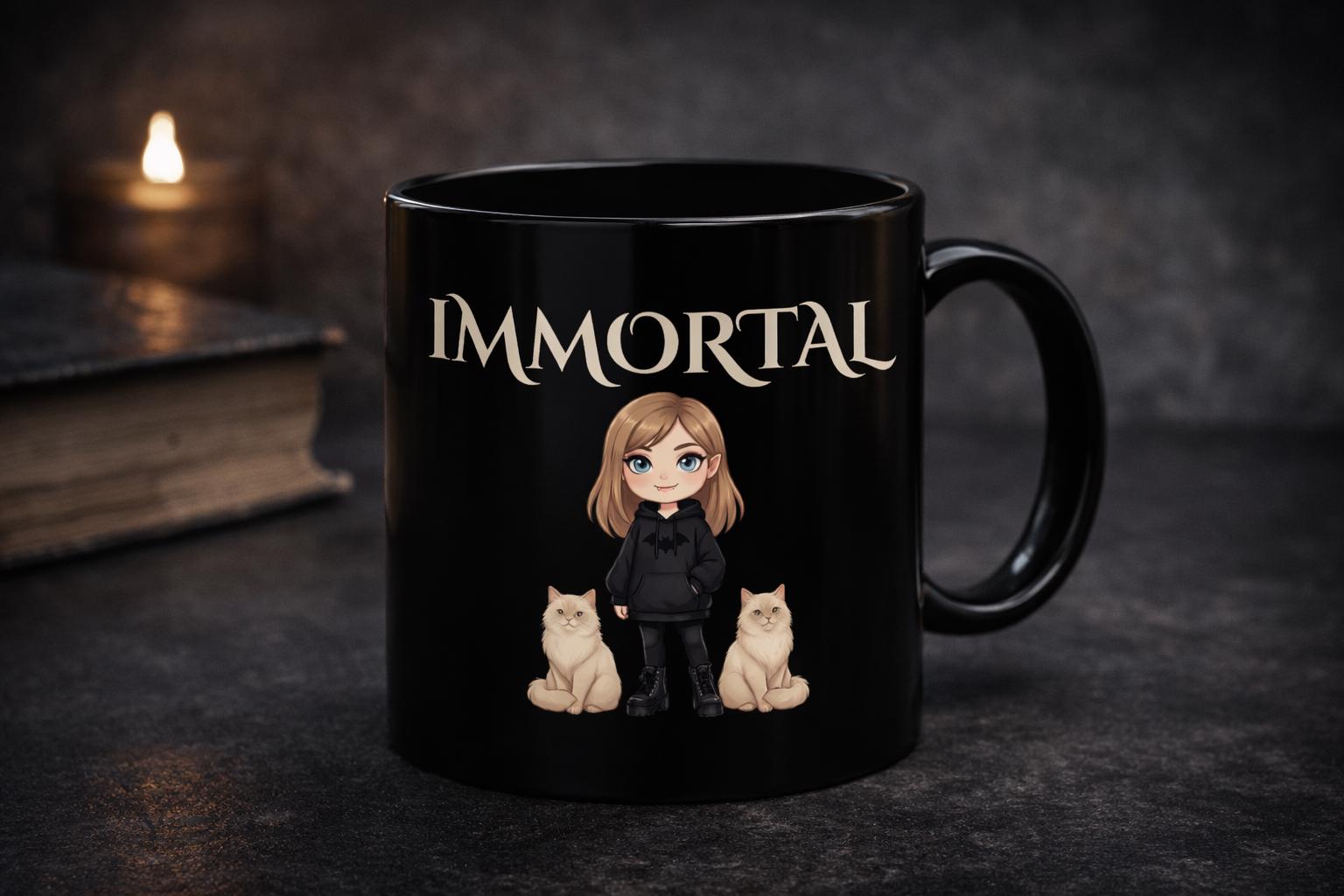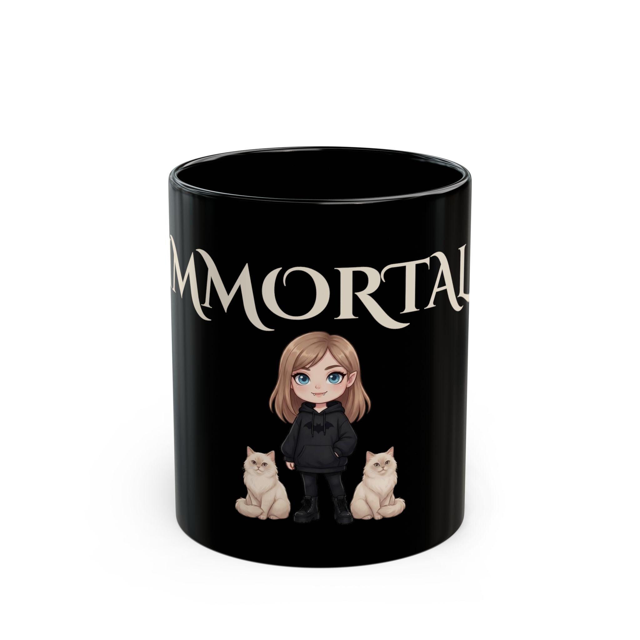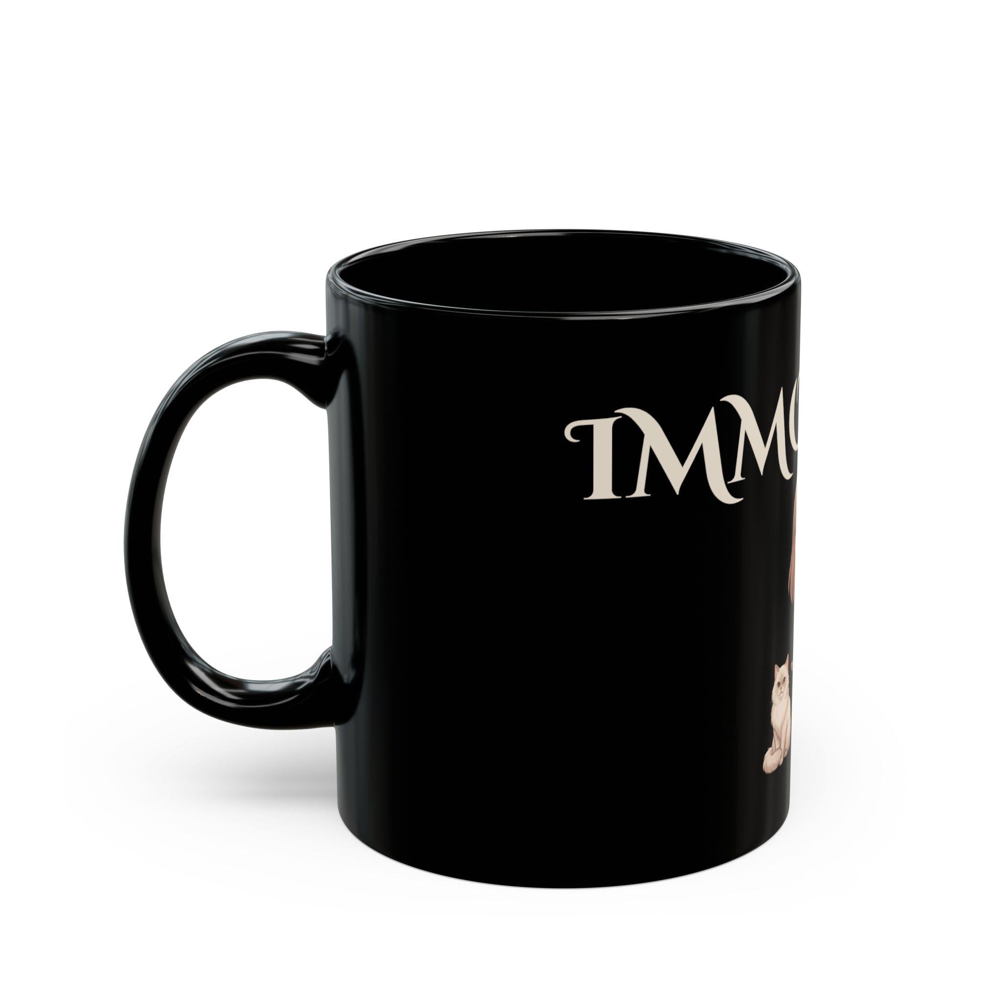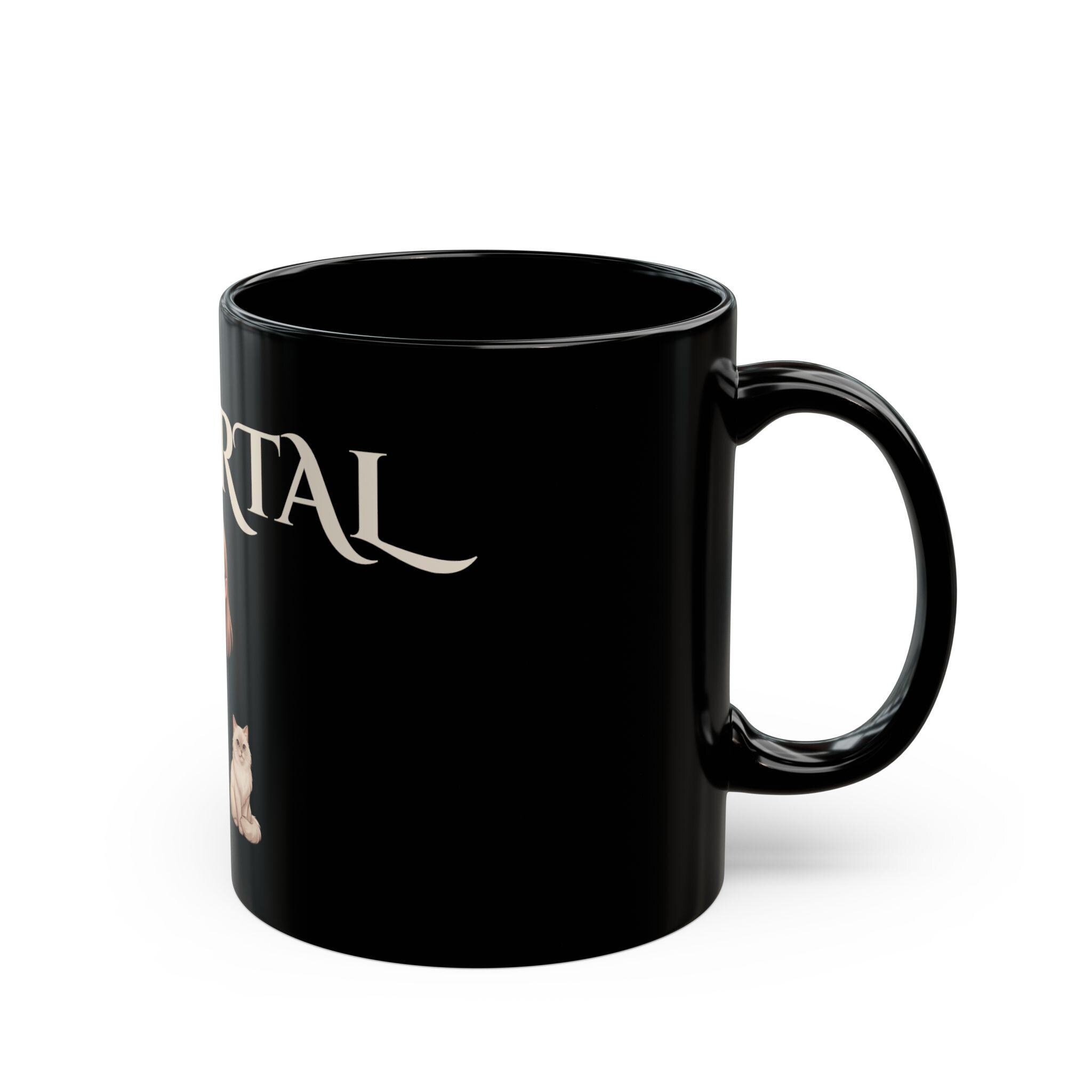 This glossy black 11oz mug features a bold statement and a dark little queen standing with her loyal feline guardians.