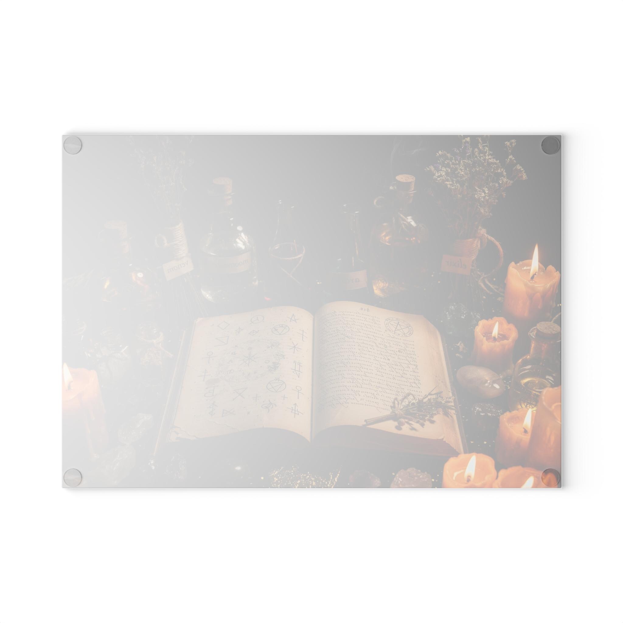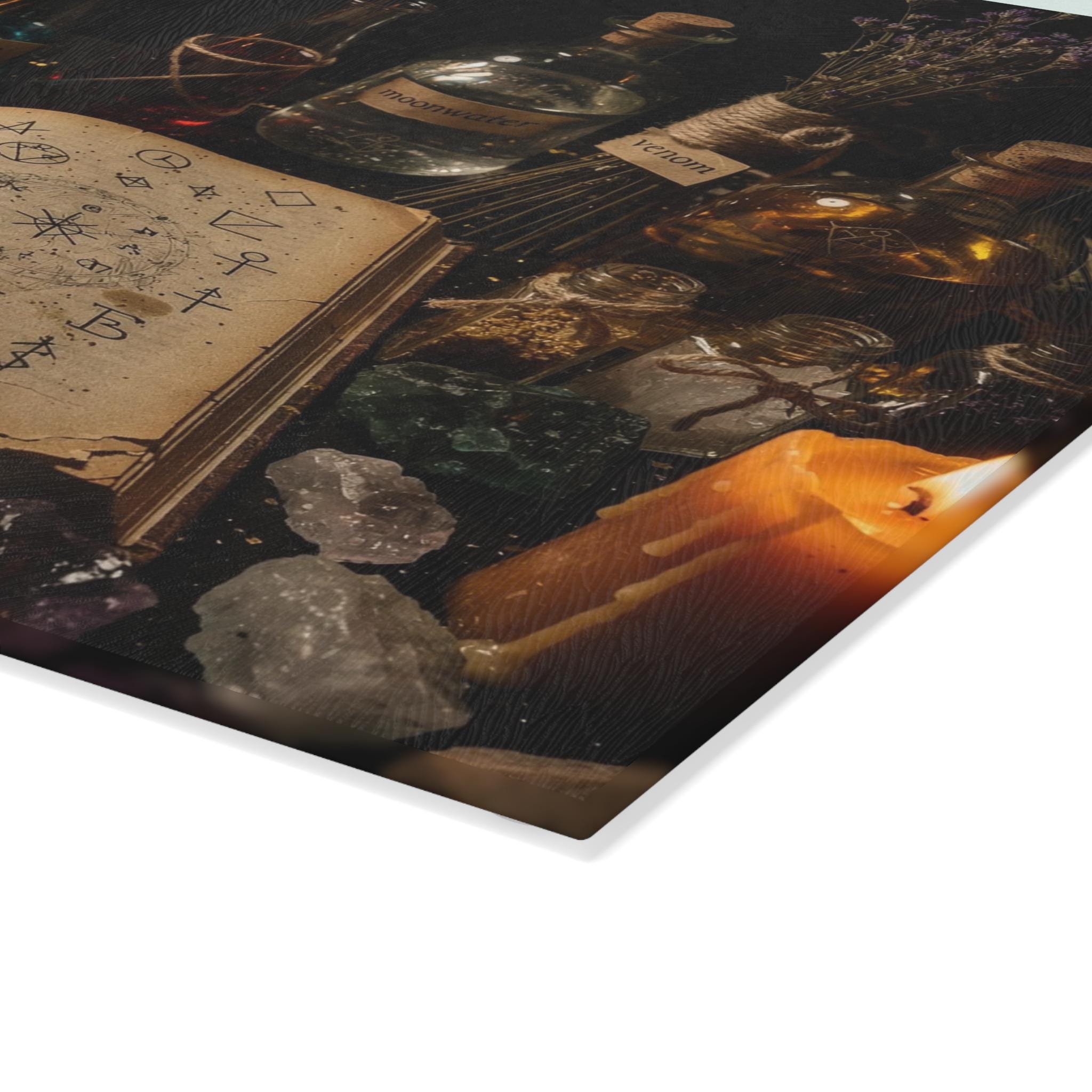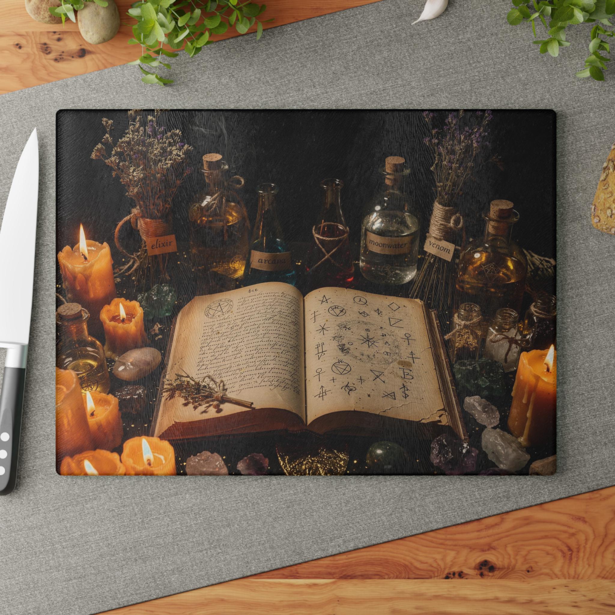 Transform your kitchen into a mystical workspace with this witchy glass cutting board, featuring a dark alchemy setup, glowing candles, potion bottles and an ancient spellbook.