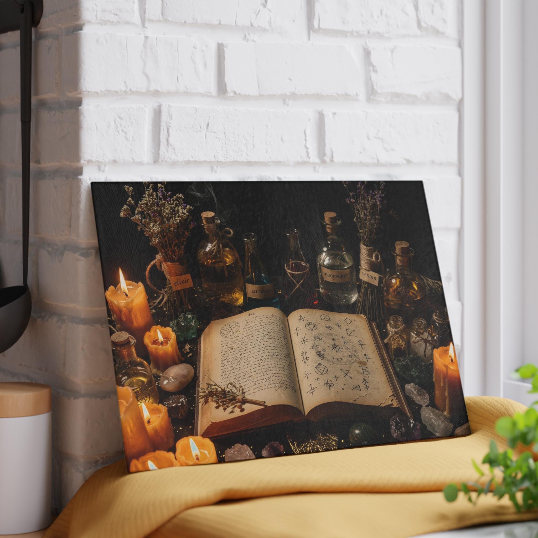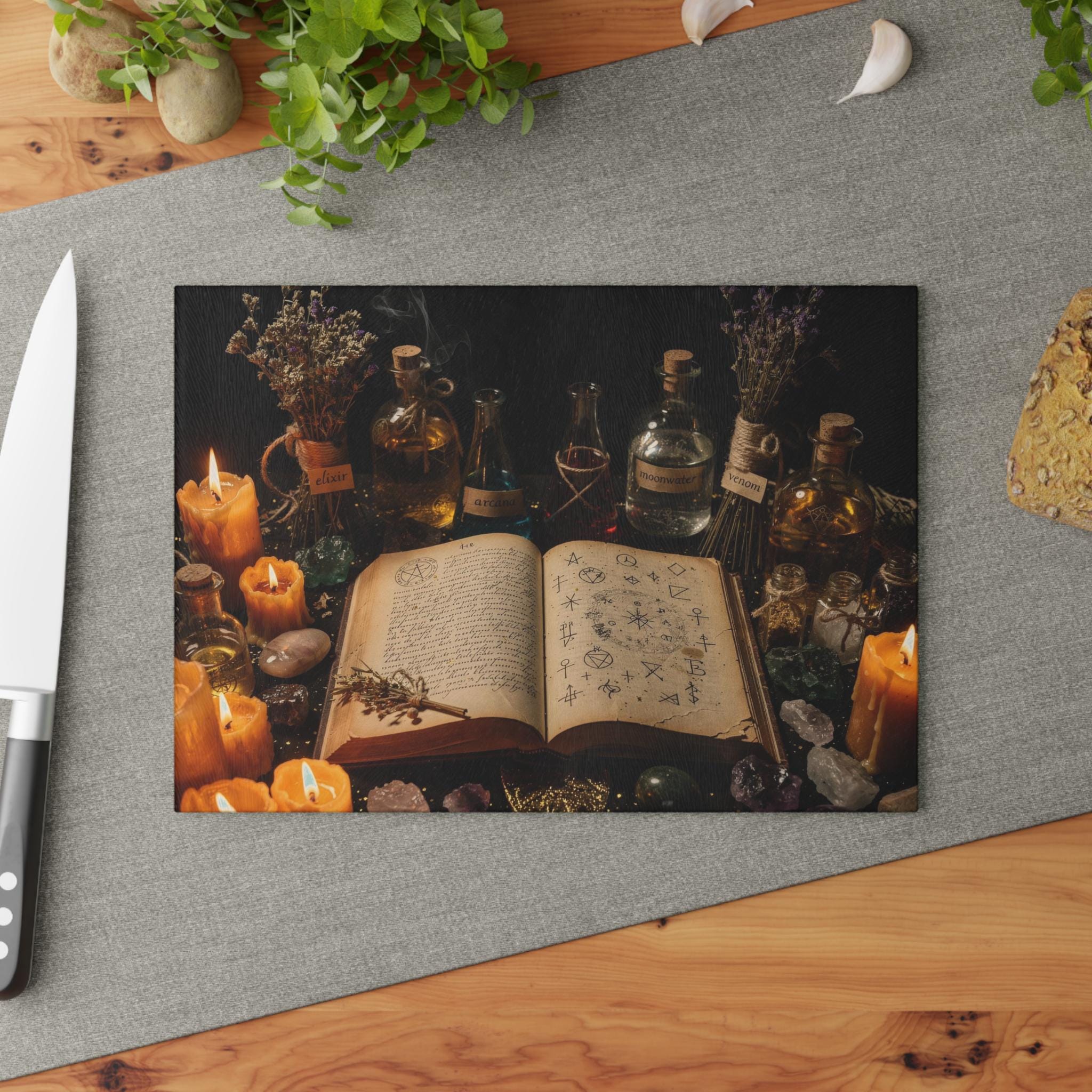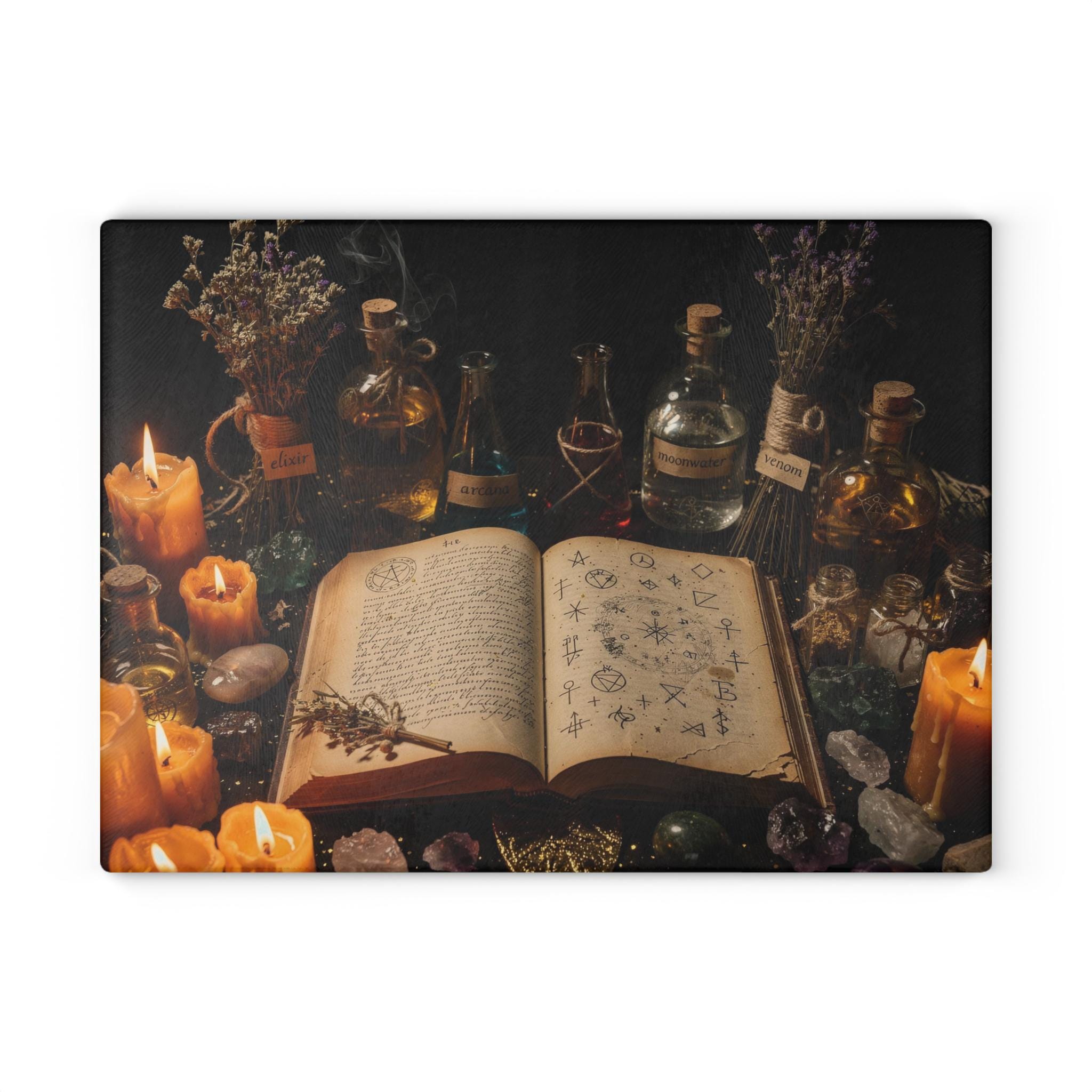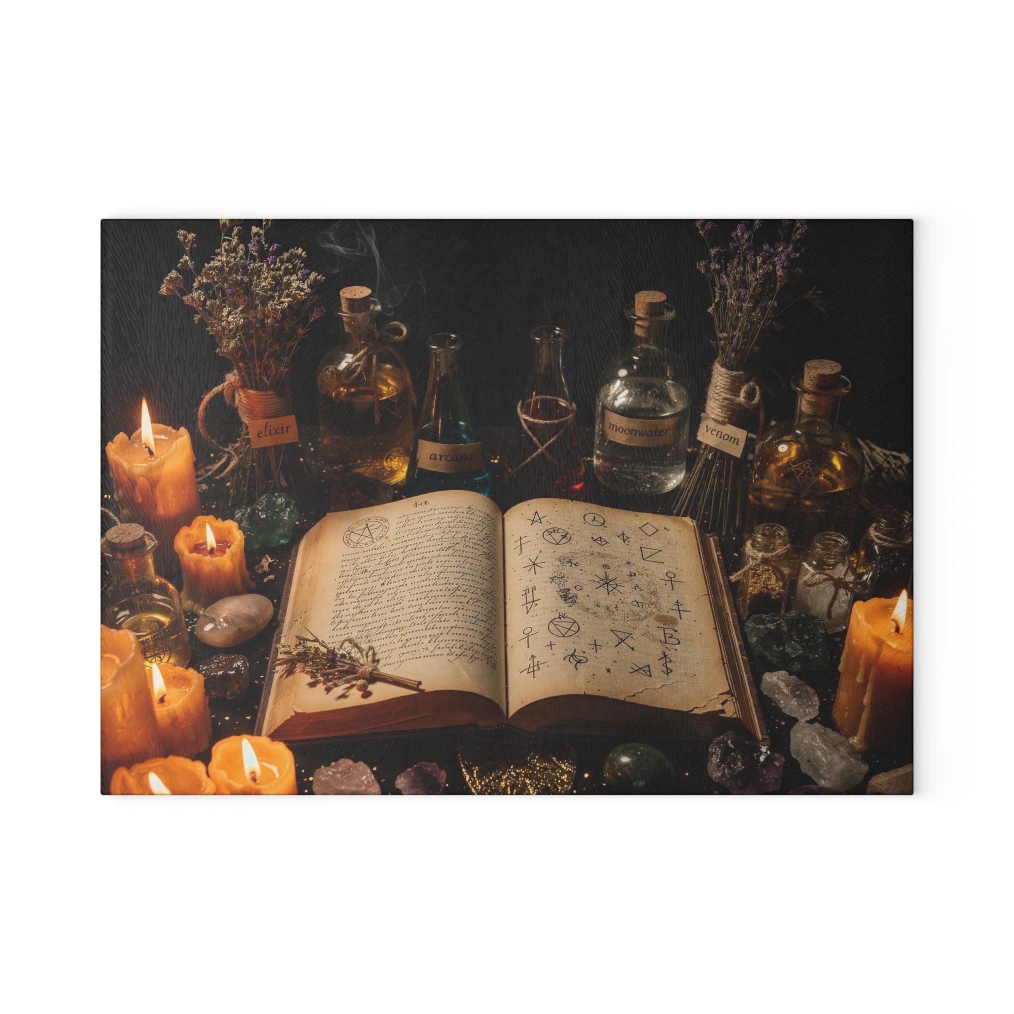 Transform your kitchen into a mystical workspace with this witchy glass cutting board, featuring a dark alchemy setup, glowing candles, potion bottles and an ancient spellbook.